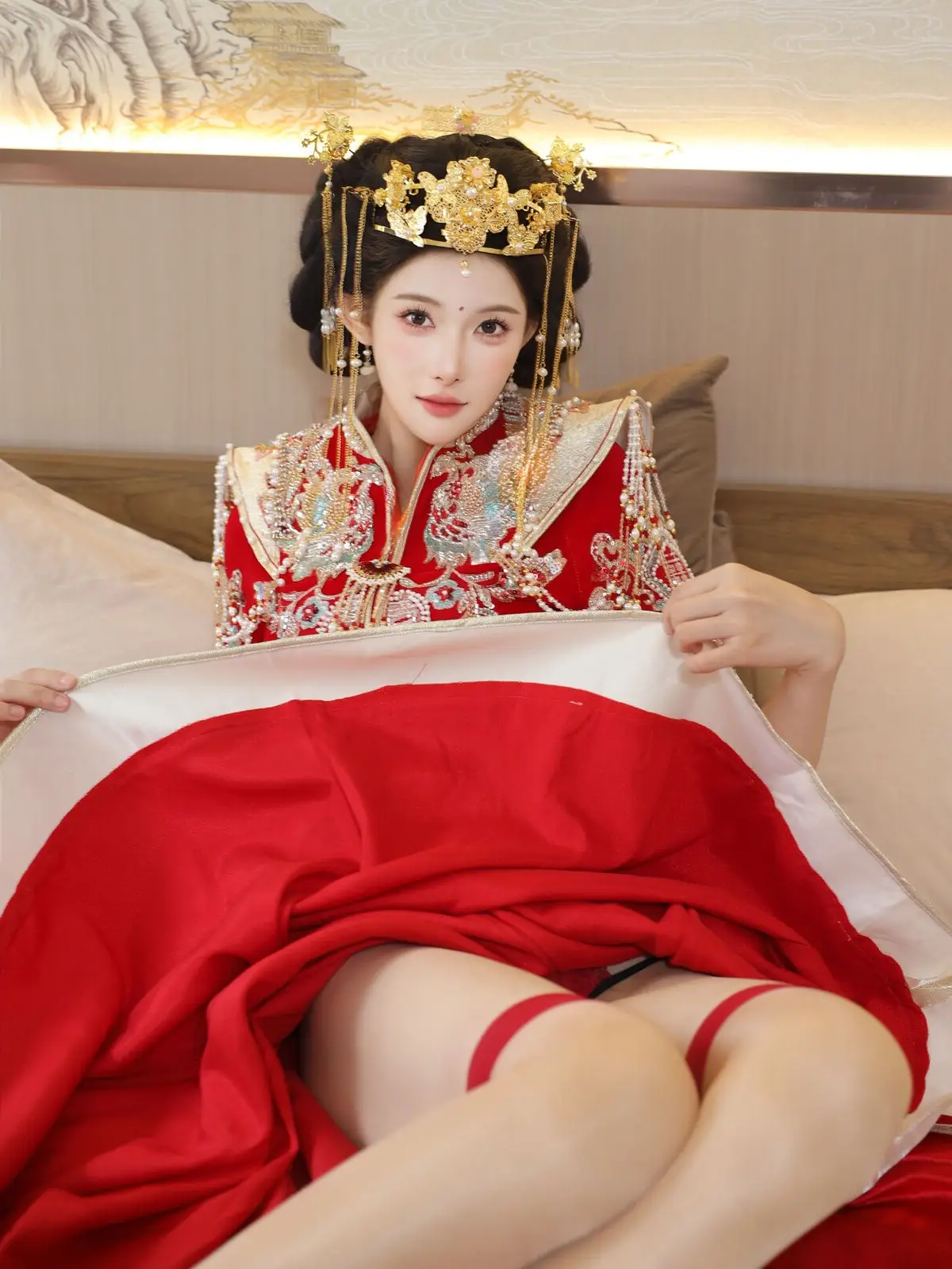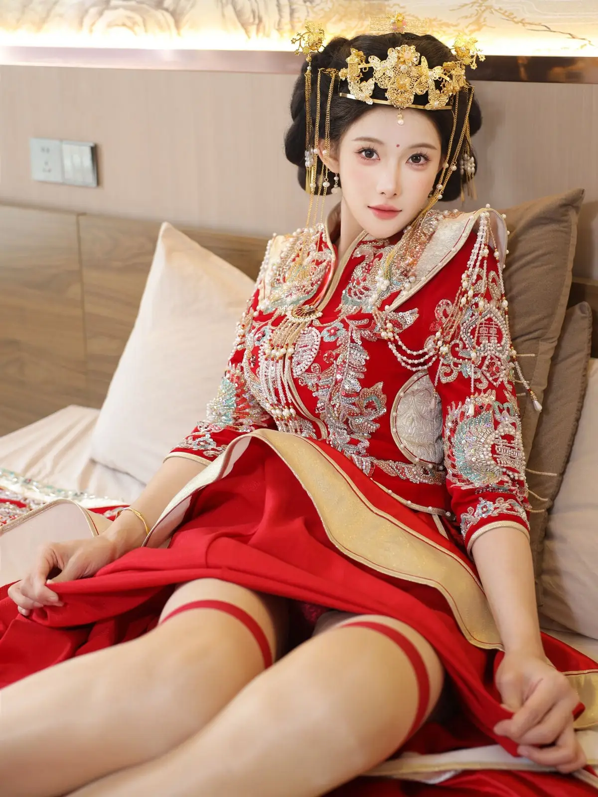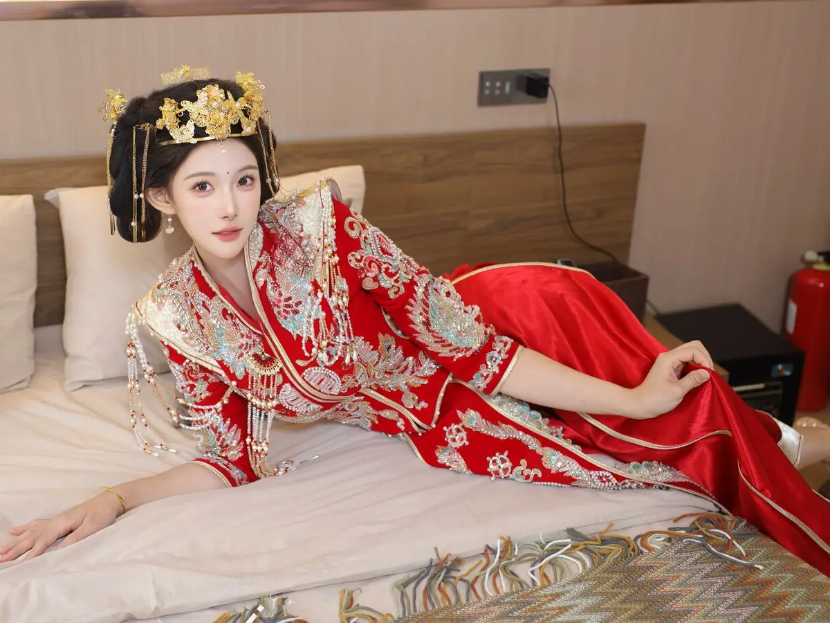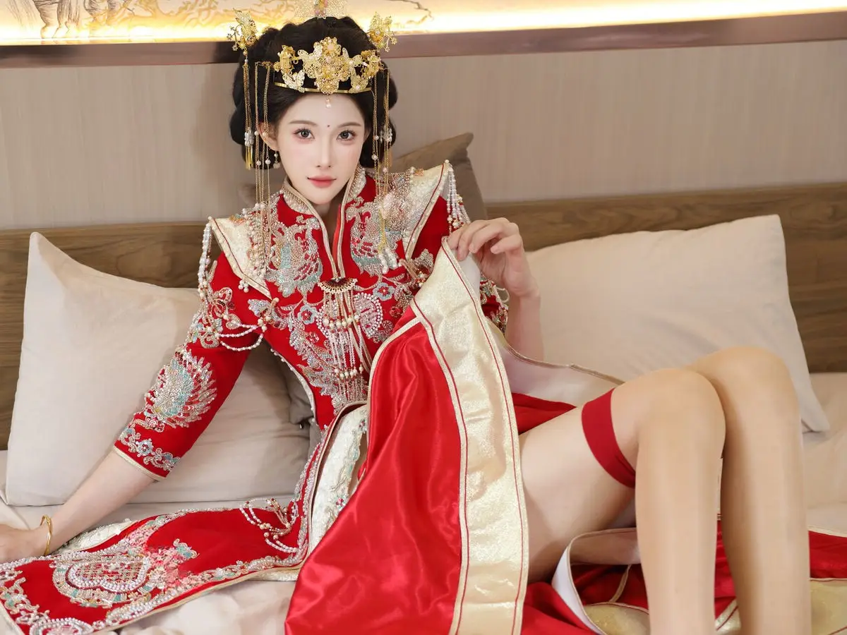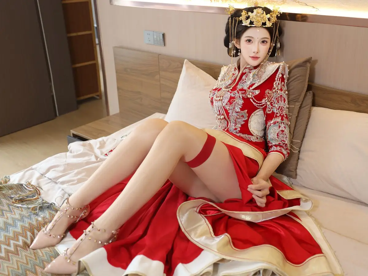 In this captivating image model Li Shuang Er 梨霜儿 commands attention with her elegant and graceful beauty. She is adorned in a traditional Xiùhéfú 秀禾服 a classic Chinese wedding gown meticulously embroidered with intricate details. The vibrant red hue complemented by shimmering gold and silver patterns exudes an aura of luxury and majesty. Her elaborate headpiece and delicate accessories further enhance her regal and sophisticated charm. Li Shuang Er's gentle gaze and serene demeanor beautifully intertwine classic and modern aesthetics. This attire is not merely a garment but a work of art showcasing the meticulous craftsmanship and refined elegance inherent in traditional East Asian culture. This image is part of the XiuRen model Part01 collection