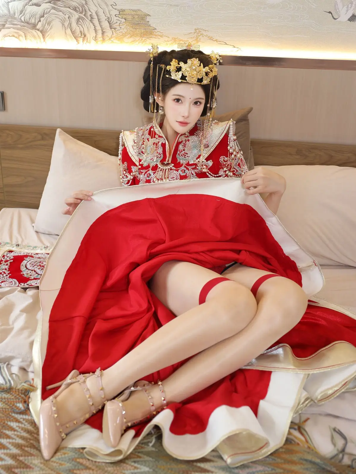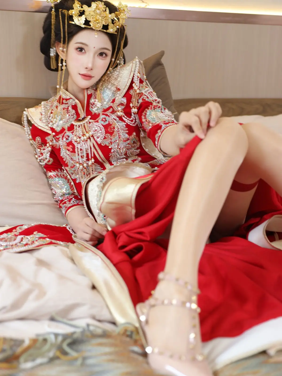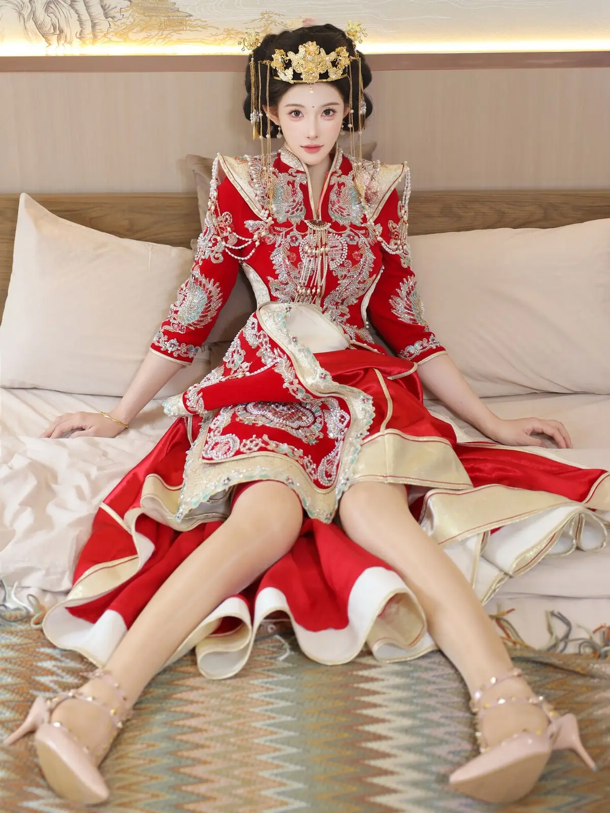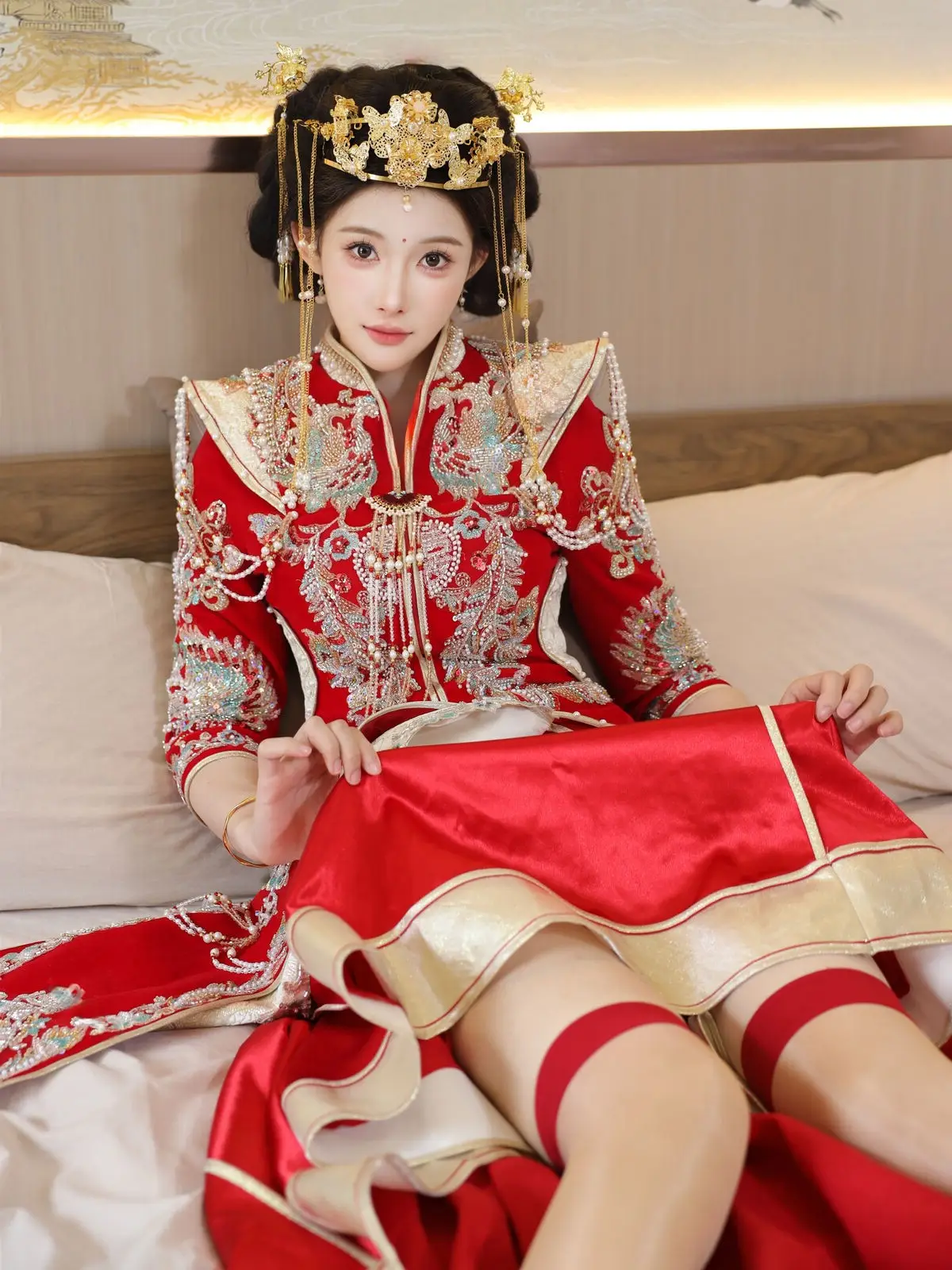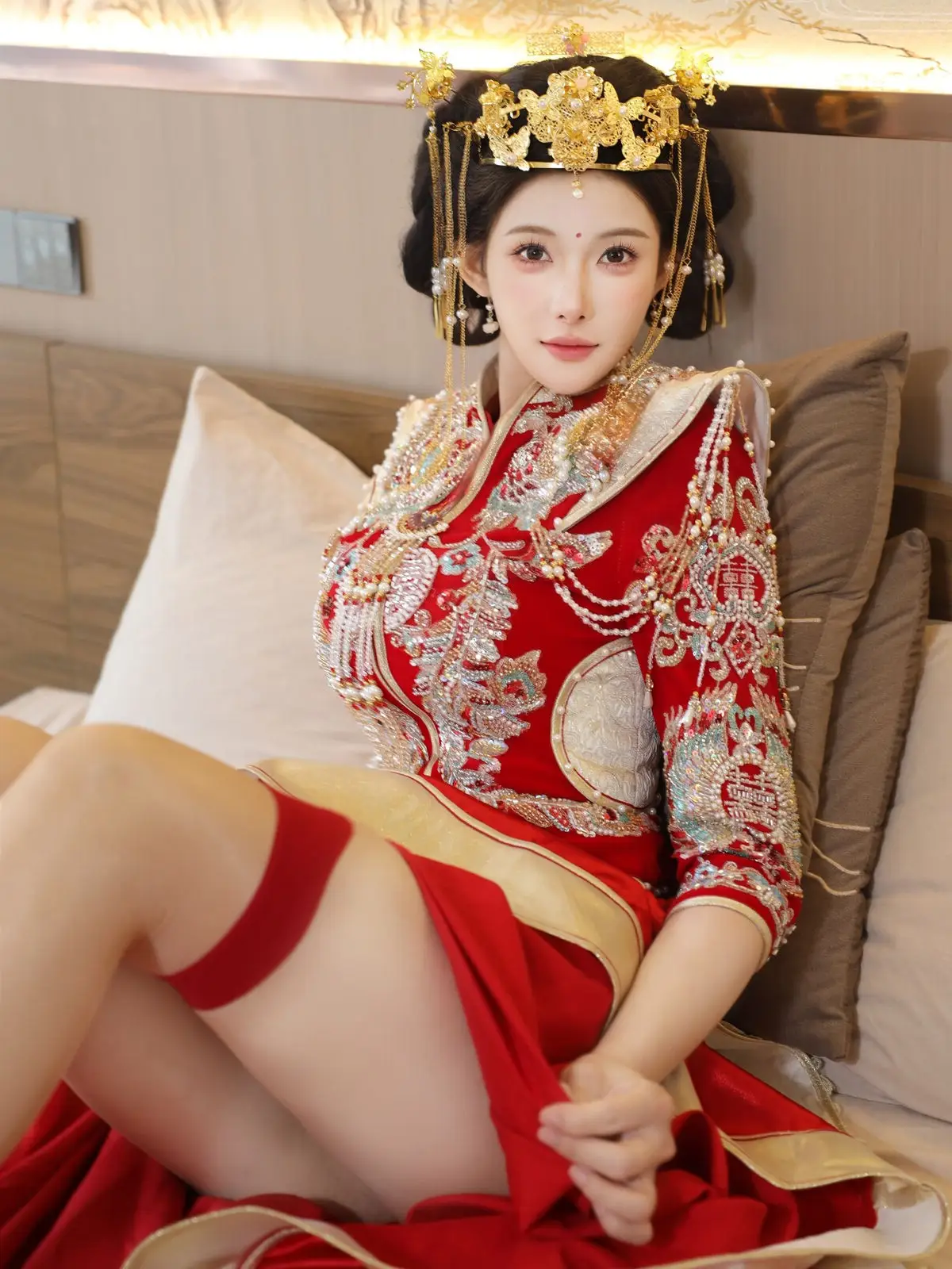 In this captivating image model Li Shuang Er 梨霜儿 commands attention with her elegant and graceful beauty. She is adorned in a traditional Xiùhéfú 秀禾服 a classic Chinese wedding gown meticulously embroidered with intricate details. The vibrant red hue complemented by shimmering gold and silver patterns exudes an aura of luxury and majesty. Her elaborate headpiece and delicate accessories further enhance her regal and sophisticated charm. Li Shuang Er's gentle gaze and serene demeanor beautifully intertwine classic and modern aesthetics. This attire is not merely a garment but a work of art showcasing the meticulous craftsmanship and refined elegance inherent in traditional East Asian culture. This image is part of the XiuRen model Part01 collection