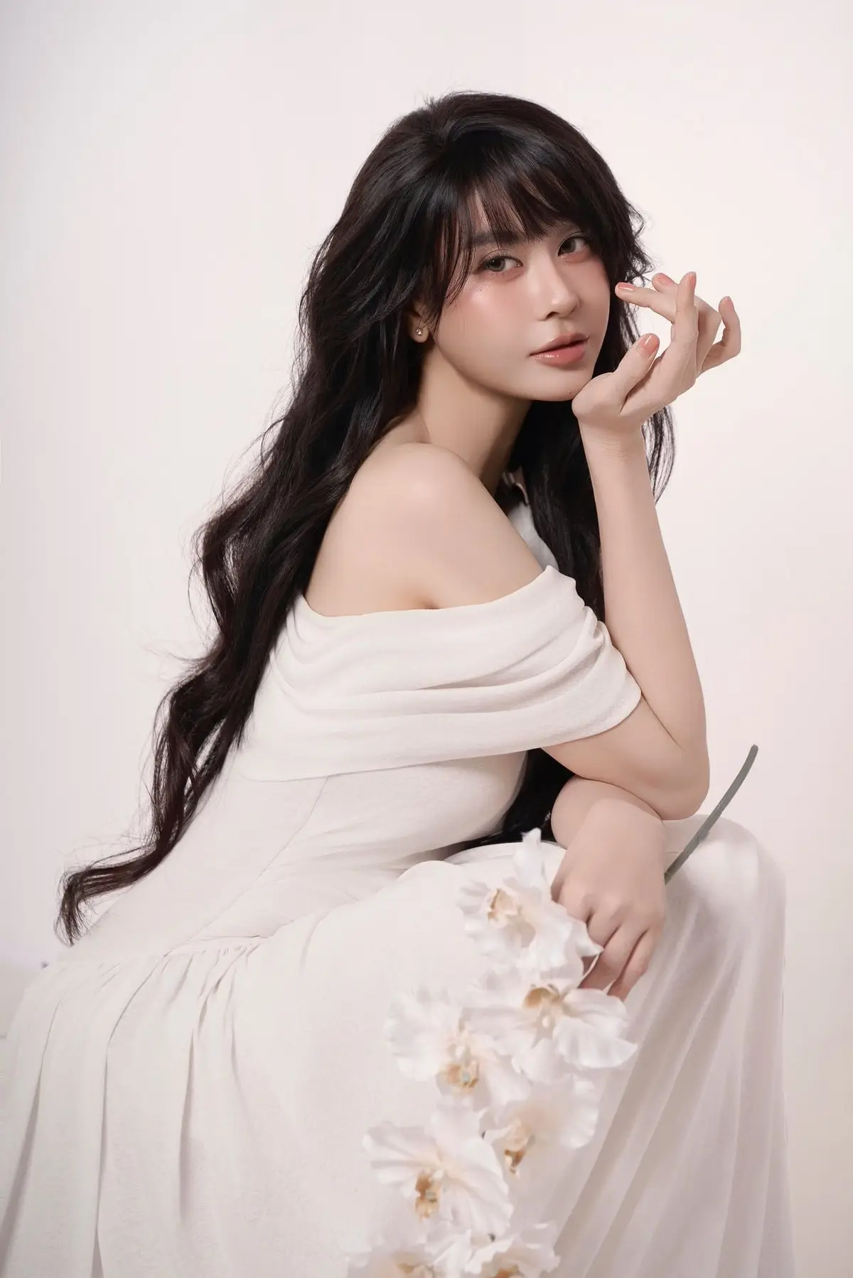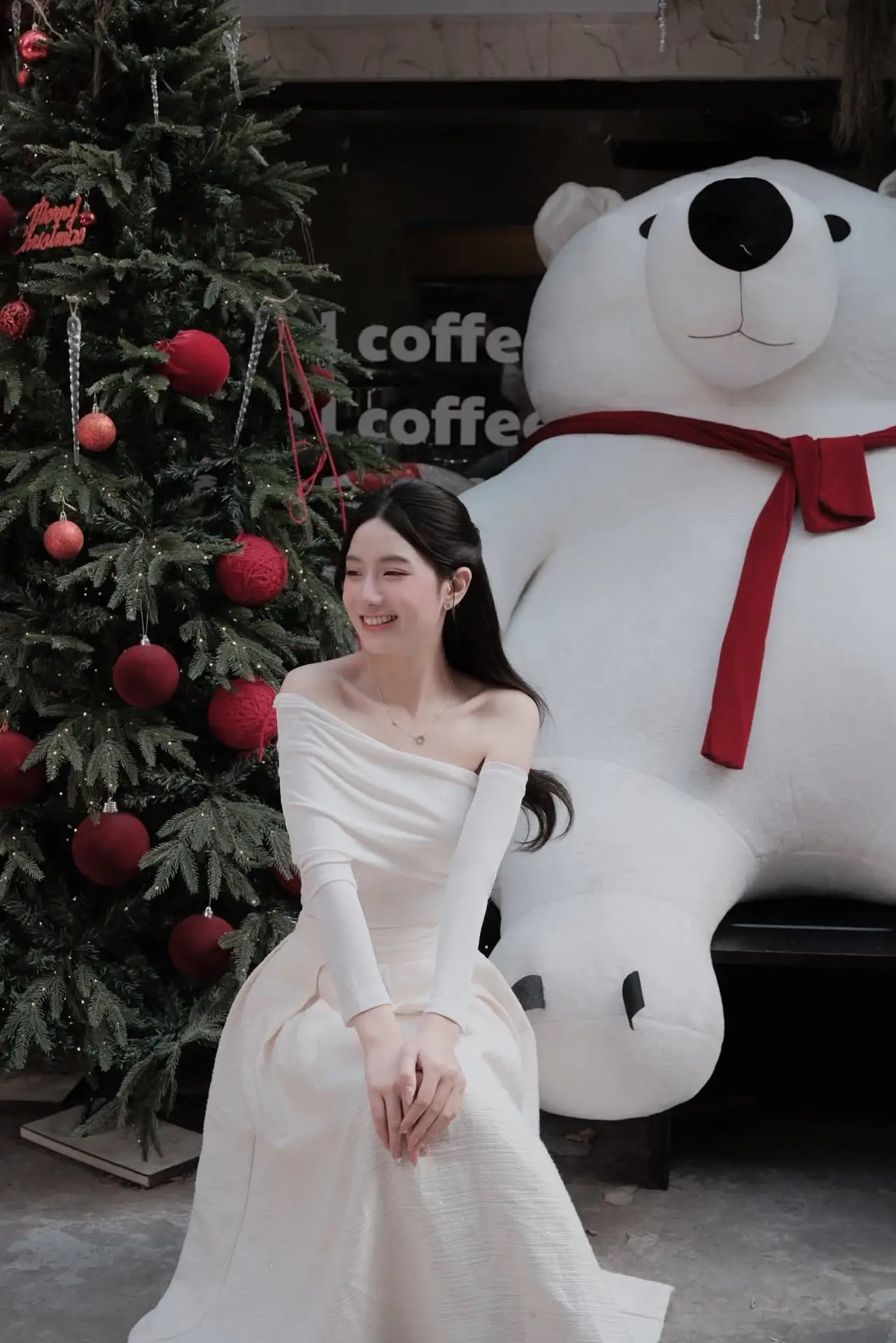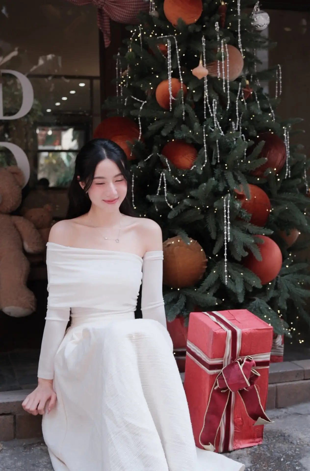 This image captures a beautiful and graceful young woman in an elegant off-shoulder white dress, sitting amidst a space brimming with Christmas cheer. Her gentle smile and fresh eyes perfectly complement the vibrant green of the lavishly decorated Christmas tree and the radiant red gift box. The pristine white maxi dress not only highlights her delicate beauty but also showcases a sophisticated fashion style, ideal for the festive season. The photograph evokes a sense of warmth, serenity, and the joy of welcoming a peaceful and happy Christmas. It's a sweet, poetic moment that offers endless inspiration for those who appreciate beauty and the festive atmosphere.