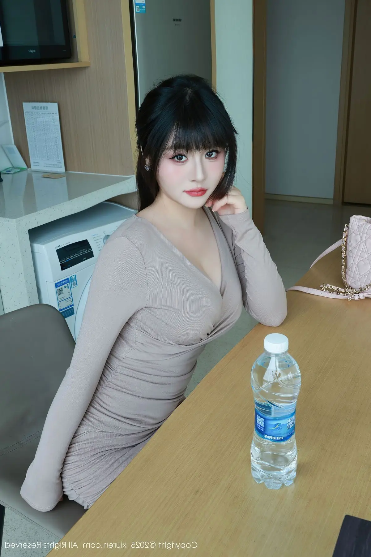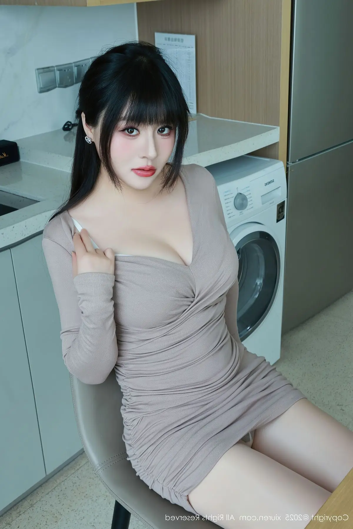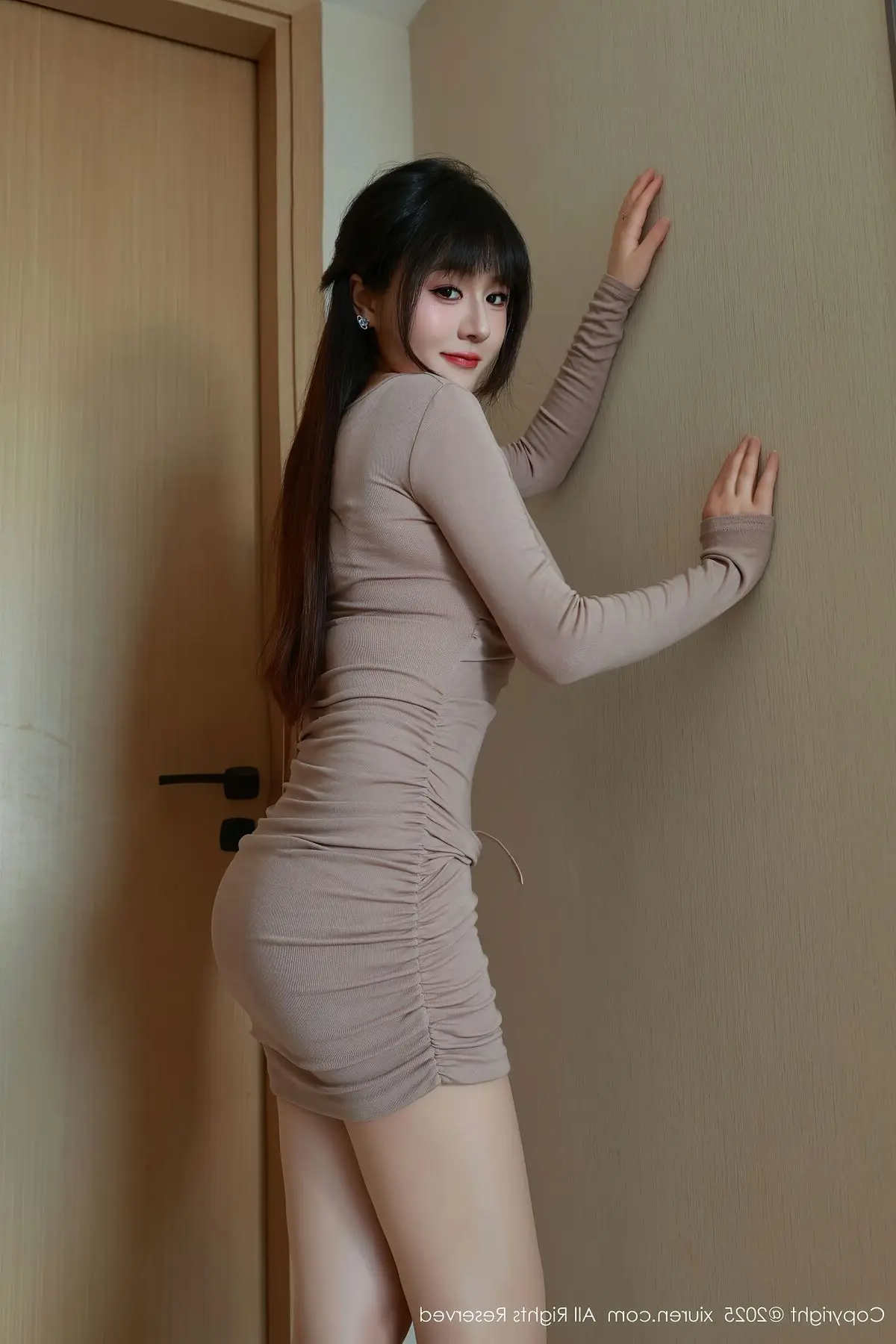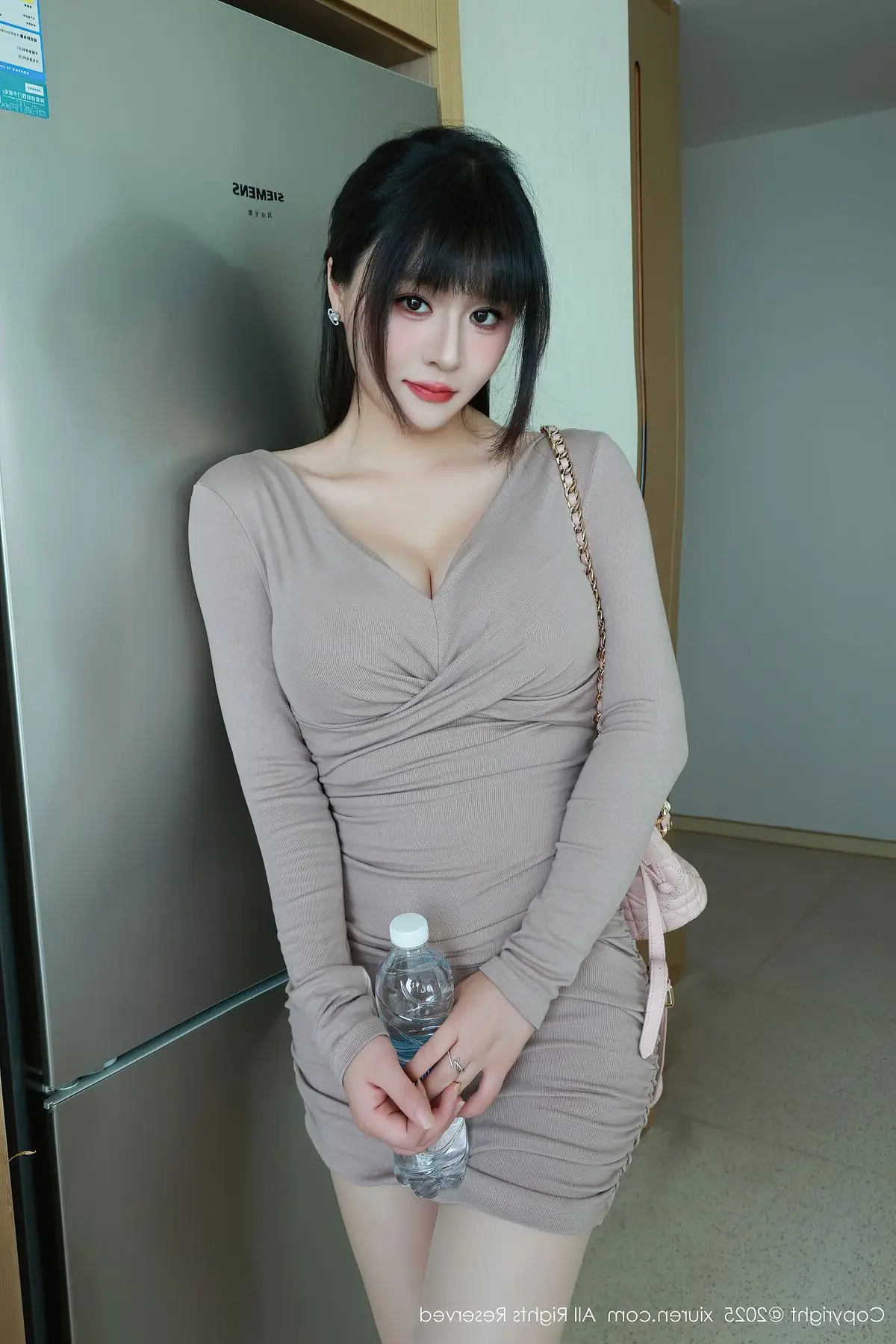 This XiuRen No.10718 photoshoot beautifully captures Shen Nan Xi RuRu's elegant presence and captivating allure. Dressed in a form-fitting nude mini dress she radiates confidence showcasing her slender figure and graceful curves. The sophisticated outfit is perfectly complemented by sheer stockings and classic white high heels creating a harmonious and modern fashion statement. A delicate pink handbag adds a touch of charm completing her polished and chic look. Shen Nan Xi RuRu embodies a blend of sweet innocence and mature sophistication making this collection a true highlight of contemporary style.