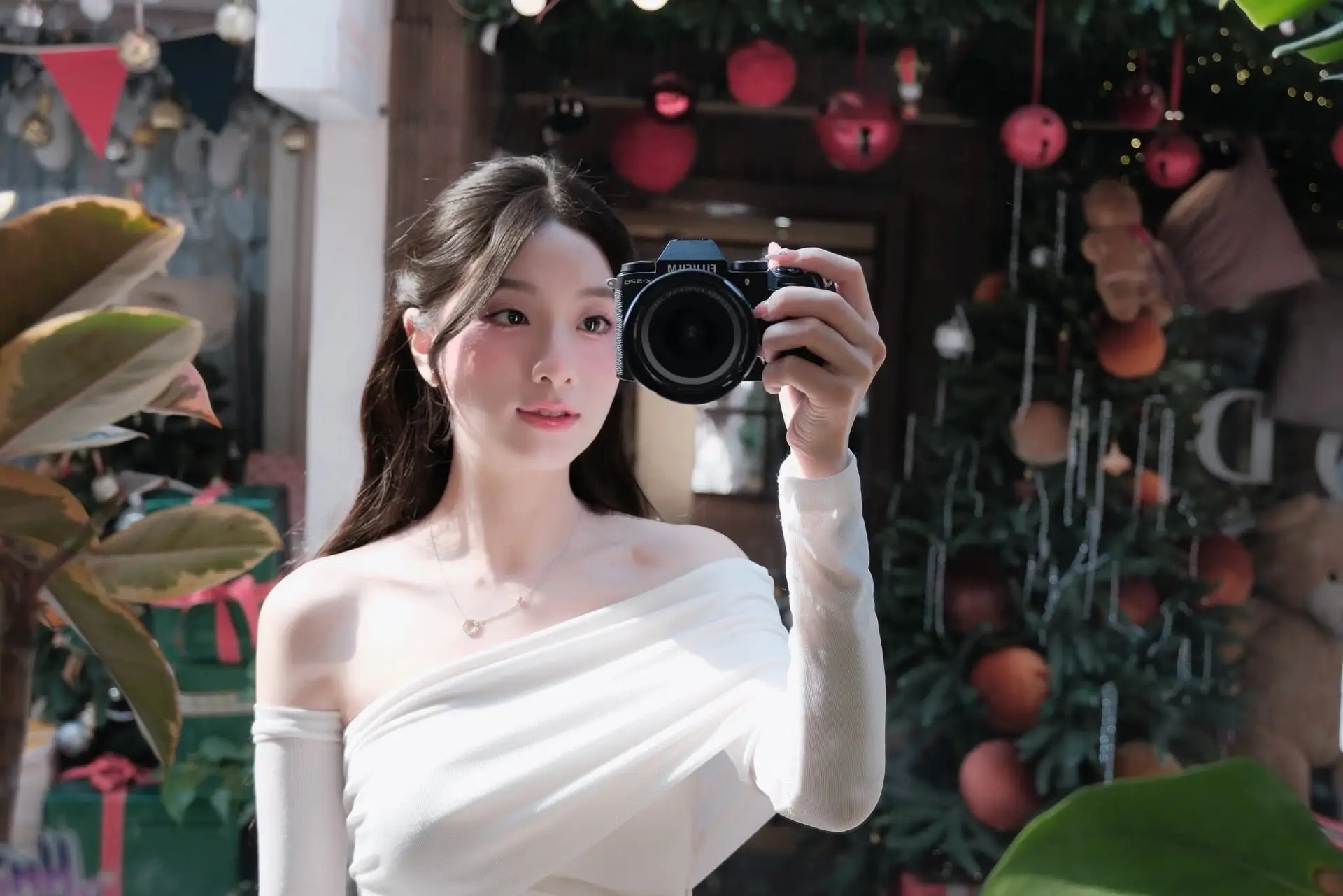 Elegant Girl in Off-Shoulder White Dress Welcoming Christmas, Showcasing Gentle Beauty and Holiday Season Style. 1000027390