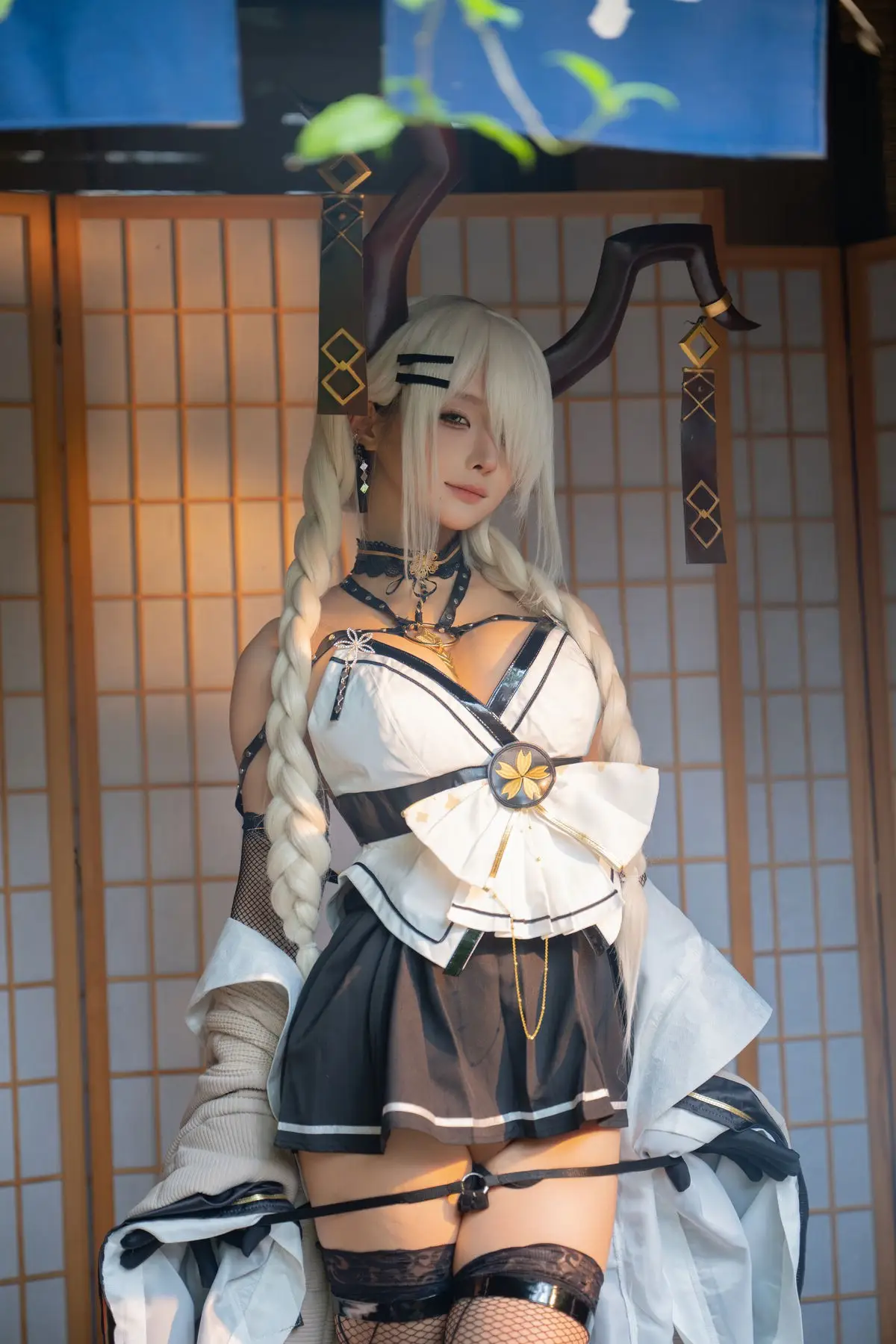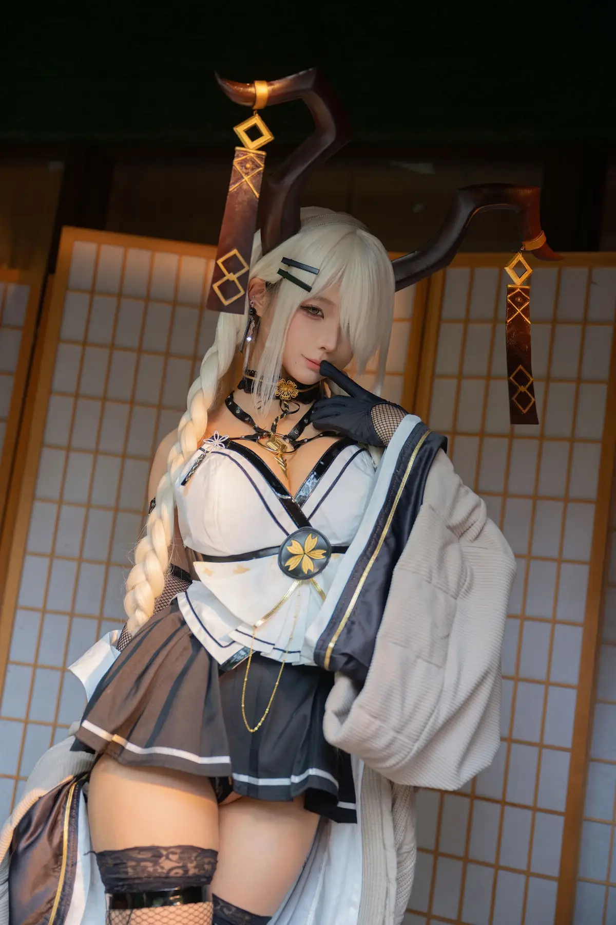 Coser Chunmomo shines brightly in the 尾张 Part03 photoshoot with an enchanting and seductive portrayal. In this image she transforms into a mythical or anime character featuring braided platinum hair, unique horns, and an outfit blending traditional Japanese style with modern flair. The flowing light robe paired with delicate black fishnet stockings accentuates her alluring figure and graceful contours. Her elegantly tilted sitting pose and sharp gaze create an irresistible appeal. The East Asian setting with shoji screens and soft lighting further enhances Chunmomo's mystical and captivating beauty. This is a part of the 尾张 Part03 series promising many more captivating surprises.#Coser #Chunmomo #OwariPart03 #CosplayGirl #AnimeCosplay