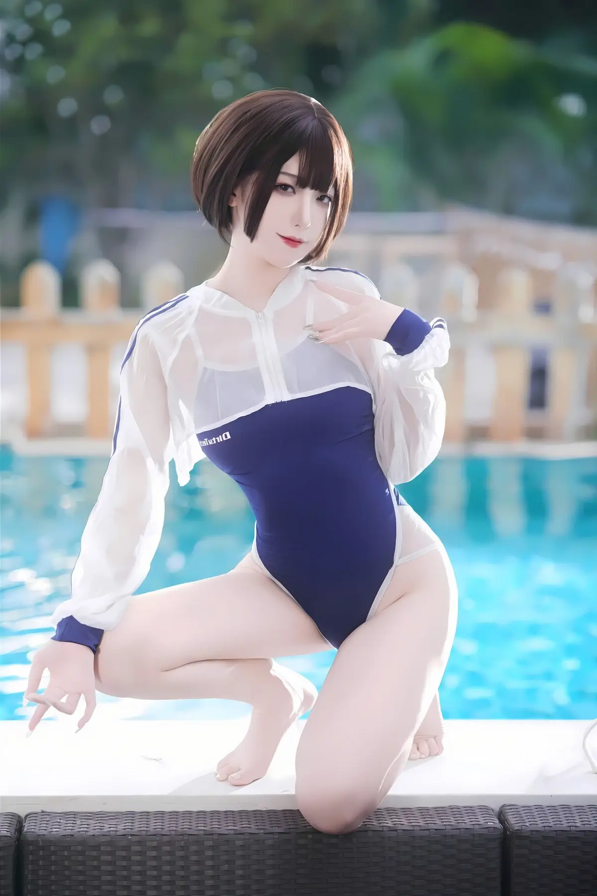 In this captivating image, Coser Feng Jiang Jiang V embodies the character of Xiao Hai Yue, making a strong impression in a striking dark blue racing swimsuit. She poses gracefully by the refreshing blue swimming pool, exuding an elegant and confident beauty. Her neat short hair and captivating gaze highlight her youthful charm. The form-fitting racing swimsuit accentuates her balanced physique and soft contours. The vibrant blue pool setting creates a harmonious and lively frame. Viewers can easily appreciate the professionalism in every detail of the cosplay, as well as the alluring aura of Feng Jiang Jiang V.#Coser #RacingSwimsuit #SwimwearFashion #CosplayGirl #FengJiangJiangV