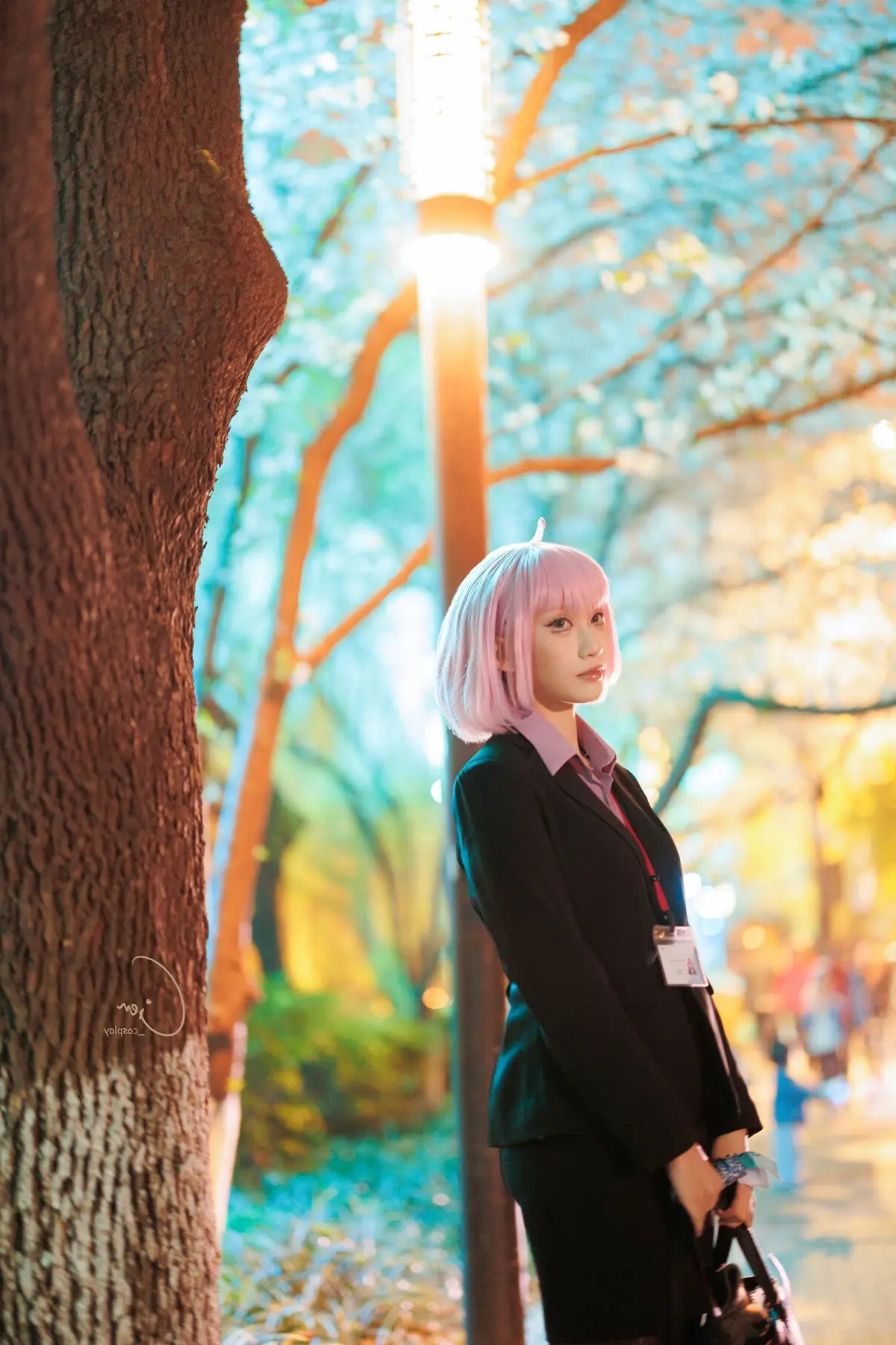 Coser Cien HamanOL: Captivating Pink-Haired Office Lady Cosplay by the City Lights
