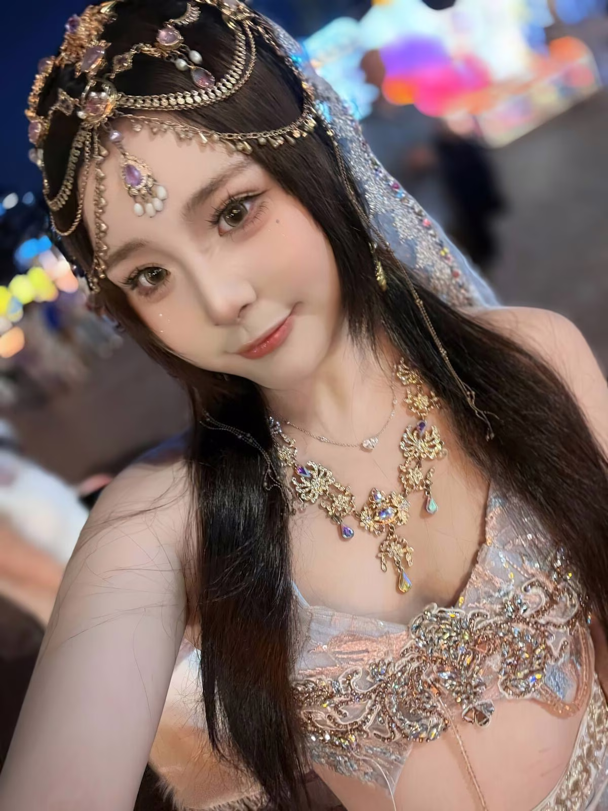 This stunning image showcases Coser luobao1221洛宝 embodying an enchanting fantasy persona. She radiates magnificent beauty adorned in an exquisite jeweled headpiece and an intricately designed necklace. The ornate costume meticulously crafted highlights her elegance and allure. With long dark hair and sophisticated makeup luobao1221洛宝 perfectly transforms into her character. The blurred background with shimmering lights further enhances the mystical and dreamlike atmosphere of the photograph. This is a high quality artistic work demonstrating the elaborate effort and talent of the Coser.