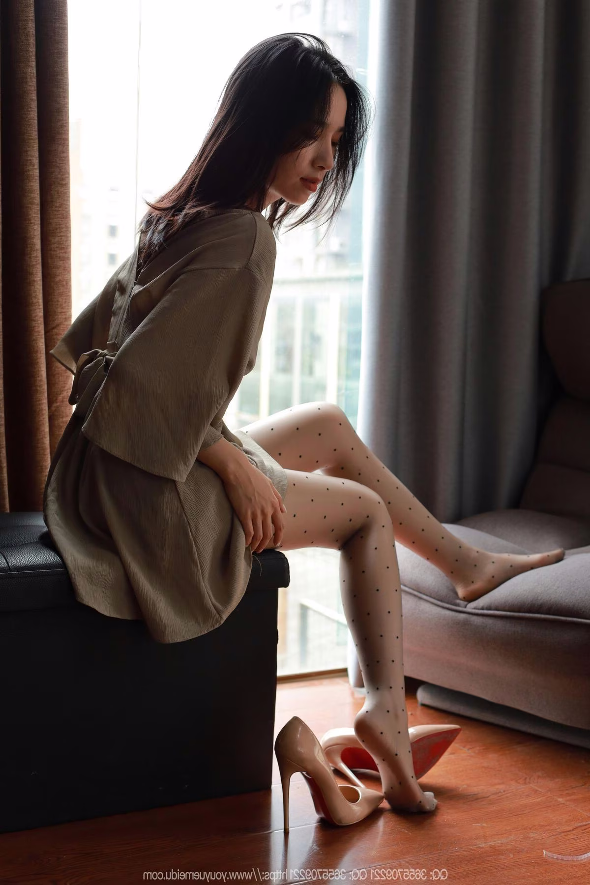 This captivating image captures a poignant moment of model Mei Zi from the IESS SXJ No.2061 collection. The Chinese model exudes an elegant and graceful charm, seated thoughtfully with a pensive gaze. Her light beige dress beautifully complements the unique polka dot stockings, highlighting her slender figure and sophisticated fashion sense. Every detail, from her smooth dark hair to her delicate feet, contributes to a perfect portrayal of understated allure. Viewers are easily drawn into Mei Zi's captivating aura and the subtle emotions conveyed through her expression and posture, offering an artistic and visually engaging experience.