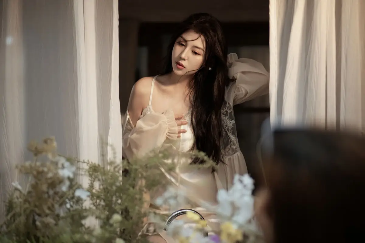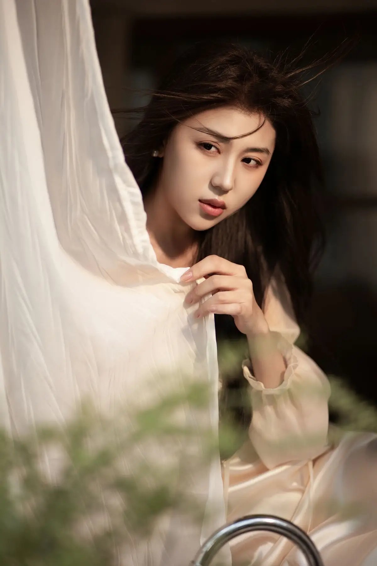 Discover the captivating allure of model Xiao Ba Le in the XiuRen No10609 collection. She is elegantly portrayed in a sheer white nightgown, its delicate fabric subtly enhancing her natural grace and charm. Every detail, from the soft cowl neck of the dress to the pristine white thigh-high stockings, contributes to an image that is both sensual and sophisticated. The gentle lighting of the intimate indoor setting accentuates Xiao Ba Le's radiant skin and lustrous dark hair. This portrayal perfectly blends oriental elegance with modern lingerie fashion, offering a visually stunning and memorable experience for viewers.#XiaoBaLe #XiuRen #WhiteNightgown #SensualBeauty #LingerieFashion