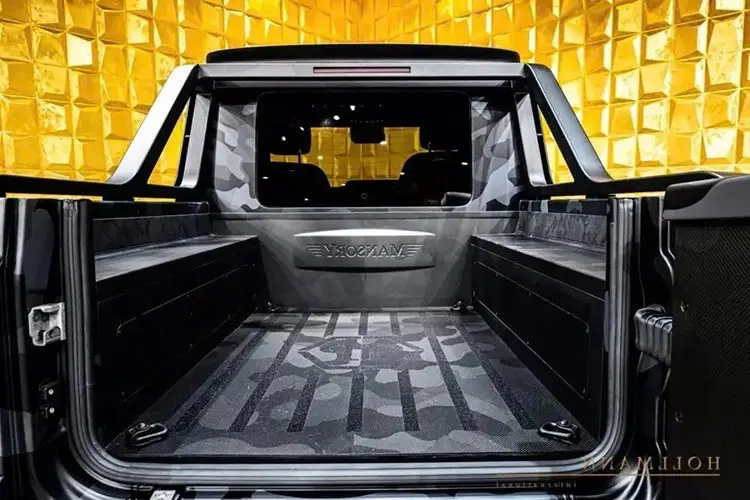 This Mercedes-AMG G63 super pickup is not just a unique high-ground clearance vehicle with an impressive two-door design, but also a symbol of ultimate luxury. Valued at millions of dollars, it proudly stands alongside the world's most expensive hypercars. The spacious, meticulously lined cargo bed in the image demonstrates a perfect blend of utility and class. This is truly a special Star Trooper Pickup edition, a masterpiece of engineering and design, captivating every gaze. This vehicle redefines the concept of a pickup truck, offering an unparalleled driving and ownership experience for those seeking distinction and supreme luxury.