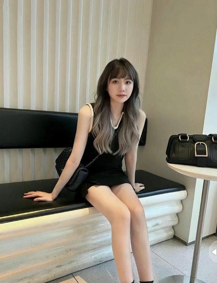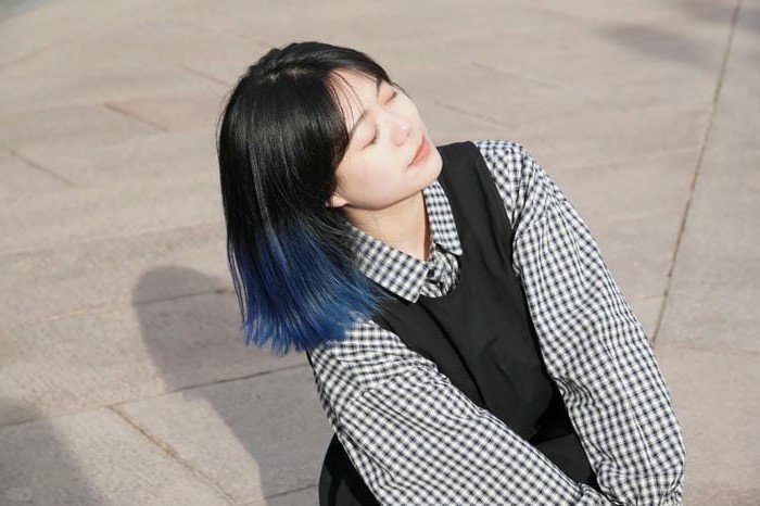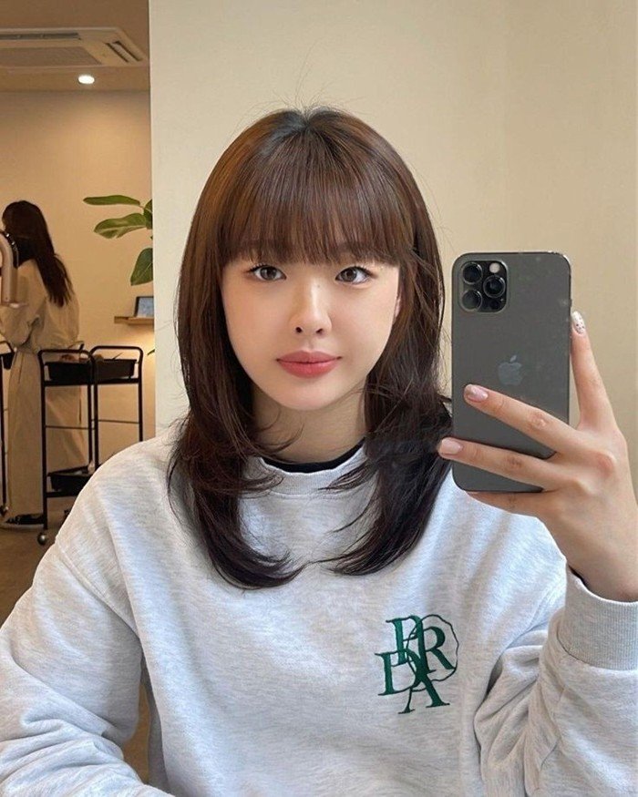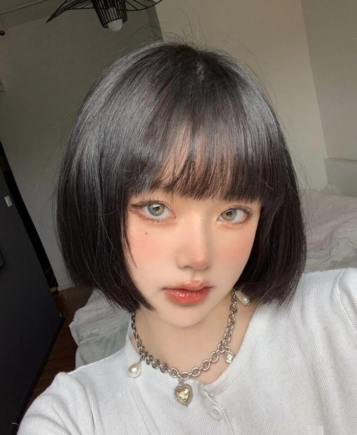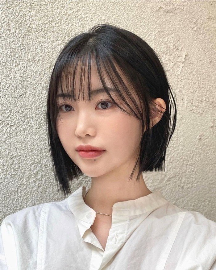 This portrait captures a youthful girl with sleek, short black hair, prominently featuring a neatly trimmed blunt fringe. This blunt bangs style frames her forehead, accentuating her delicate face and large, round eyes, creating a look that is both innocent and captivating. Combined with a modern bob haircut, these short blunt bangs exude a dynamic, youthful, and highly individualistic charm. It's an excellent choice for those who love innovation and wish to express confidence and uniqueness through their hairstyle. This image showcases the undeniable appeal of blunt bangs, especially when paired with short hair, offering a fresh and adorable appearance that aligns with current hair fashion trends. This blunt fringe style not only makes you look younger but also serves as a distinctive highlight for your personal style.