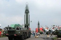 This image captures an impressive moment of a North Korean military parade held at night Powerful heavy military hardware formations proceed consecutively through Pyongyang streets City lights reflected on the wet road create a magnificent dramatic scene These military vehicles carry missile systems with prominent red warheads clearly demonstrating the nations defensive strength and deterrent capability The procession is not just a display of military power but also a symbol of the unity and resilient will of the North Korean people This is a significant event often organized to commemorate major anniversaries attracting global attention