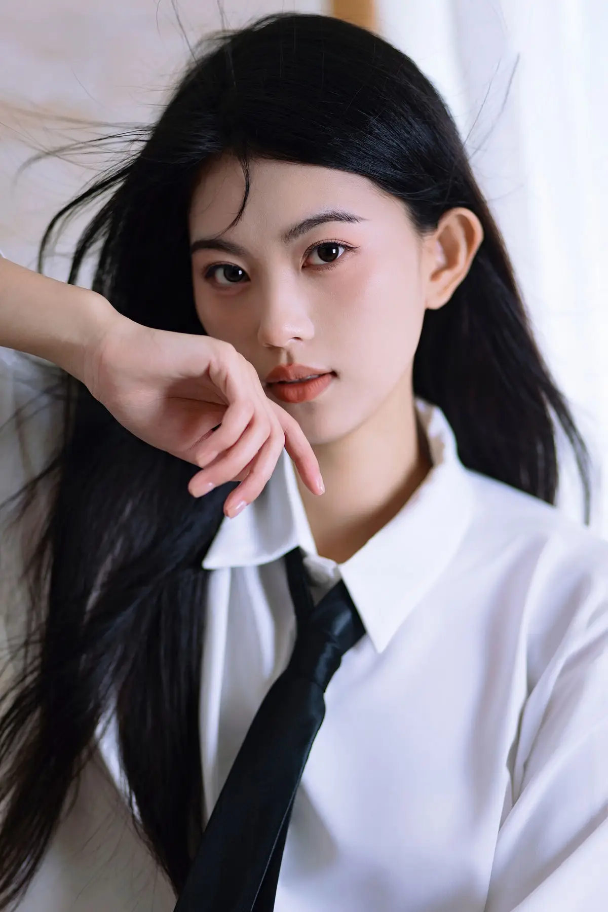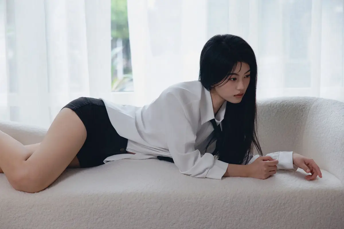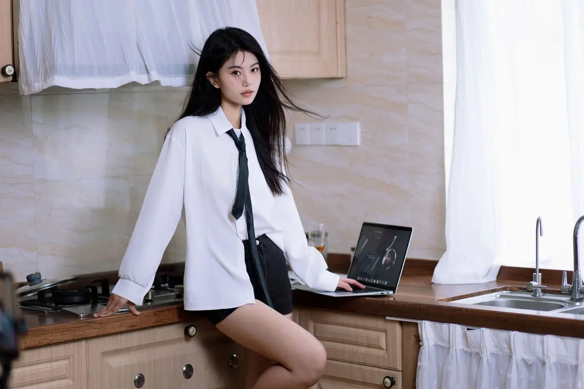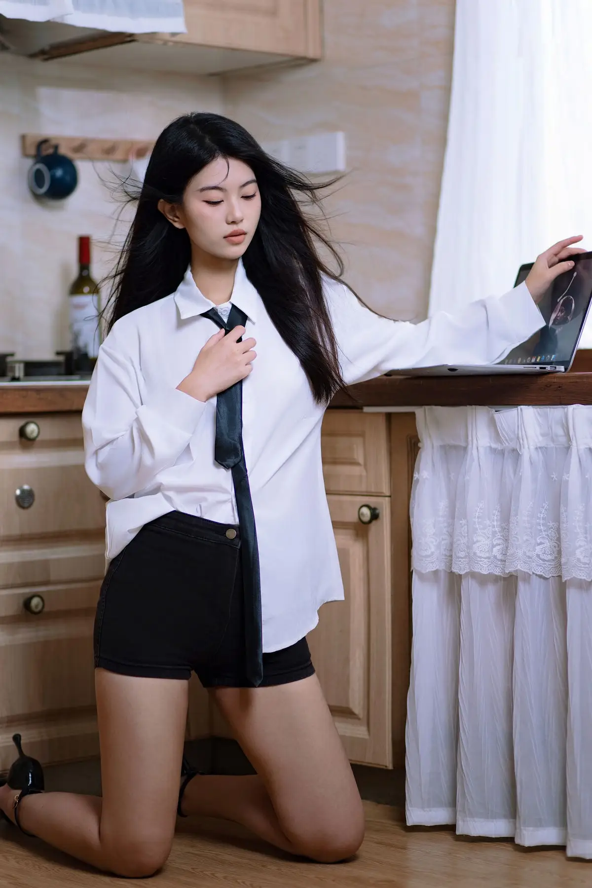 Model Dan Dan (单单) captivates viewers with her natural beauty and confident demeanor in the YiTuYu Vol. 8582 collection. Her long flowing black hair perfectly complements the elegant oversized white shirt, uniquely styled with a black tie, and chic black shorts. Posing casually next to a laptop in a cozy indoor setting, Dan Dan exudes a distinct blend of grace and modern allure. This photoshoot beautifully highlights her authentic charm and sophisticated personal style, inviting admiration for her captivating presence and the collection's artistic vision.#DanDan #YiTuYu #NaturalBeauty #CasualChic #ModelLife