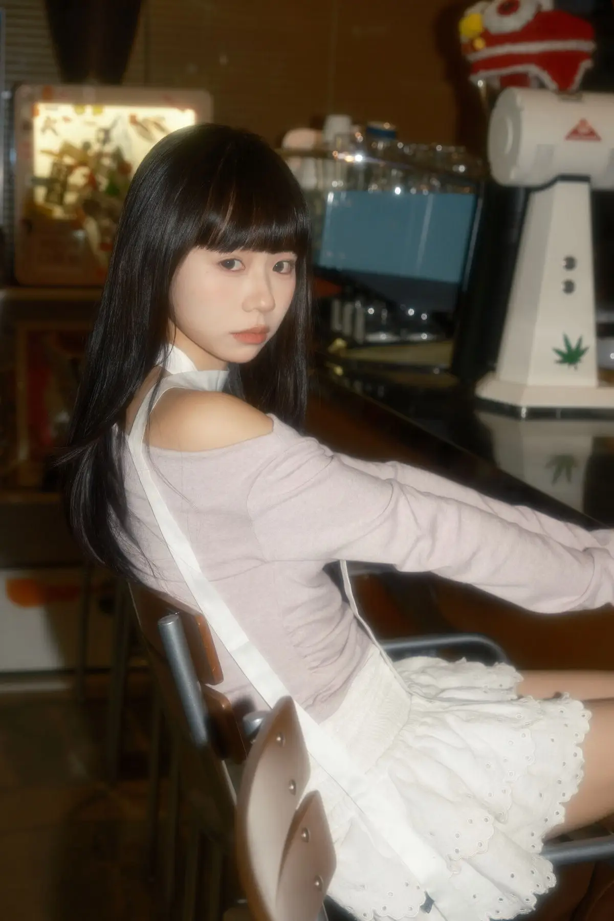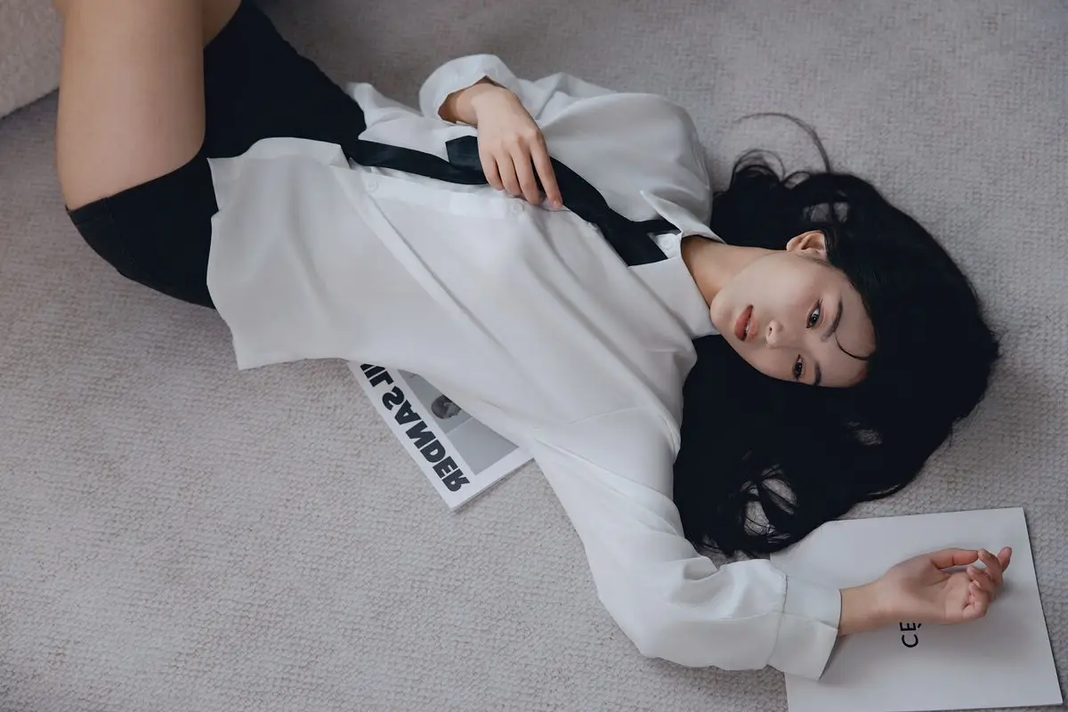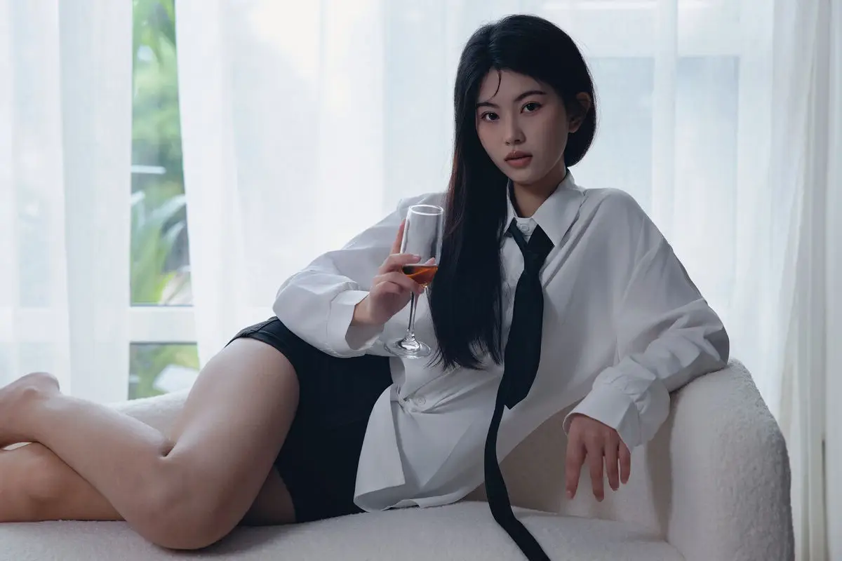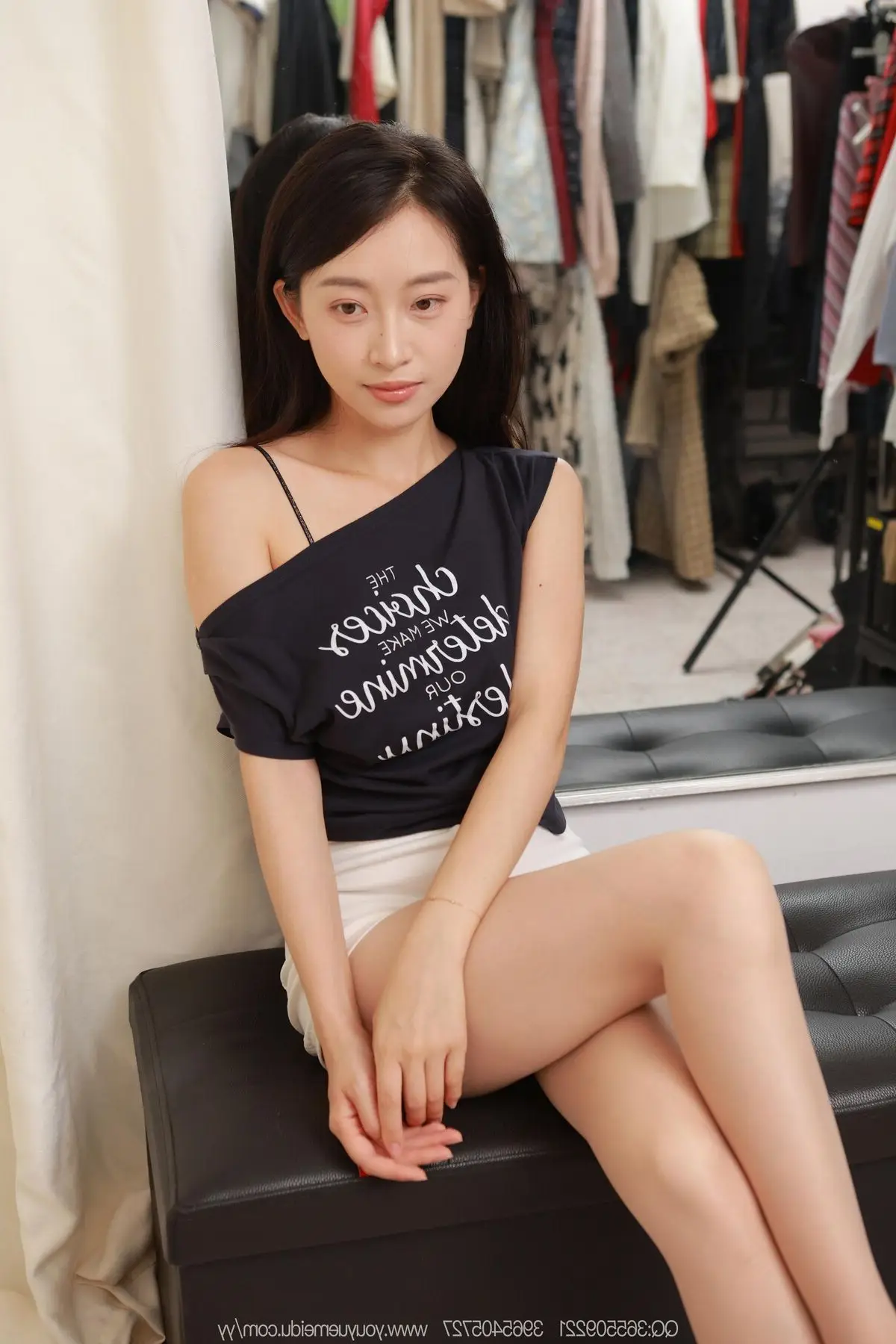 Model Dan Dan (单单) captivates viewers with her natural beauty and confident demeanor in the YiTuYu Vol. 8582 collection. Her long flowing black hair perfectly complements the elegant oversized white shirt, uniquely styled with a black tie, and chic black shorts. Posing casually next to a laptop in a cozy indoor setting, Dan Dan exudes a distinct blend of grace and modern allure. This photoshoot beautifully highlights her authentic charm and sophisticated personal style, inviting admiration for her captivating presence and the collection's artistic vision.#DanDan #YiTuYu #NaturalBeauty #CasualChic #ModelLife