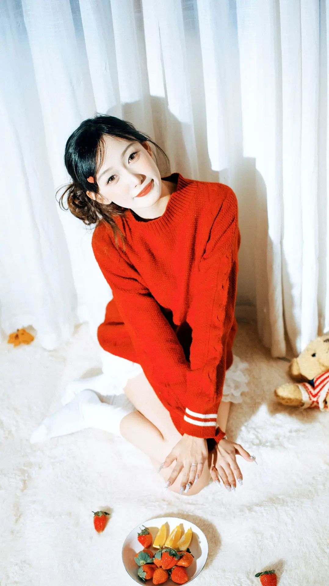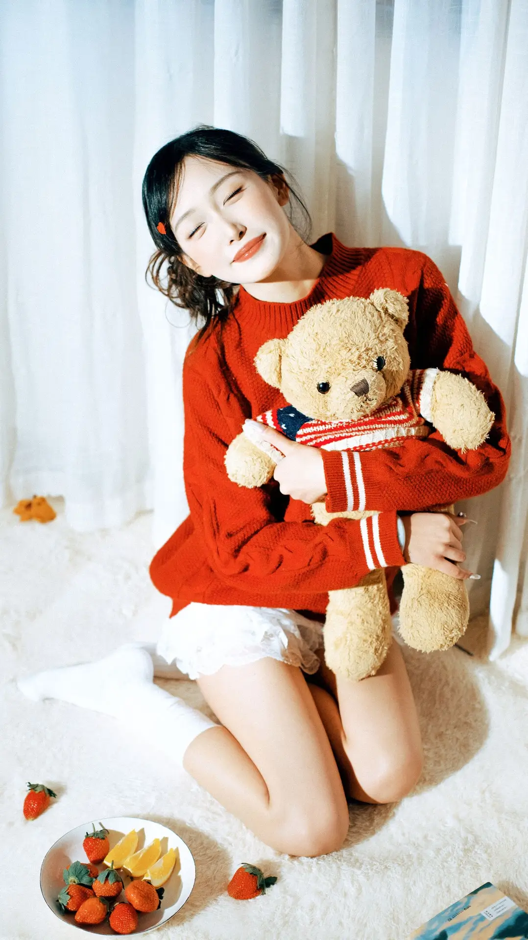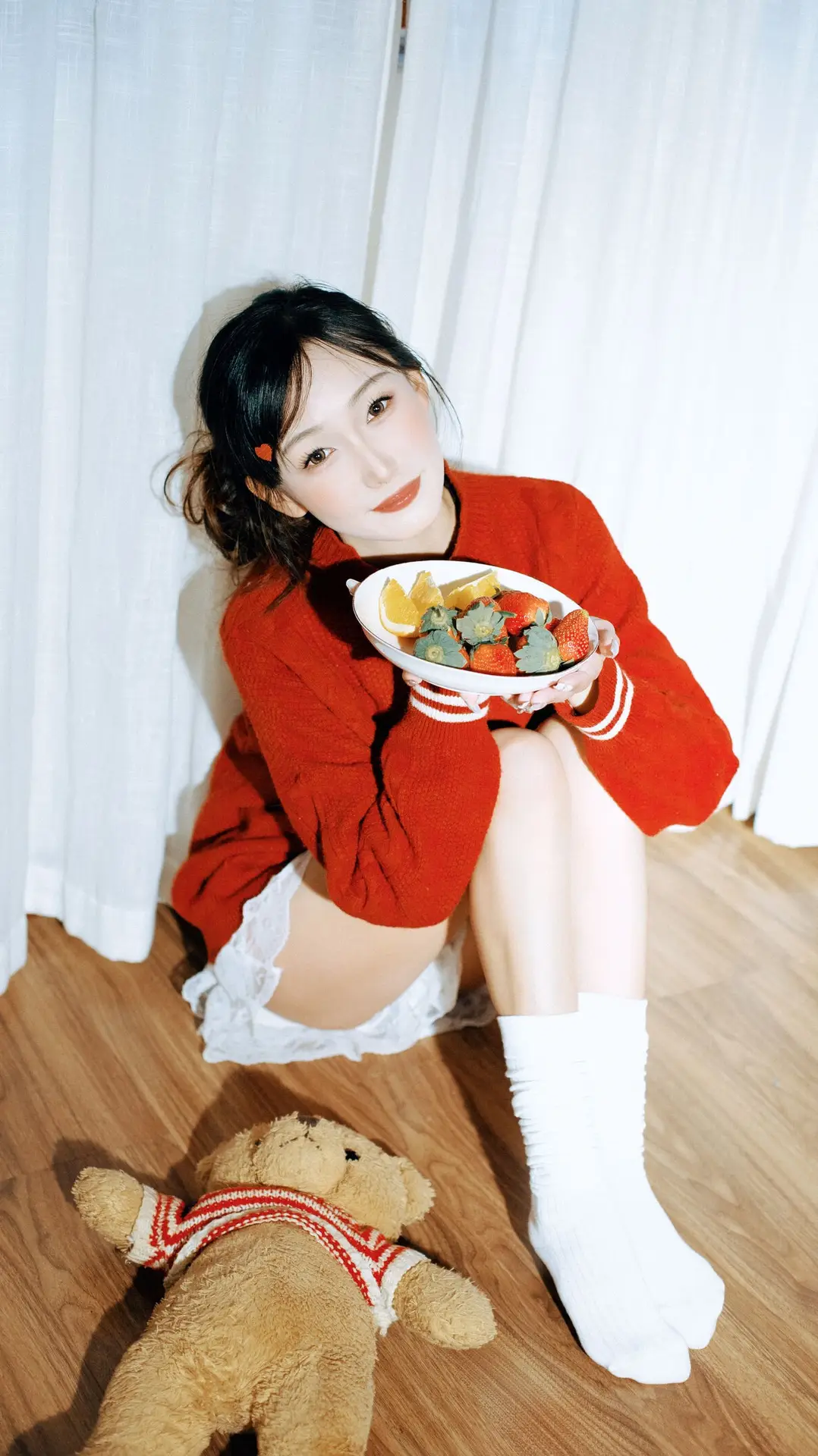 In the cozy and softly lit ambiance of YiTuYu Vol.8573 zzzzzzz a young woman emerges with an elegant and natural beauty. Sitting comfortably on the rustic wooden floor she gently holds a colorful bowl of fruits seemingly savoring her own peaceful moment. Her striking red sweater and white socks convey a sense of warmth and approachability. Beside her a charming little teddy bear adds a touch of cuteness and innocence to the scene. This image is ideal for those who appreciate a gentle lifestyle and heartfelt everyday moments. The photograph not only captures relaxation but also evokes a pure sweetness that draws every gaze. Discover this pristine beauty.#YiTuYu #RelaxedGirl #SweetMoment #CozyVibes #NaturalBeauty