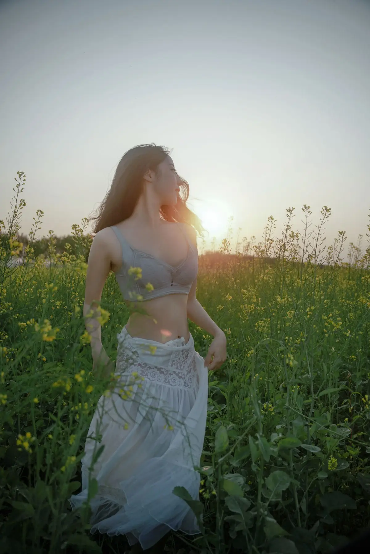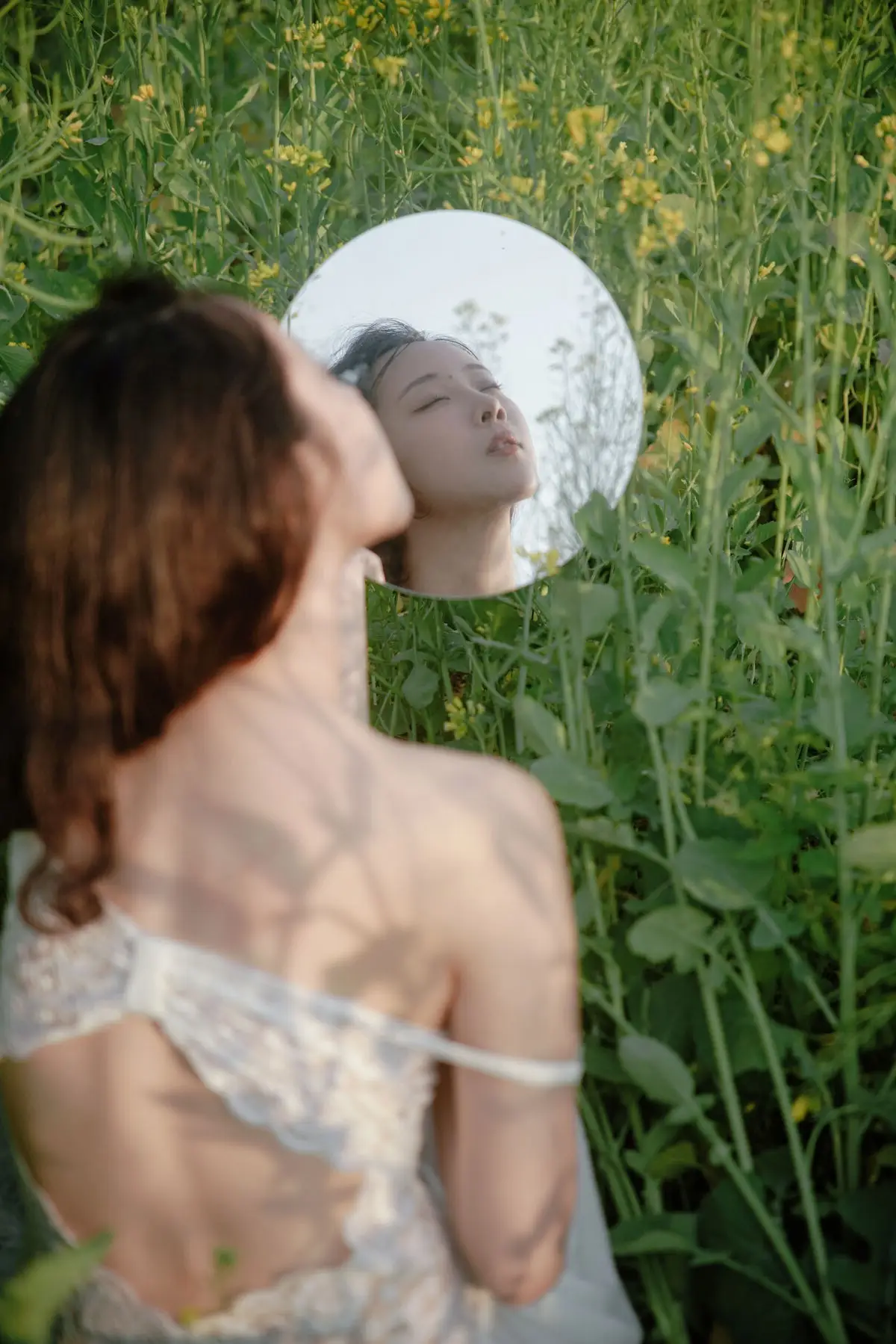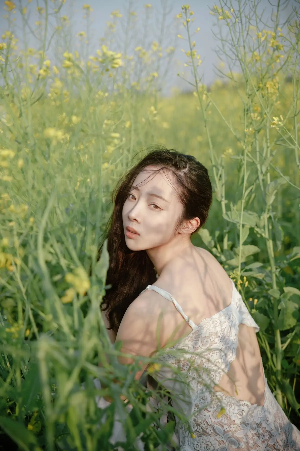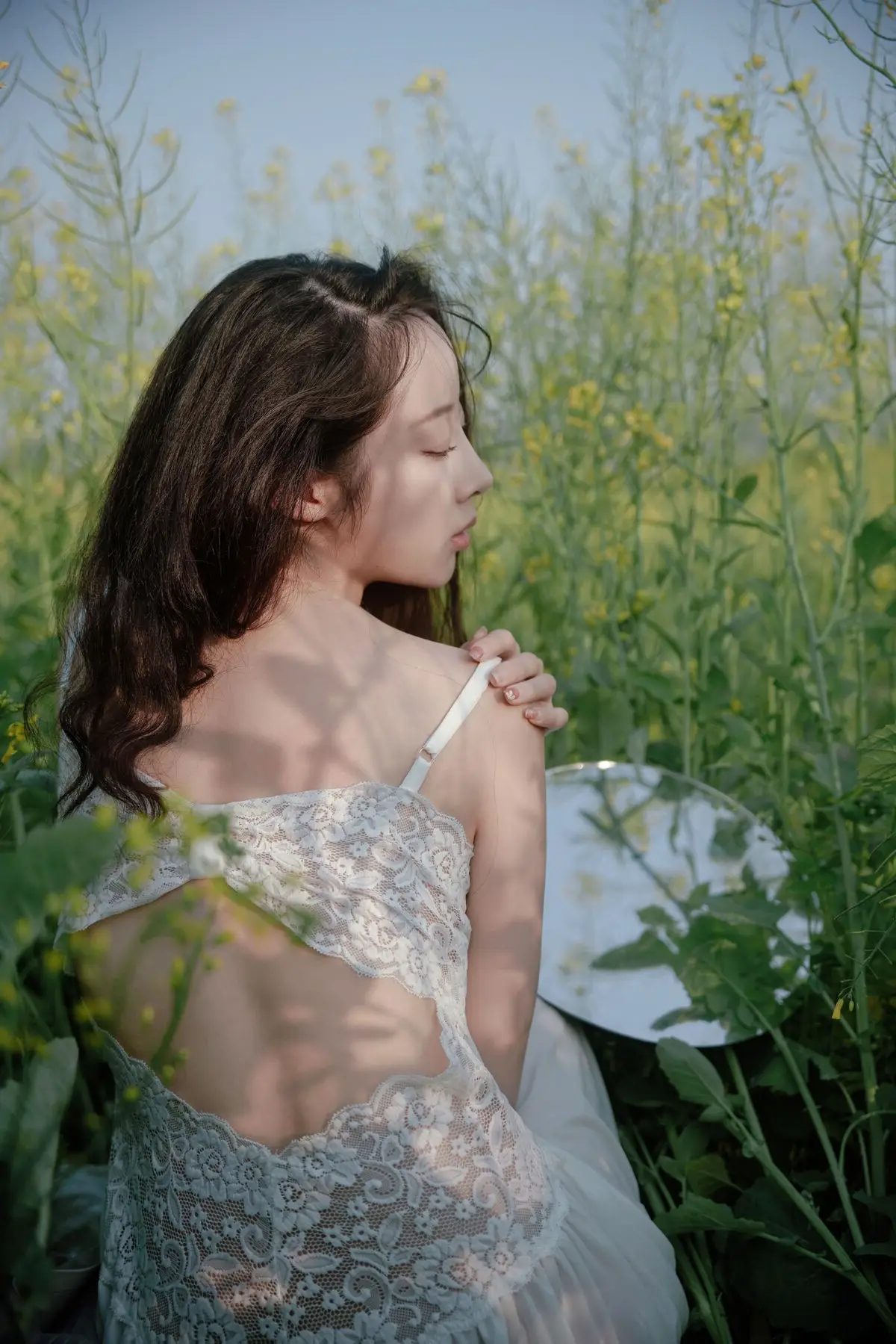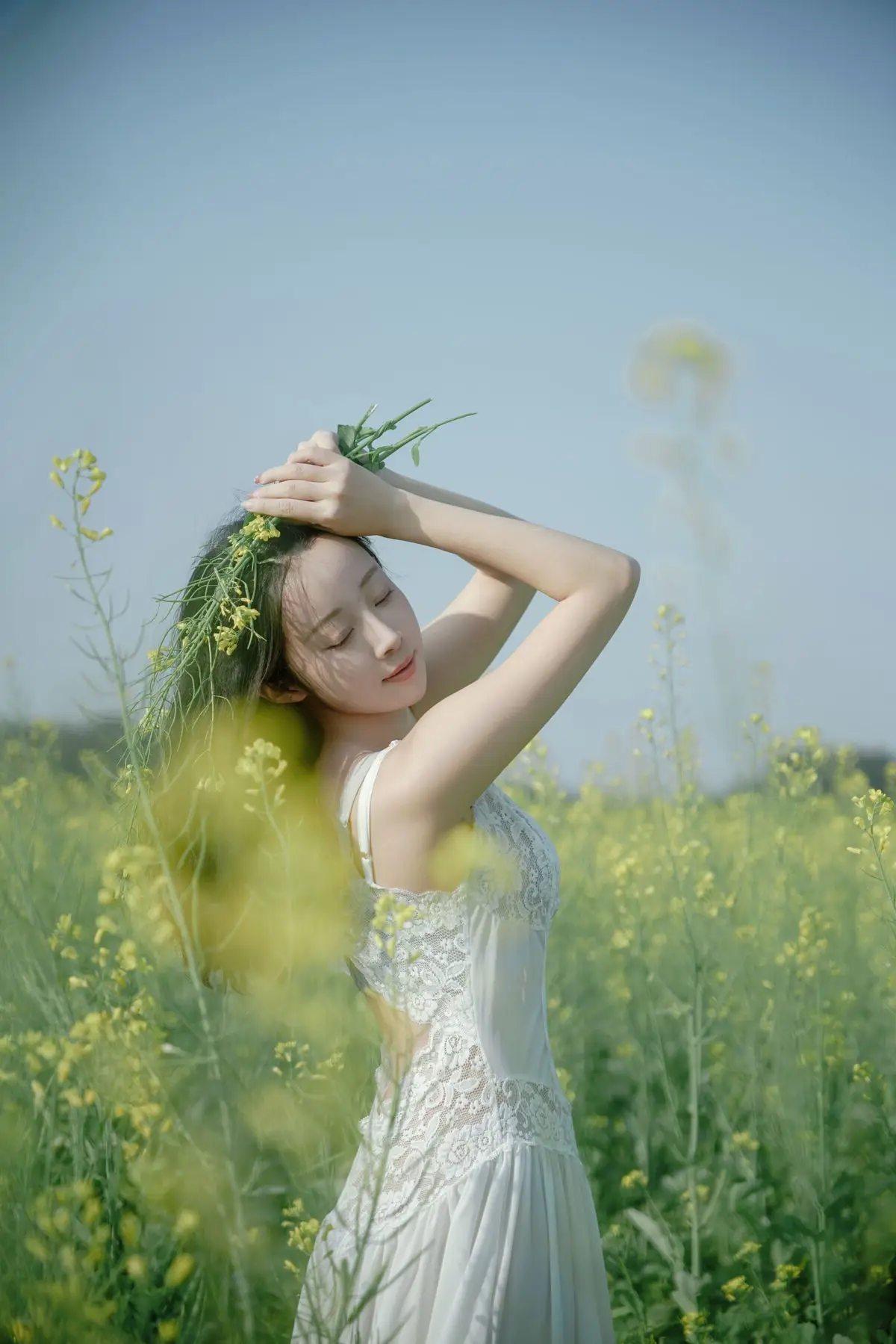 This stunning image from the YiTuYu Vol8529 collection showcases the muse Man Jiao with her pure and gentle beauty The girl lies amidst a vibrant field of golden cauliflower creating a poetic scene Man Jiao's delicate face and dreamy gaze are subtly reflected evoking a sense of tranquility and artistic depth Tiny cauliflower blossoms further adorn this graceful portrait The photograph not only celebrates Man Jiao's natural allure but also represents a harmonious blend of human and nature offering a feeling of peace and purity This is an authentic and emotional artistic moment of immersion into the natural world#ManJiao #YiTuYu #NaturalBeauty #Muse #GoldenCauliflower