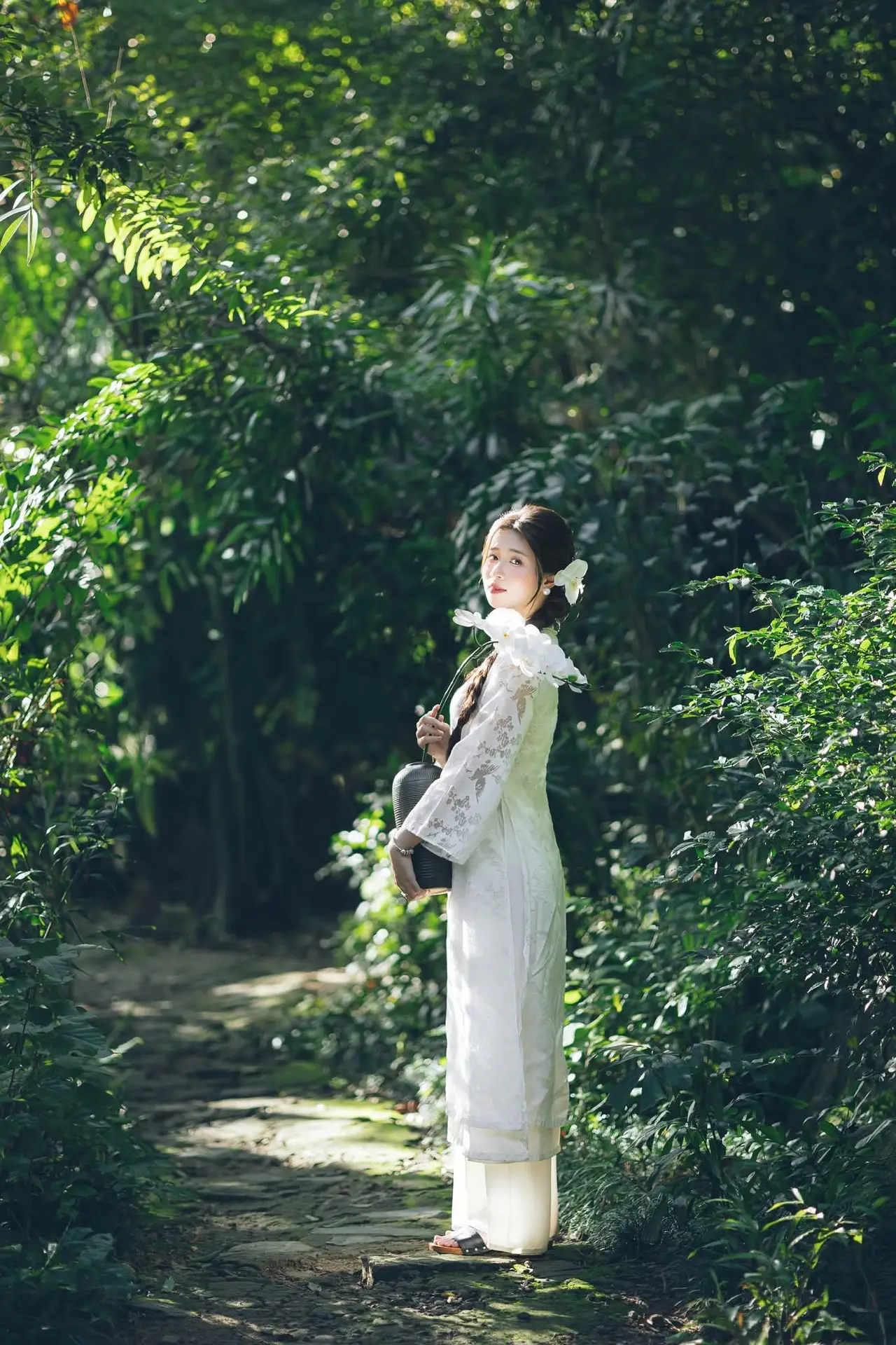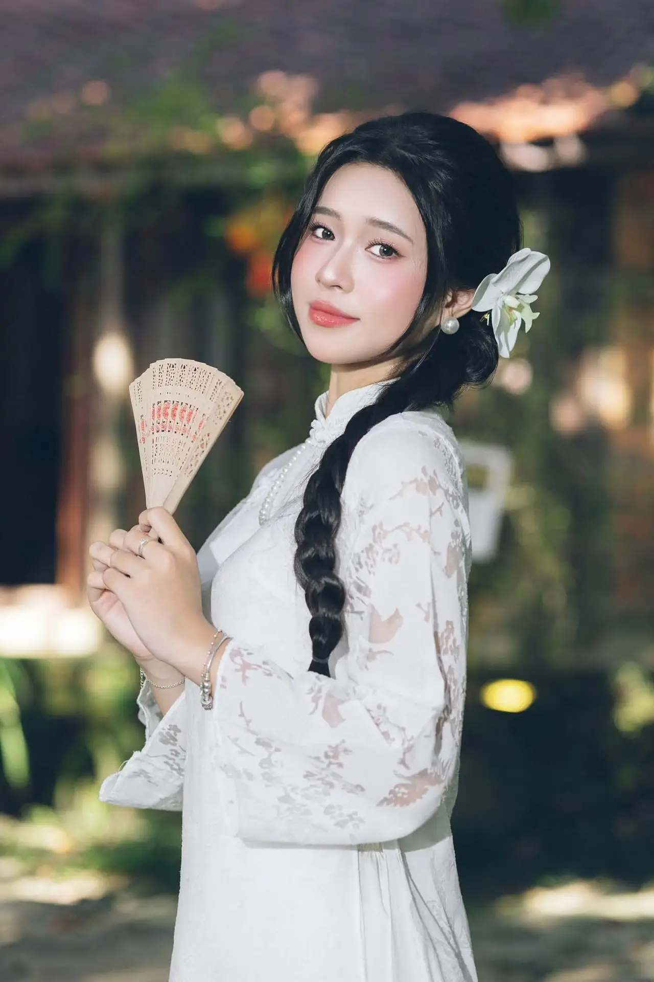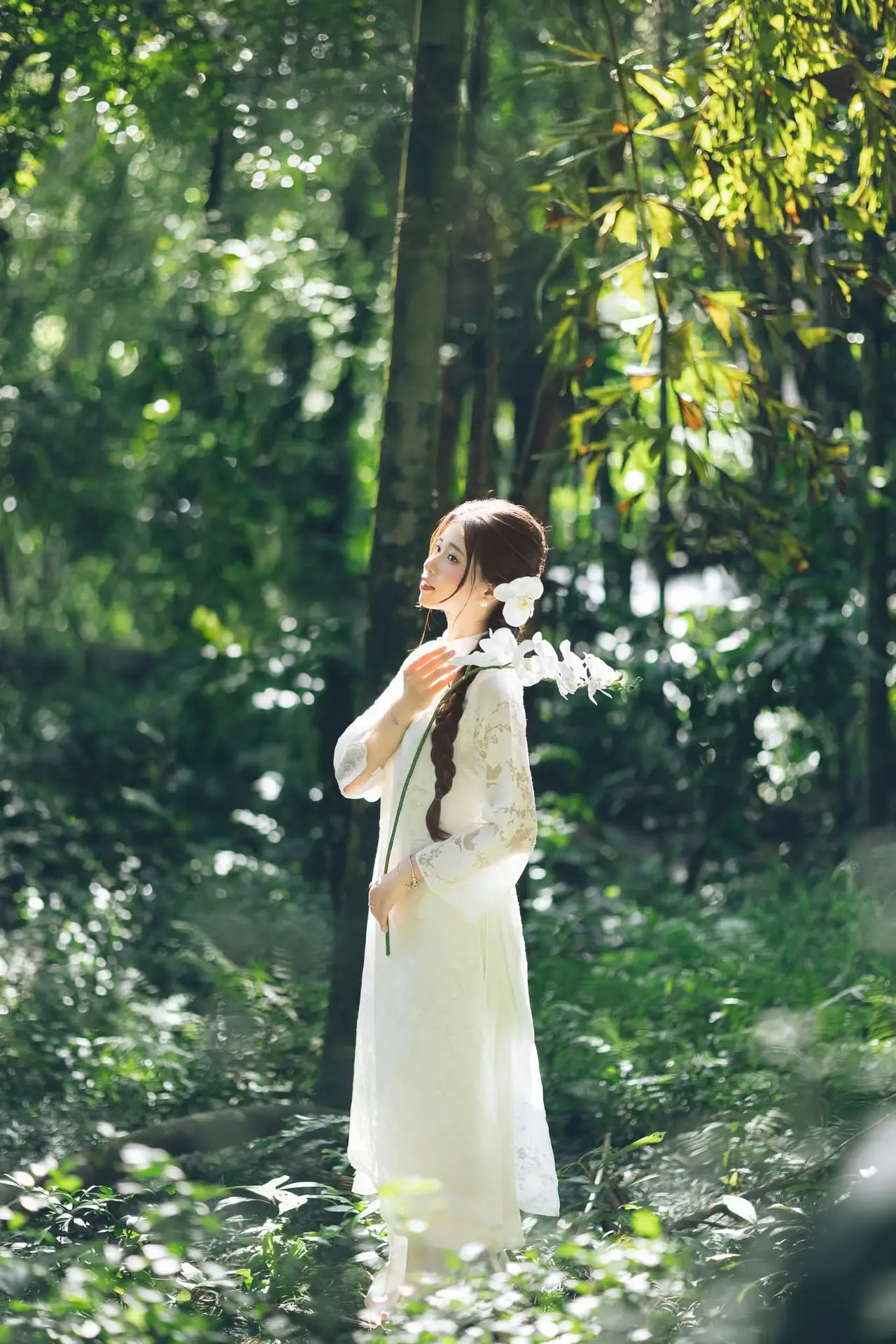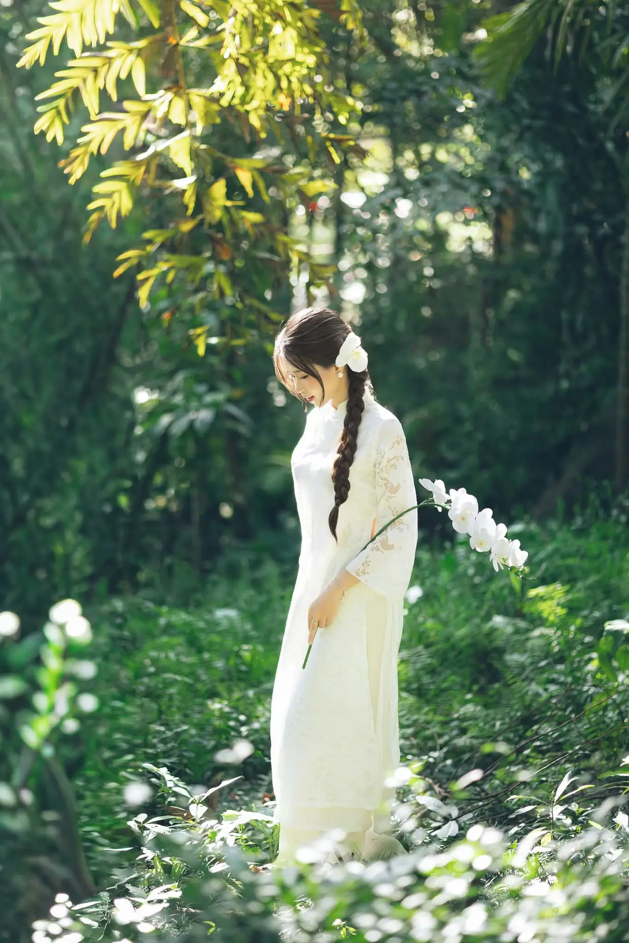In image 1000026906 a beautiful young woman radiates an aura of elegance and gentle charm. She wears a pristine white lace dress featuring intricate details that gracefully enhance her slender figure. Her long hair is neatly braided cascading over her shoulder adding a touch of grace. A delicate white orchid adorns her hair while a bouquet of white orchids in her hand further emphasizes her pure beauty. Her bright smile and clear eyes reflect the freshness of an early morning. The lush green natural background perfectly complements her natural beauty creating a serene and poetic moment that captures the essence of youthful grace.#VietnameseGirl #WhiteLaceDress #WhiteOrchids #NaturalBeauty #ElegantPortrait