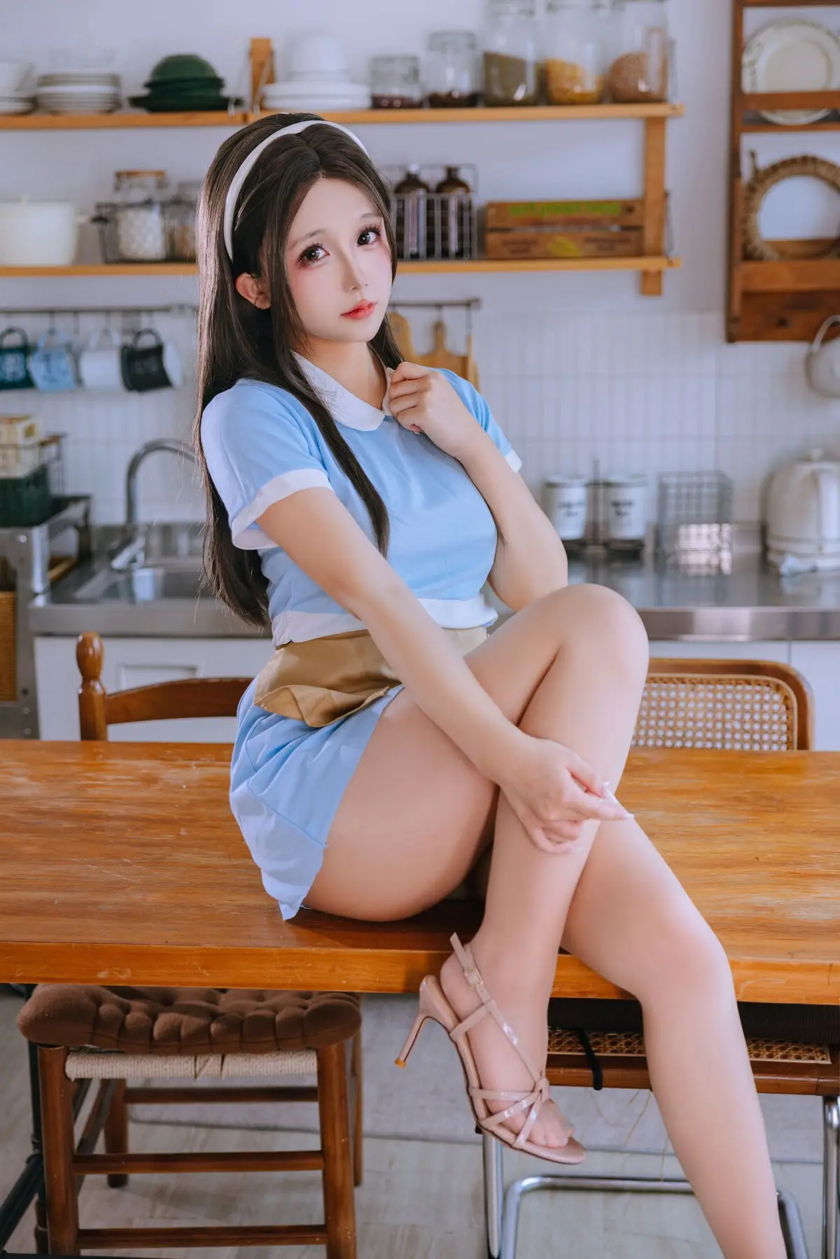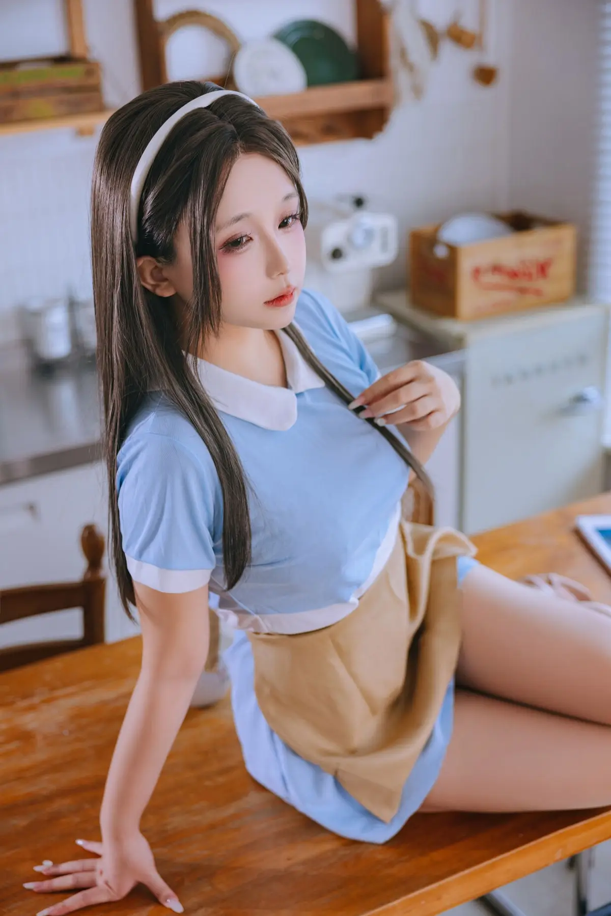 Immerse yourself in the enchanting world of Cosplay with Ri Nai Jiao as a charming cake seller. Dressed in a pastel blue uniform and a brown apron, Ri Nai Jiao exudes a sweet and graceful beauty, much like the delicate cakes she prepares. Her radiant smile and captivating eyes brighten the cozy, tidy kitchen setting. Every gesture and glance showcases a professional yet undeniably adorable charm, inviting viewers to explore her story further. This Part01 photo collection is not just a perfect blend of Cosplay art and an everyday setting; it is an invitation to a relaxing and captivating visual experience. You will undoubtedly be charmed by her pristine beauty and the subtle elegance captured in every frame.#Coser #RiNaiJiao #CakeSellerCosplay #SweetCosplay #KitchenVibes #CharmingCoser