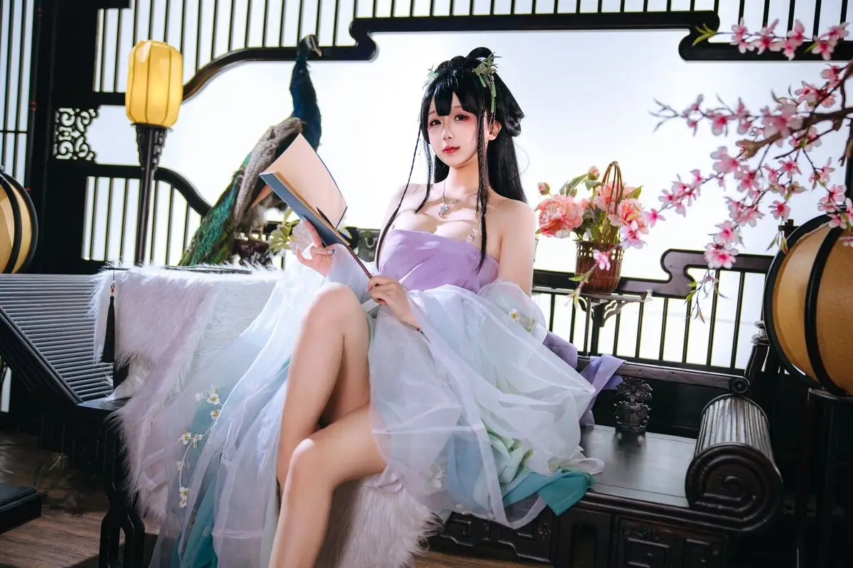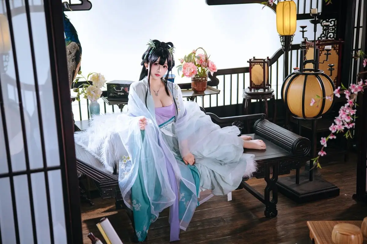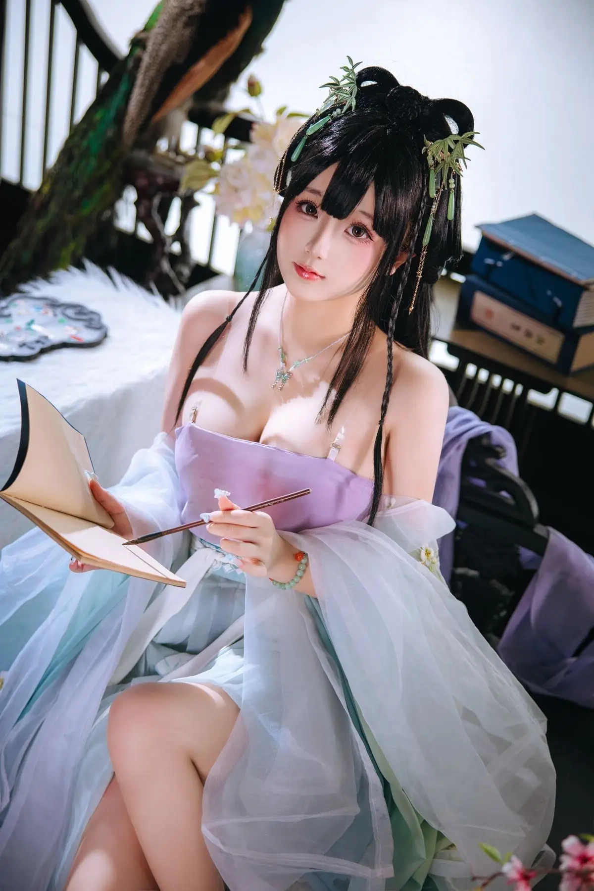 Immerse yourself in the captivating world of ancient aesthetics with Coser Rina Jiao's exquisite portrayal of Senior Sister Part01. This stunning image captures a beautiful character adorned in an intricate traditional costume, featuring soft flowing fabrics and dark hair elegantly styled with vibrant green accessories, exuding an ethereal and transcendent charm. The Senior Sister gracefully holds a brush, seemingly engrossed in the art of calligraphy or painting, creating a moment that is both serene and utterly captivating. Rina Jiao's gentle yet expressive gaze and graceful demeanor breathe life into the character, presenting a Senior Sister who is both approachable and irresistibly alluring. This is undoubtedly a high-level cosplay masterpiece, celebrating traditional beauty and the Coser's remarkable talent.#Coser #RinaJiao #SeniorSister #HanfuCosplay #AsianBeauty #CosplayArt