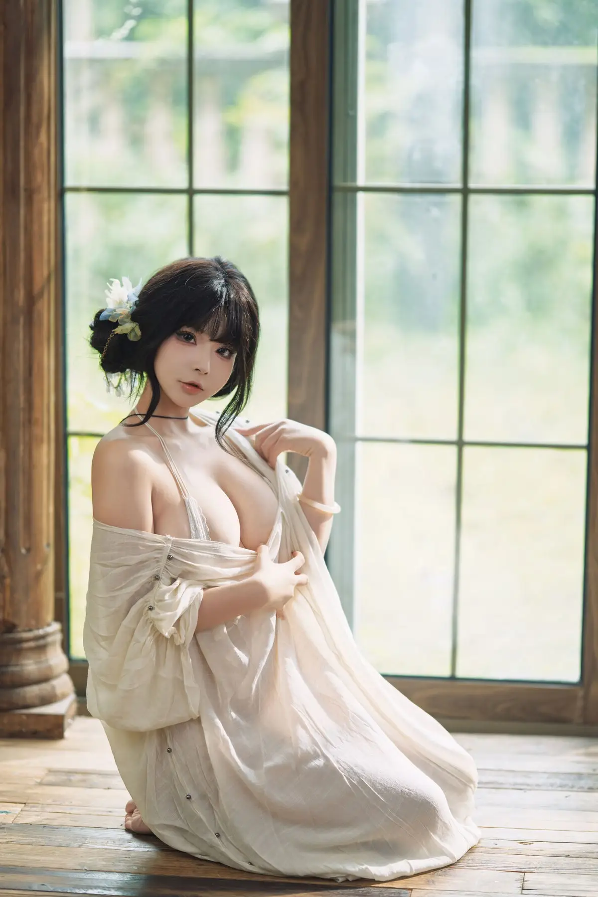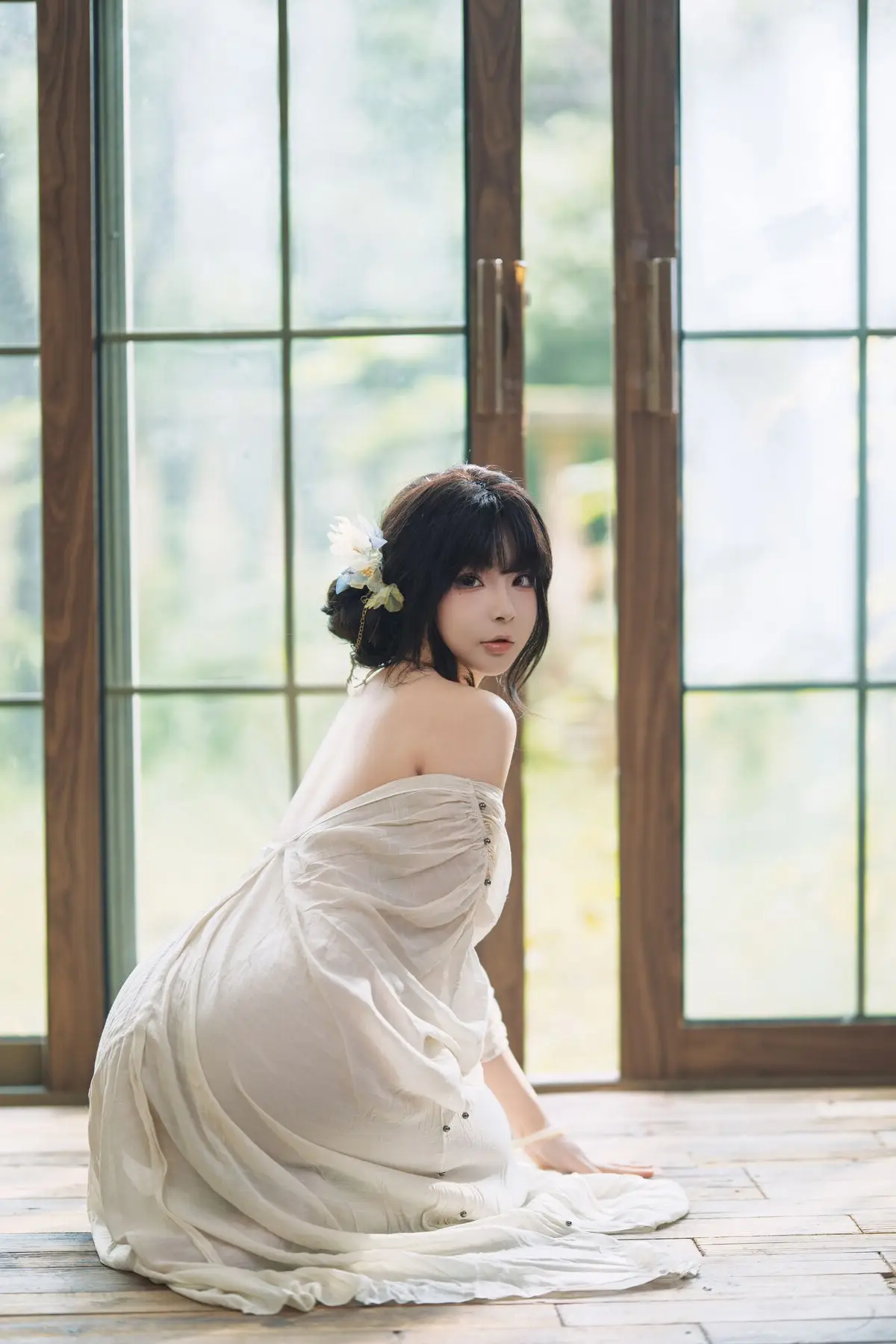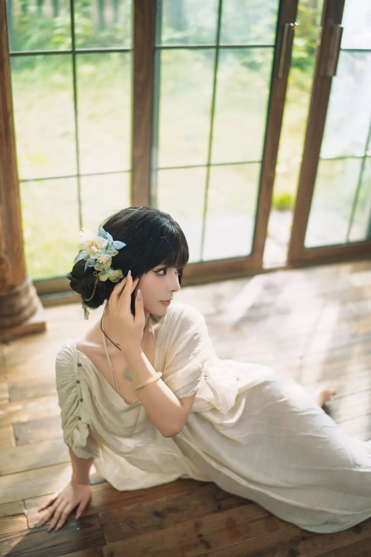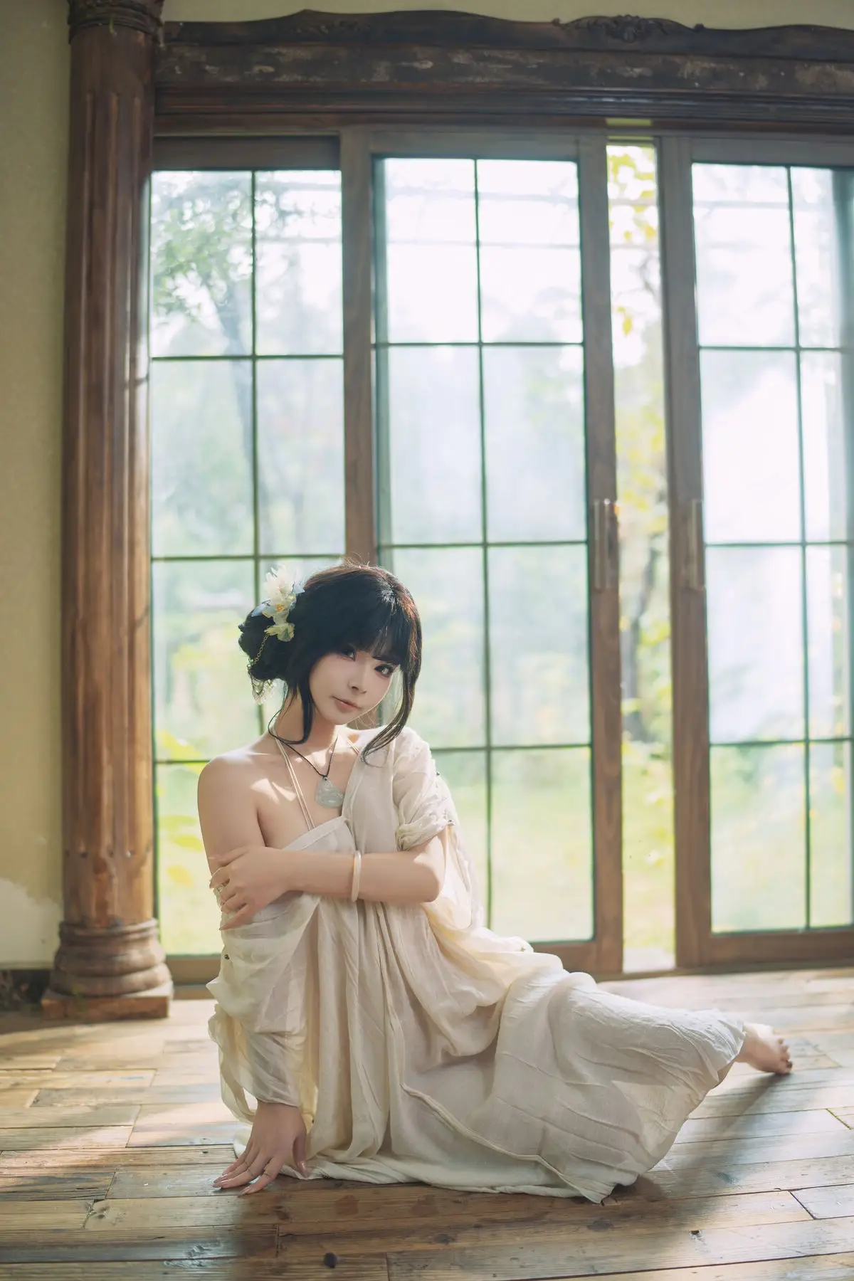 Immerse yourself in the serene elegance of Coser Yuuhui through her "Song of Spring" Part02 photoshoot. In this captivating image, Yuuhui embodies a gentle muse, gracefully seated on a wooden floor, her gaze softly directed away. Her pristine cream-colored dress, featuring a delicate deep V-neckline, beautifully accentuates her natural softness and allure. Bathed in natural light streaming through a large window, the setting creates a warm, romantic ambiance, highlighting her smooth skin and dark hair adorned with a white flower. She exudes a tranquil charm, much like a peaceful note in spring's symphony, offering a sense of calm and beauty to the viewer. This collection promises to enchant all who appreciate subtle grace and refined aesthetics.#Coser #Yuuhui #SongOfSpring #GentleBeauty #GracefulPose #EtherealMuse