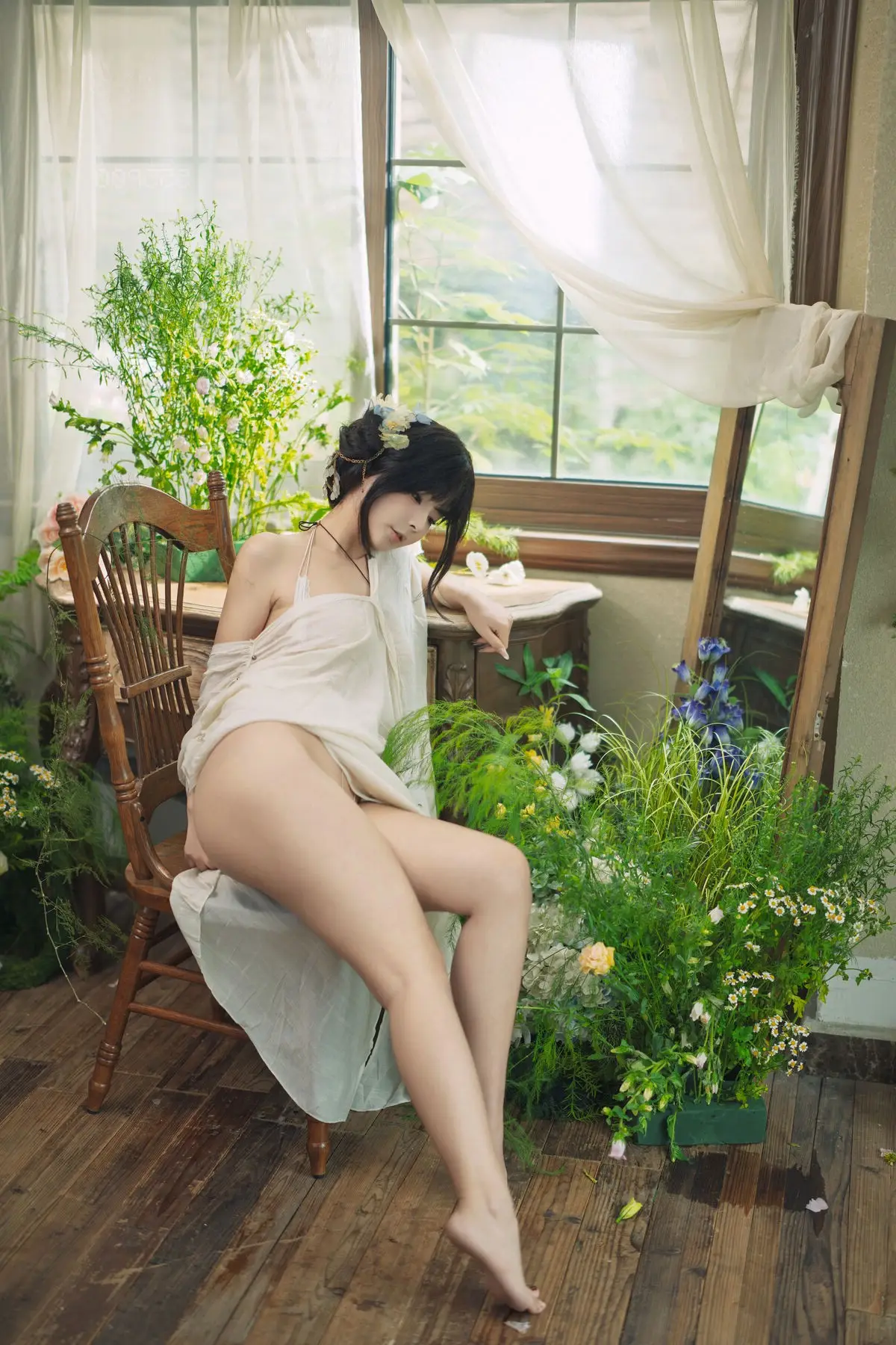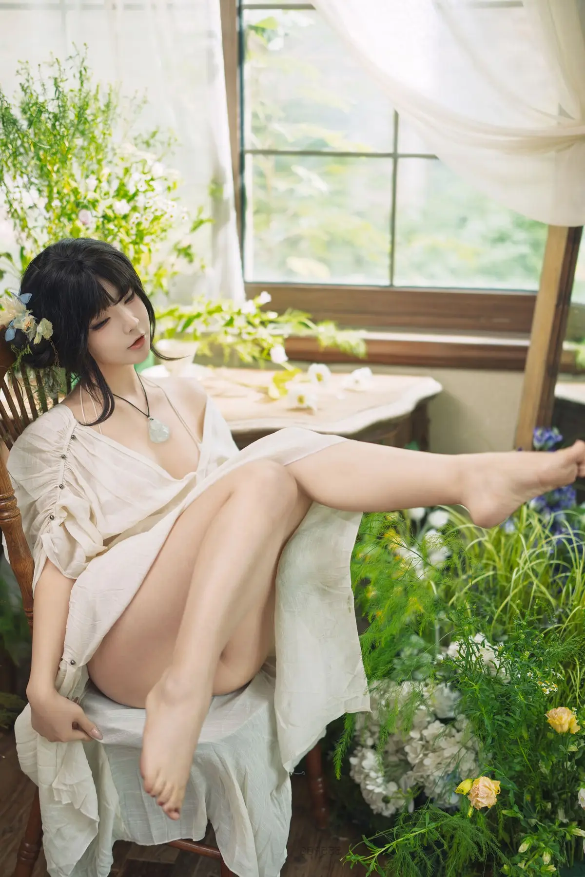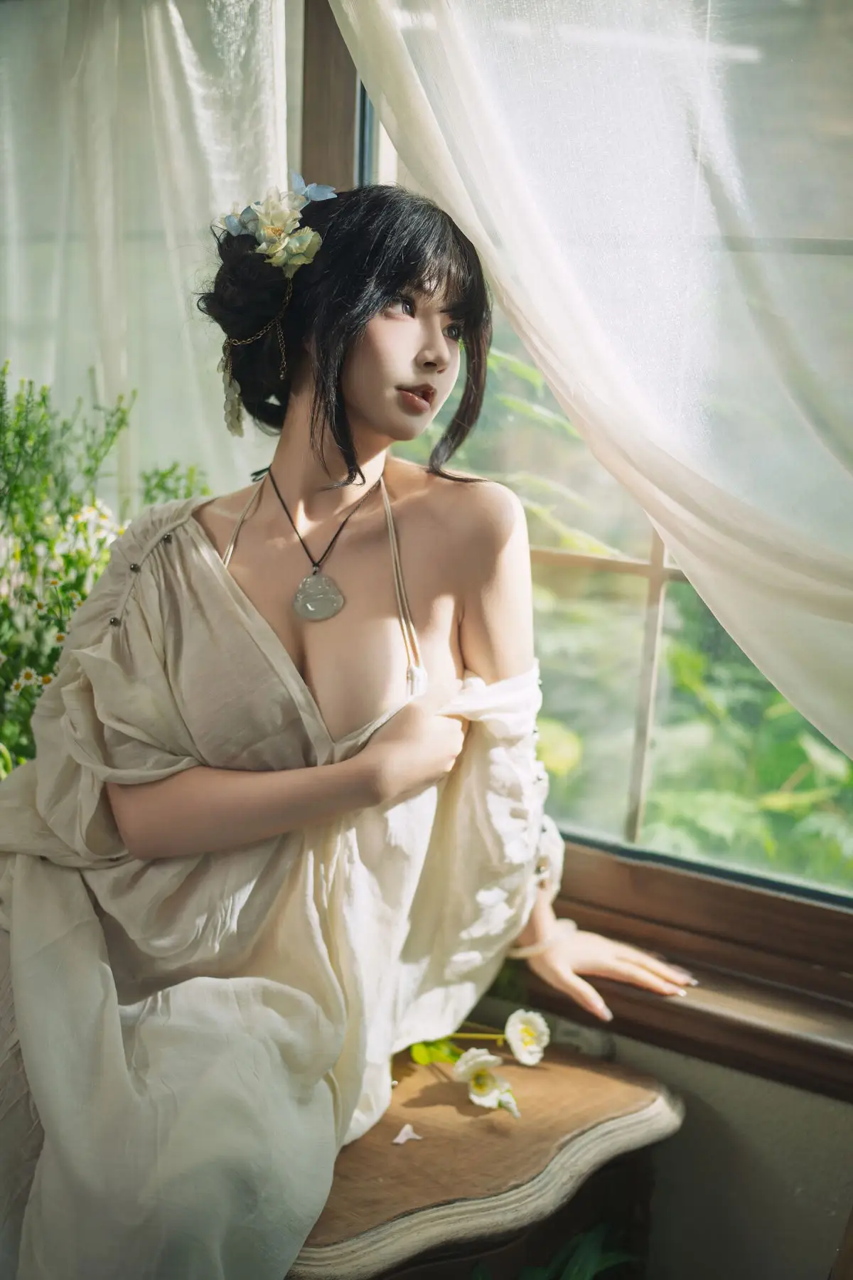 Immerse yourself in the dreamy world of Coser yuuhui玉汇 in the artistic Spring Song Part01 collection. The muse yuuhui appears with an ethereal and pure beauty adorned in a light white dress her dark hair accented with pristine white flowers like a blossoming flower welcoming spring. Gracefully kneeling by the window bathed in natural light she gently turns her head to look back her gaze clear yet captivating. The soft light filtering through the glass highlights her delicate contours creating a harmonious portrait of human beauty and natures freshness. Every moment in Spring Song Part01 exudes tenderness and allure evoking feelings of peace and romance inviting viewers to wander into this enchanting spring-like realm.#Coser #Yuuhui #SpringSong #MuseOfSpring #EtherealBeauty #ArtisticPhotography