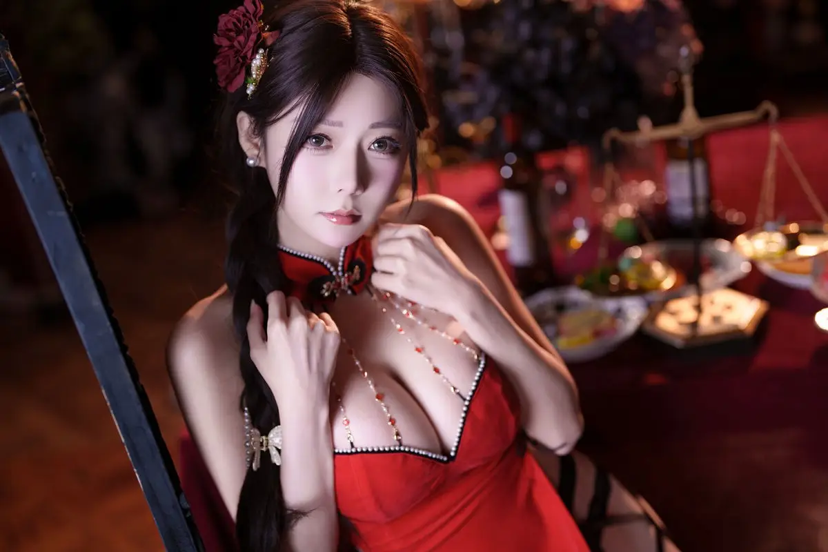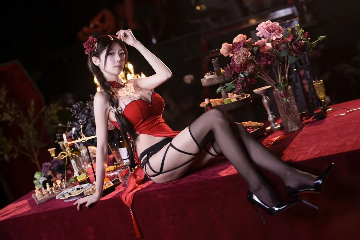 This stunning image captures Coser Xiang Cao Miao Lu Lu (香草喵露露) in an enchanting 2025 Spring Festival ambiance. She embodies an exquisite Asian beauty, adorned in a vibrant red outfit, intricately designed with sparkling embellishments that highlight her alluring silhouette. Her gracefully braided hair, complemented by a matching floral accessory, enhances her elegant and seductive charm. The moment she delicately brings a luscious red cherry to her lips creates an inviting and mysterious allure. This impressive cosplay performance beautifully blends traditional aesthetics with modern flair, radiating warmth and excitement for the festive season.#Coser #XiangCao #MiaoLuLu #SpringFestival2025 #RedOutfit #AsianBeauty #SeductiveCosplay
