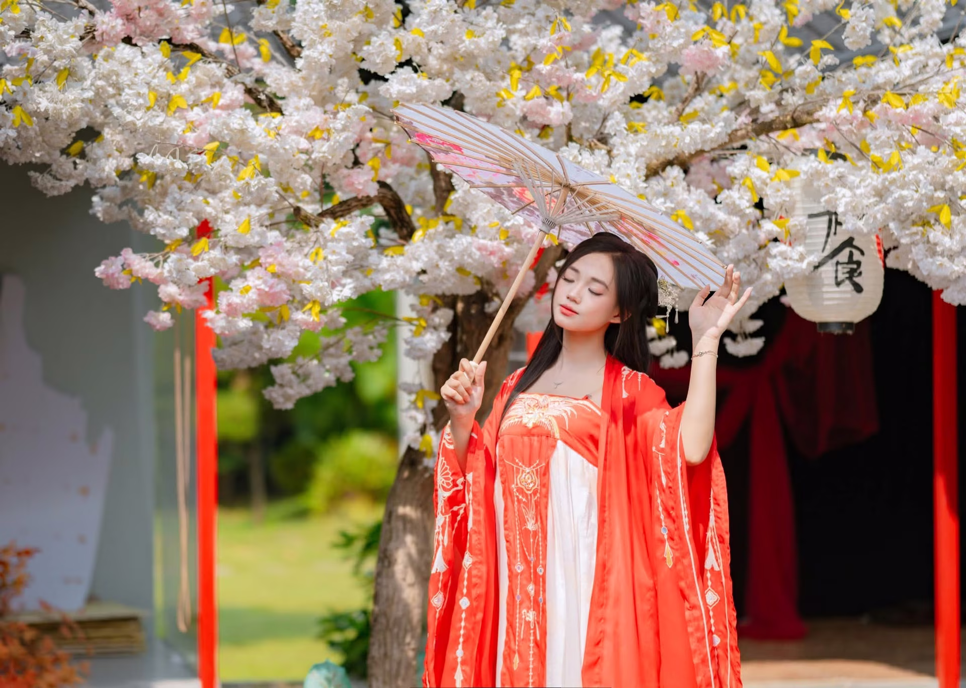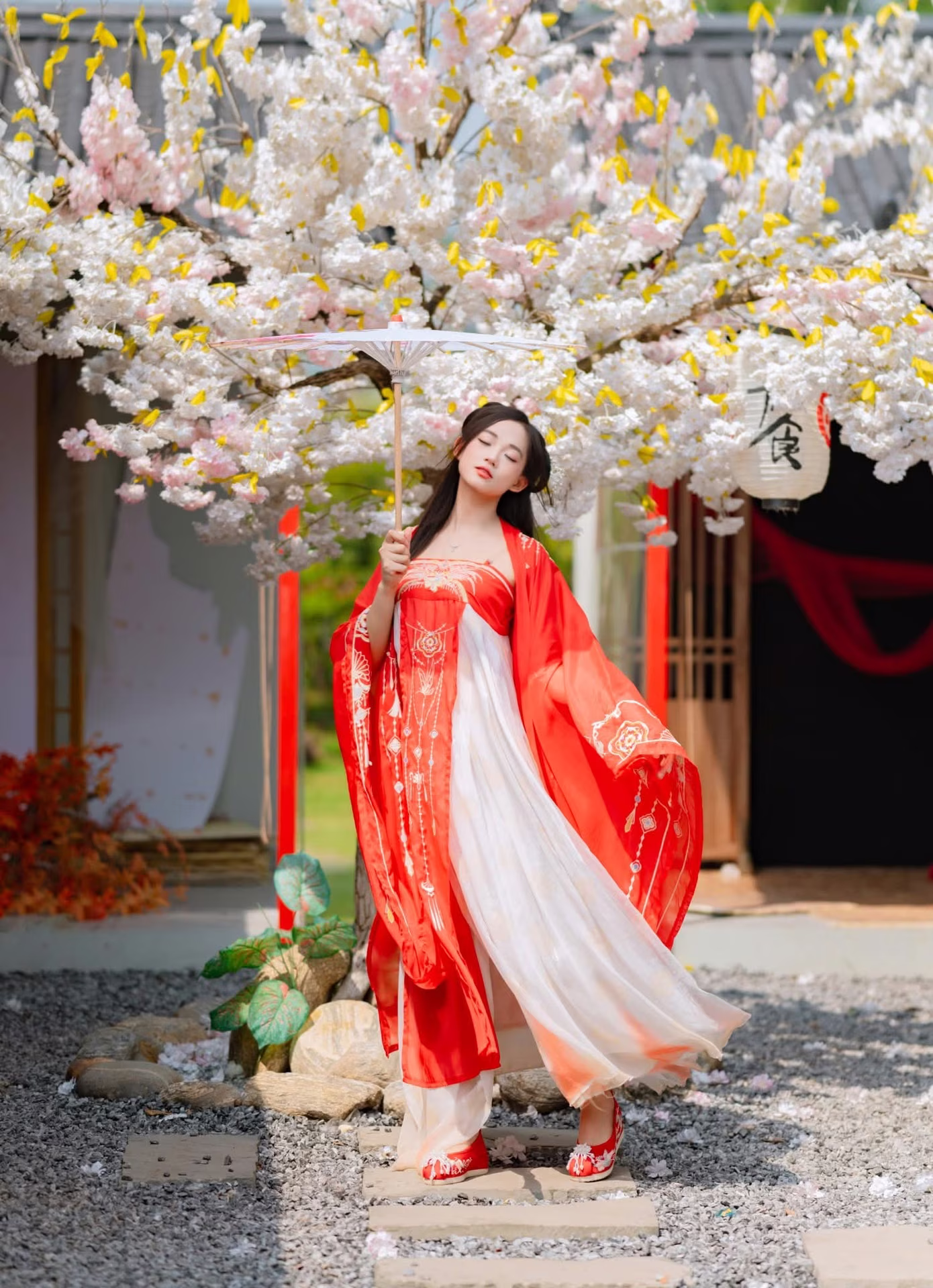 The image FB_IMG_1761297312624 unveils a poetic scene where a young woman in a vibrant traditional Hanfu dress captivates the viewer. With her lustrous dark hair and delicate features she embodies an enchanting East Asian beauty. Standing beneath a canopy of soft white and pink blossoms she gently holds a flower as if listening to the breath of spring. Her striking red and white Hanfu attire stands out against the pristine floral backdrop creating a harmonious and romantic tableau. This picture not only celebrates the grace of the woman but also evokes the profound beauty of traditional culture. The blend of human elegance and natural splendor leaves viewers feeling touched and dreaming of a colorful fairytale world.Dreamy Girl Bathed in Morning Light: Ethereal Beauty in a Romantic Setting 1000021061