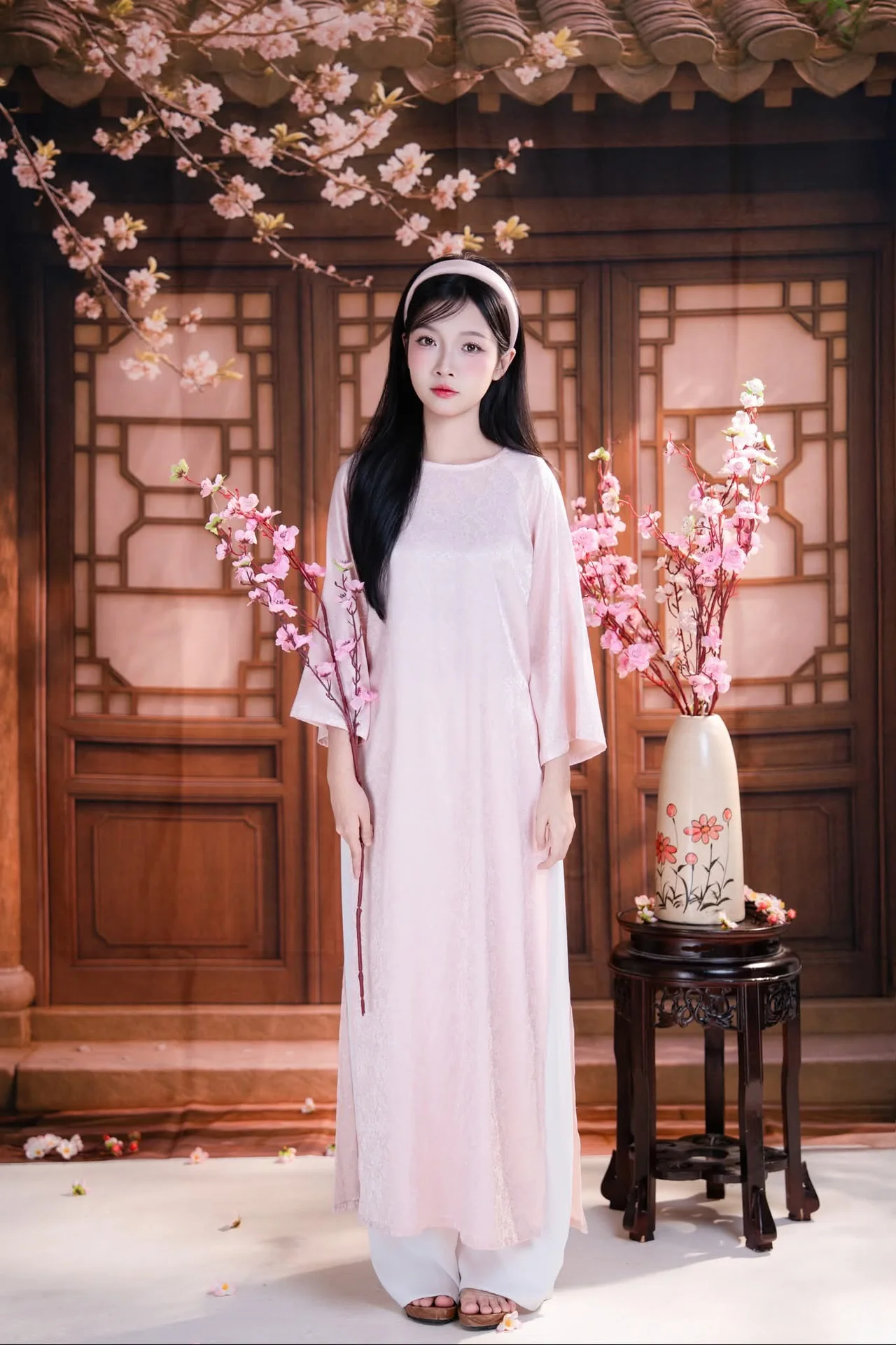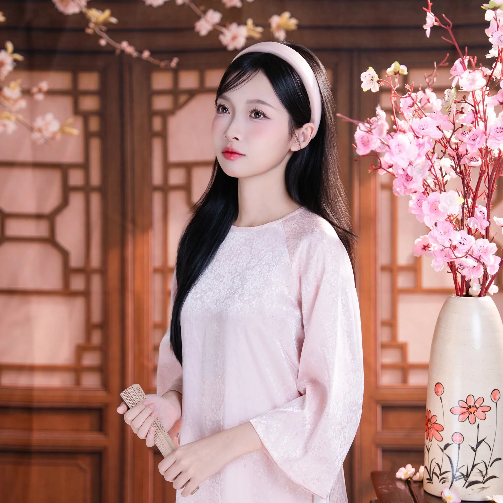 This captivating image portrays the delicate and gentle beauty of an Asian girl adorned in traditional attire reminiscent of the Vietnamese Ao Dai With her smooth dark hair and a soft pink headband she gently touches a branch of vibrant spring blossoms like cherry or peach creating a poetic and lively scene Her refined features clear eyes and subtle smile exude purity and shyness much like a budding flower The blurred background featuring traditional wooden patterns further accentuates her elegance and the profound Asian cultural charm This photograph beautifully encapsulates the freshness of spring and a timeless aesthetic