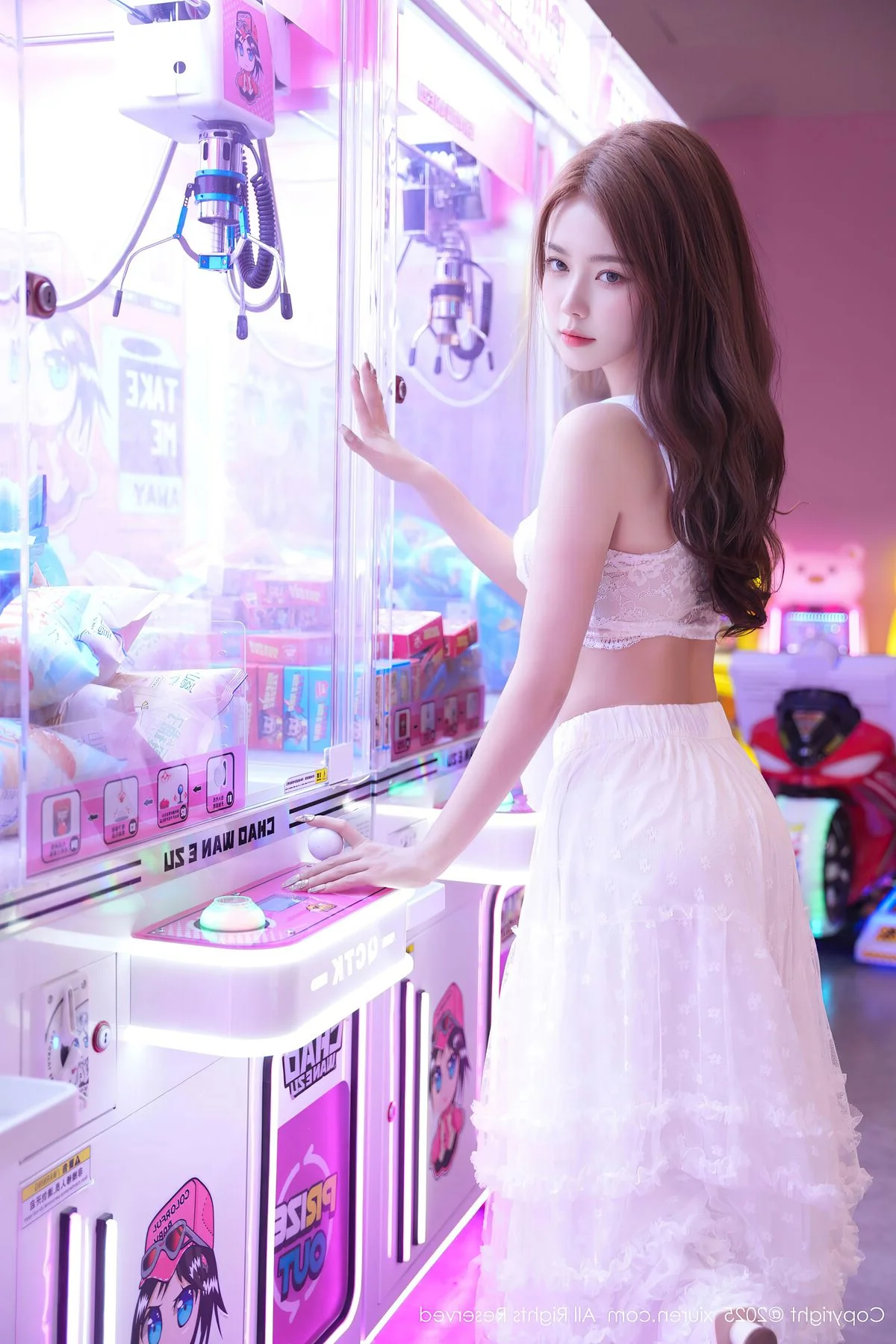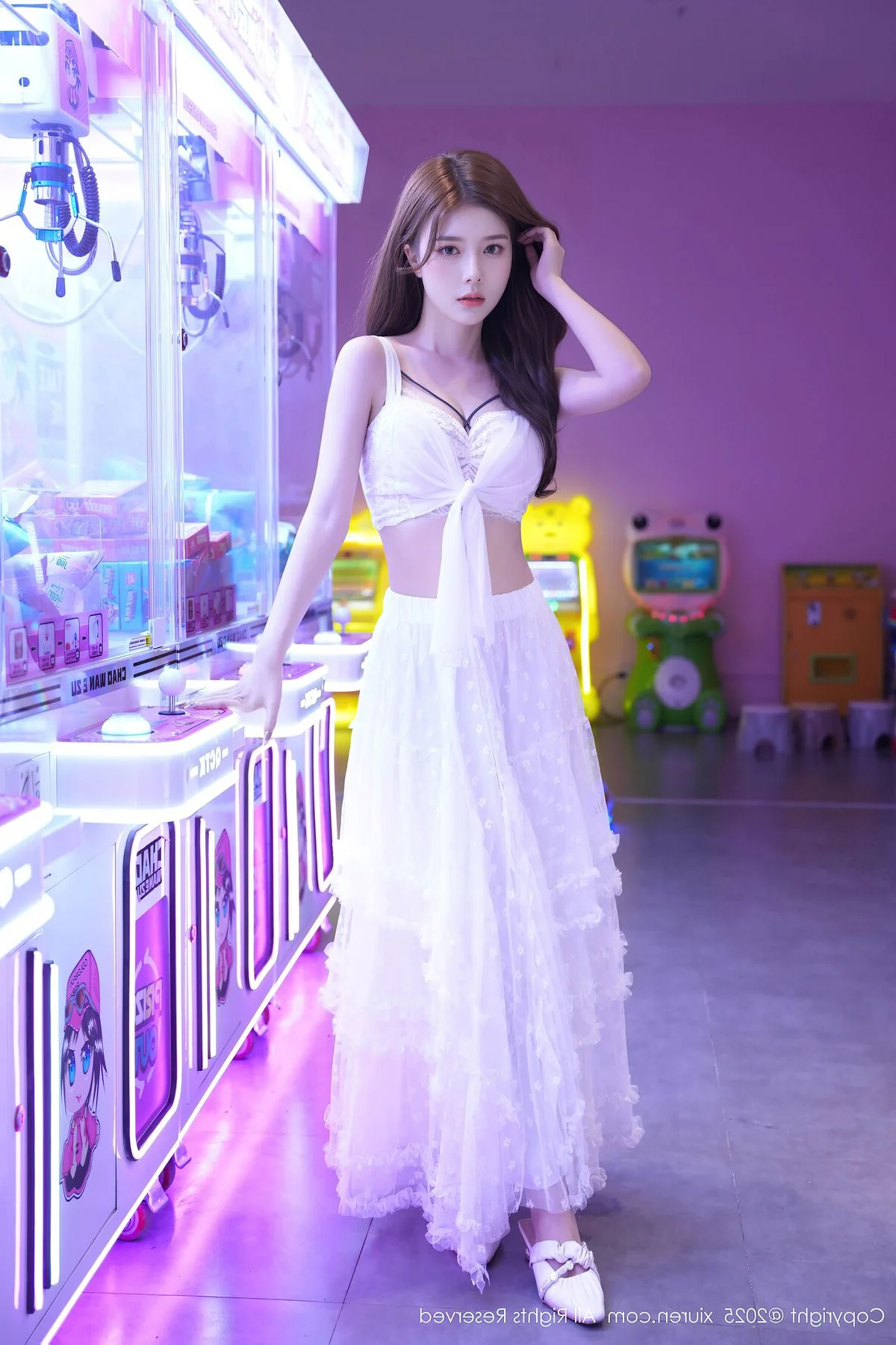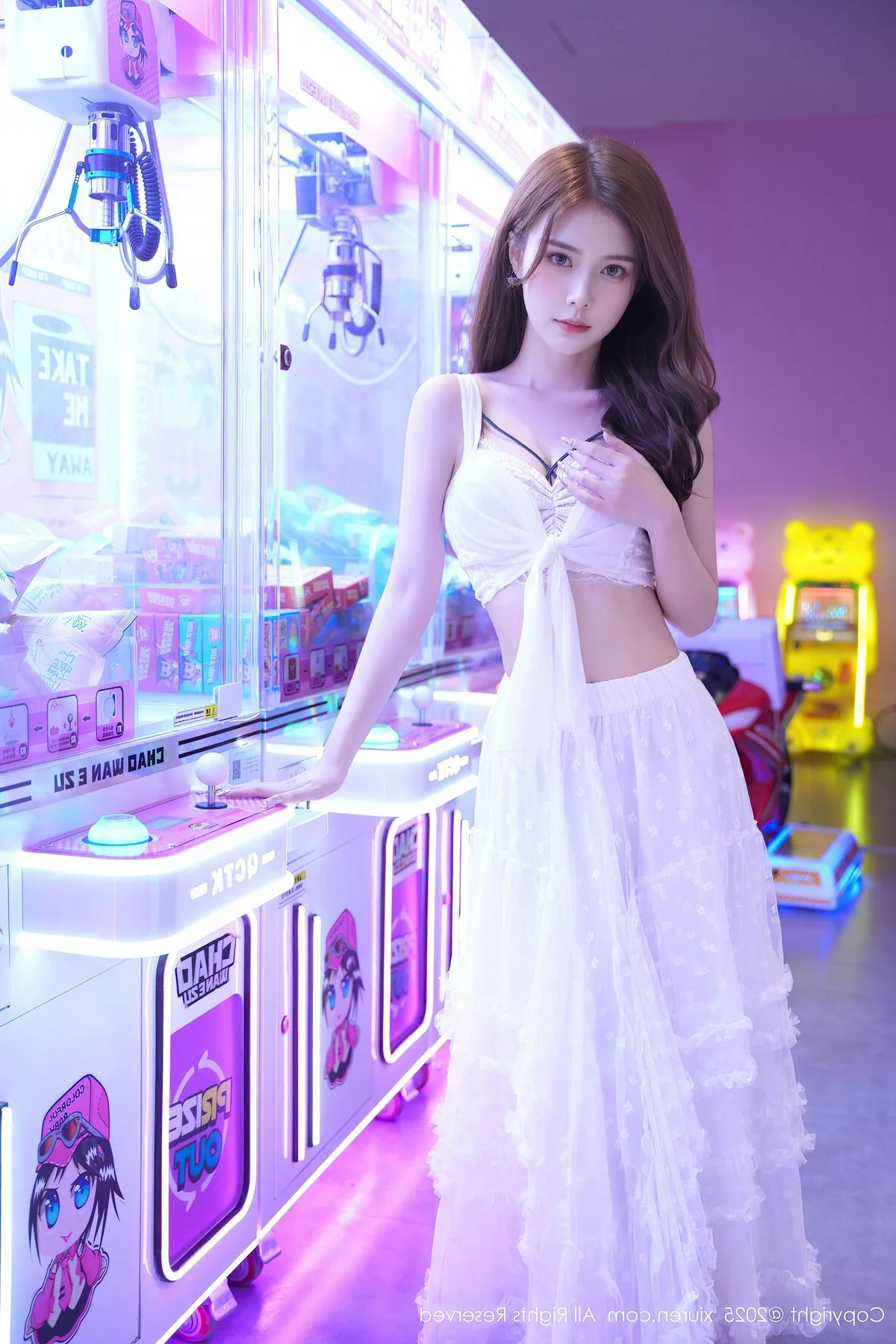 Stepping into the vibrant purple and pink neon glow of an arcade, Pai Huang Gua Girl emerges as a pure and captivating muse in this artistic sequence No.10791. Dressed in an ethereal all-white ensemble, her flowing tiered skirt adds a sense of movement and grace to the energetic urban setting. The delicate tie-front top perfectly balances femininity with a modern fashion edge, highlighting her effortless elegance and sophisticated aura. There is something deeply poetic about the way the soft white fabric contrasts with the colorful, high-energy background, creating a visual narrative that feels both nostalgic and contemporary. Her gentle expression and poised body language invite us into a world where fashion meets playfulness, capturing a fleeting moment of beauty amidst the flashing lights. This aesthetic blend of minimalist styling and maximalist surroundings offers a truly inspiring look at modern visual storytelling and personal style.