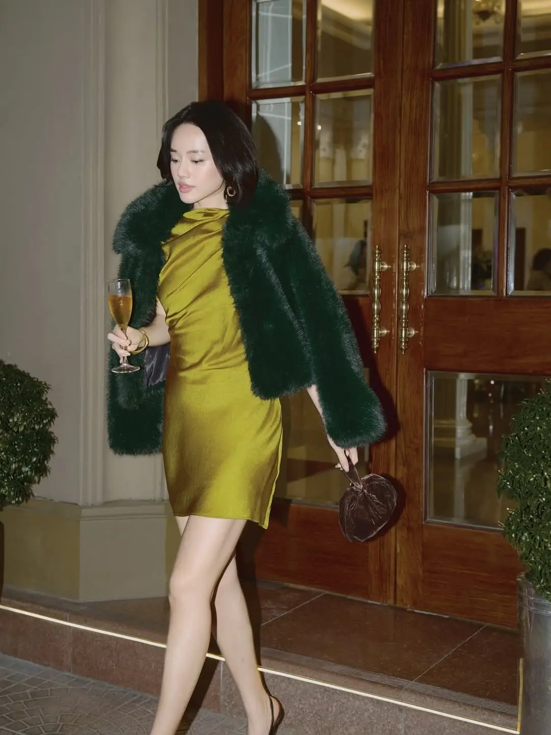 “Trendy Girl” Khanh Linh once again captivated fans with her charismatic presence. She appeared in a striking chartreuse green dress, showcasing a seductive open back and an incredibly luxurious fashion style. Every step radiated confidence and class, solidifying her status as a fashion icon. Draping a dark green faux fur jacket, Khanh Linh not only stayed warm but also created a unique accent, adding a touch of mystery and power. This image quickly went viral on social media, proving her undeniable appeal. It is a testament to her exquisite styling and superior aesthetic taste, ensuring all eyes are drawn to her.
