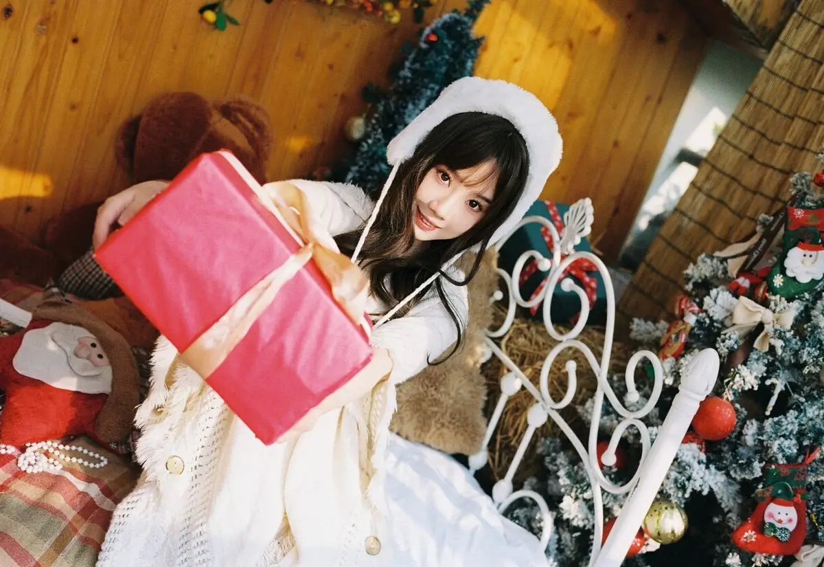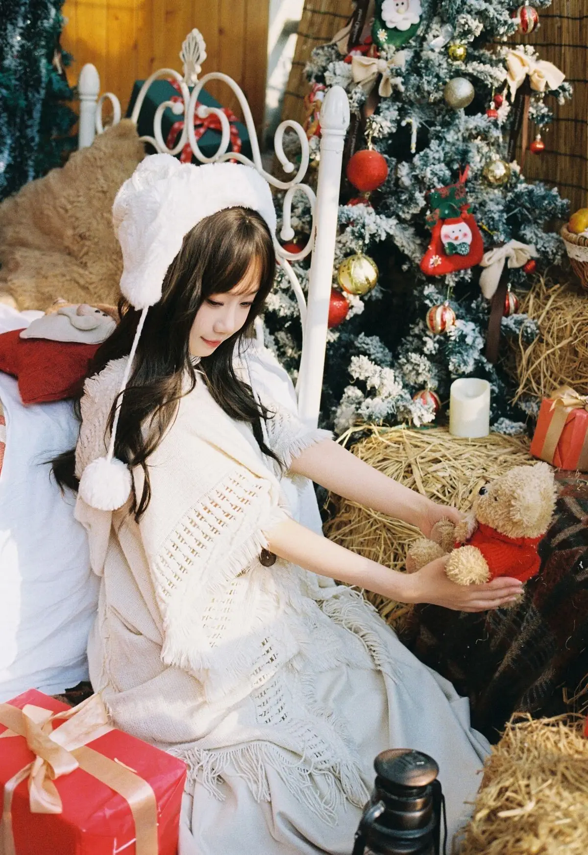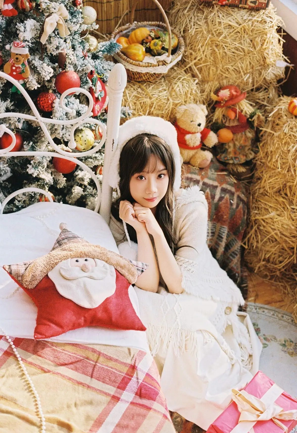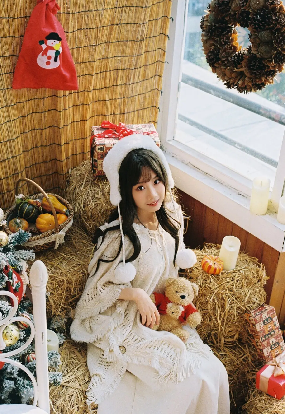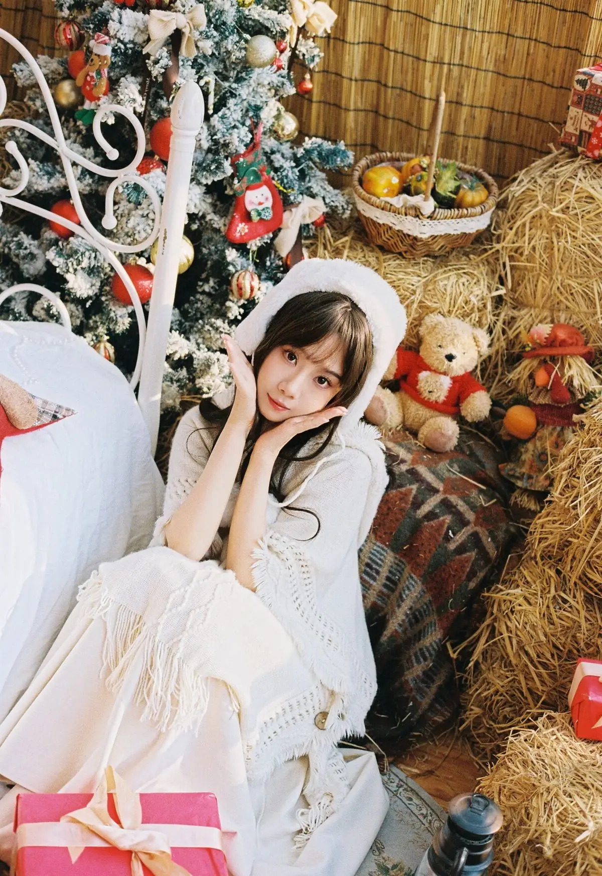 This exquisite photograph from the YiTuYu Vol8643 collection features model Zi Qing exuding a delicate and gentle beauty She is gracefully seated amidst golden straw bales creating a rustic and incredibly cozy atmosphere Her pristine white knitted hat and soft flowing shawl accentuate her innocent charm and warmth In Zi Qing’s hands rests a basket brimming with autumn fruits such as oranges grapes and pears evoking a sense of peace and abundance This image beautifully captures a serene autumn or winter afternoon where simplicity and natural beauty merge to form a delightful and emotional moment It is an ideal scene for those seeking tranquility and pure aesthetic appeal