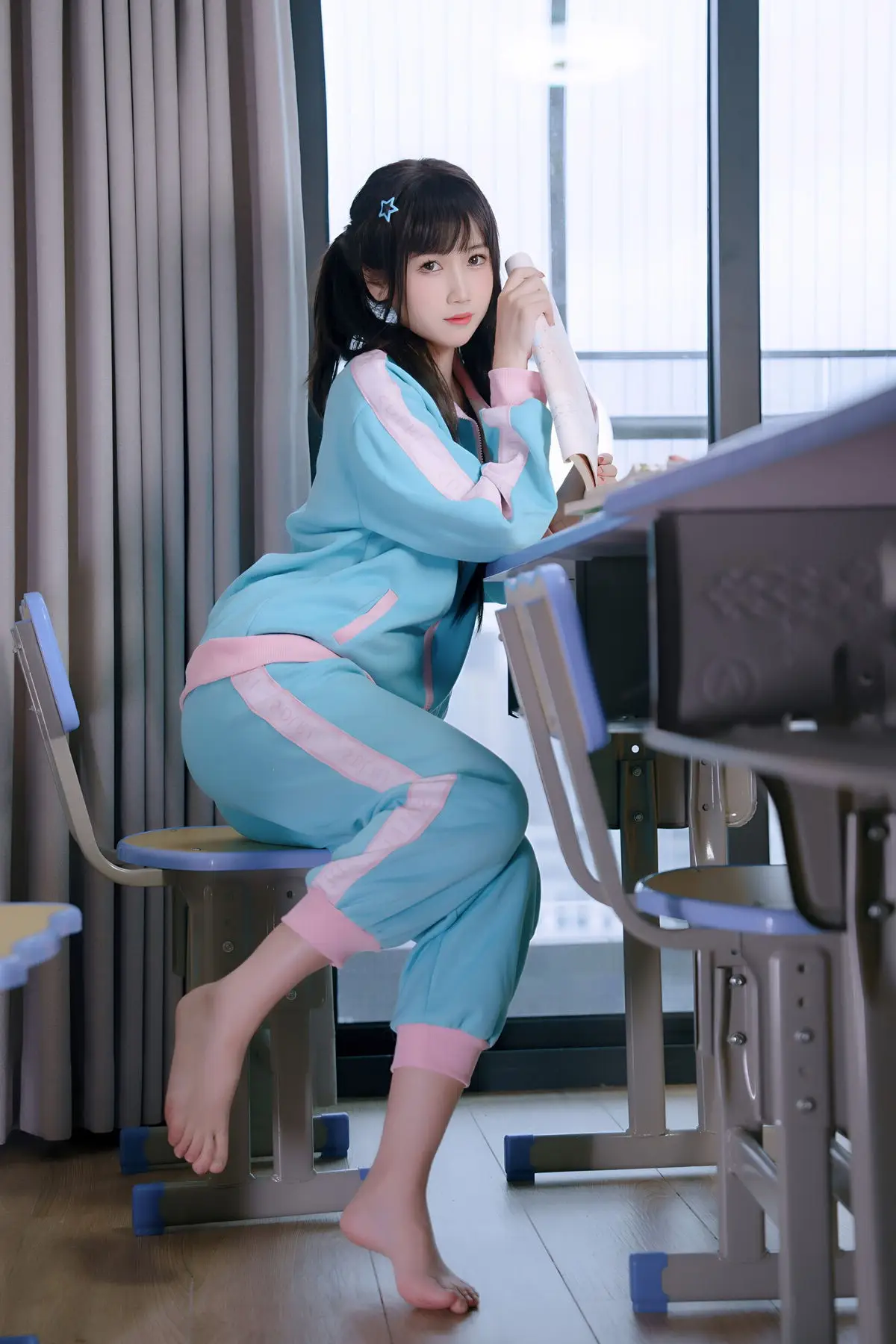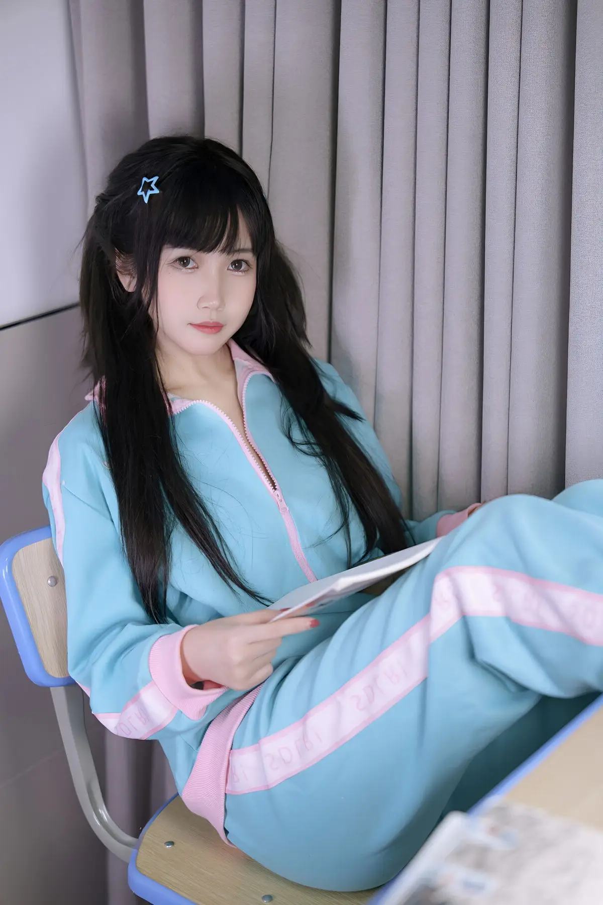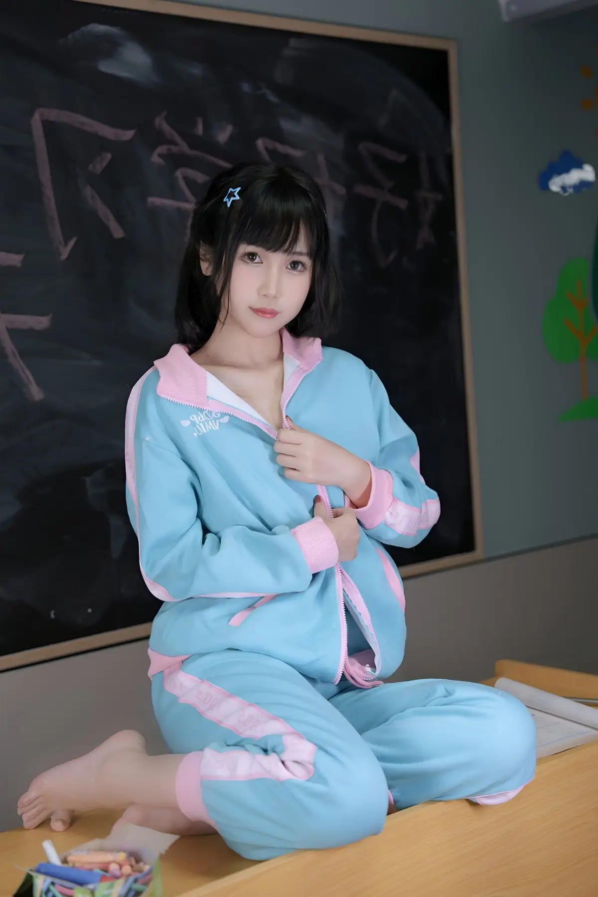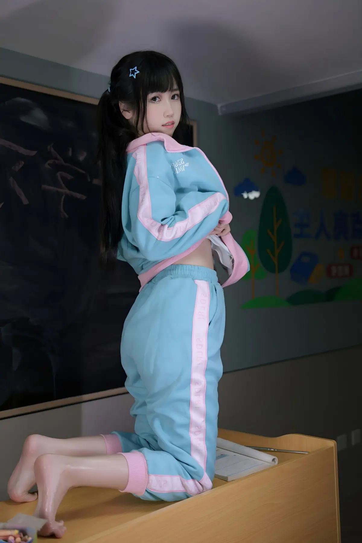 In the special photo collection titled 'Tu You Jiao Shi Shi Xi Sheng', cosplayer Bu Dai Mao transforms into a mischievous yet captivating intern within a familiar classroom setting. Dressed in a pastel blue and pink tracksuit, she poses gracefully on a desk, her enchanting gaze directed at the viewer. The classroom environment, complete with a blackboard and simple drawings, further highlights Bu Dai Mao's presence, creating a scene that is both relatable and full of surprises. This collection promises unique moments, showcasing the cosplayer's creativity and distinctive style, leaving viewers curious about the story behind this intriguing 'intern' role.#Coser #BuDaiMao #TuYouJiaoShiShiXiSheng #ClassroomCosplay #AlluringBeauty #InternRoleplay