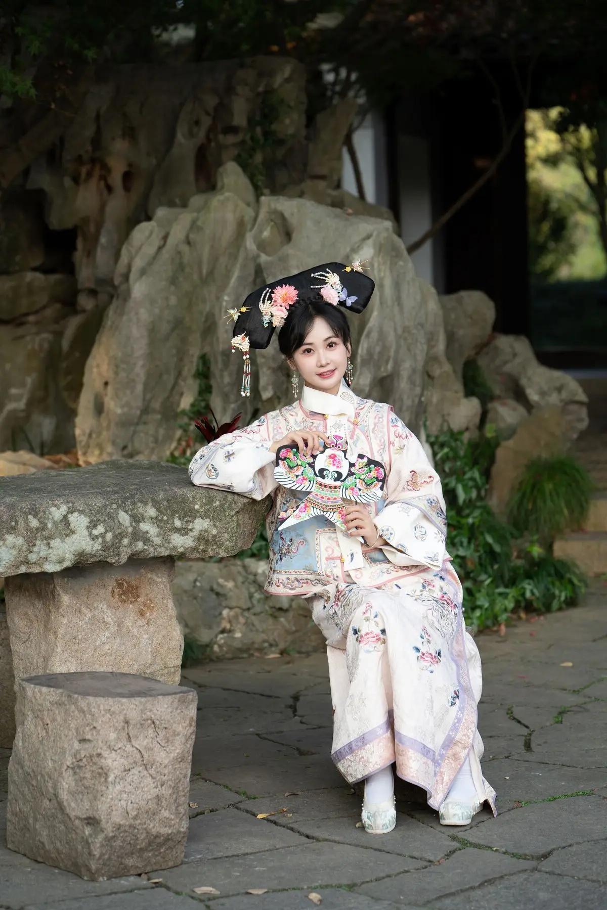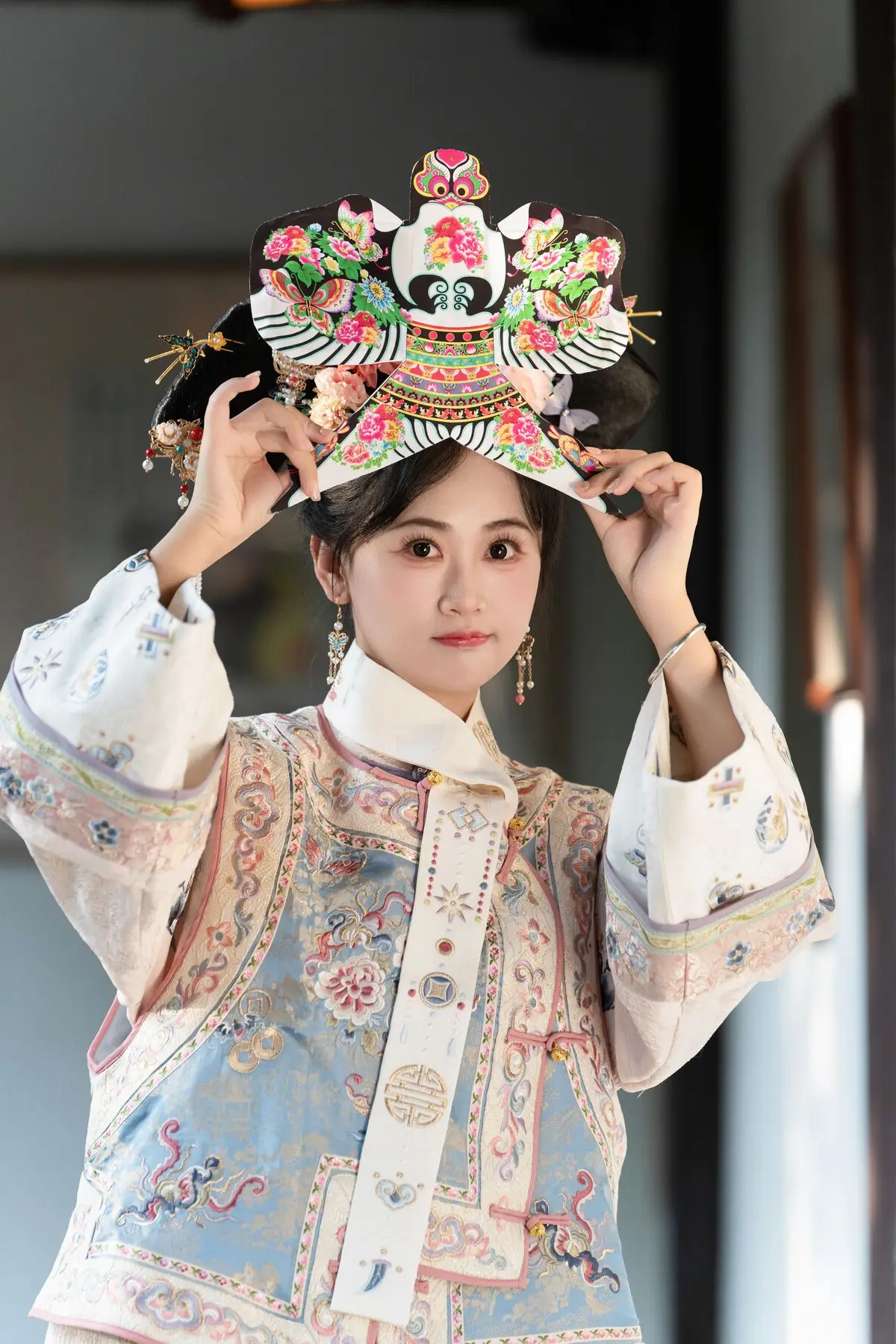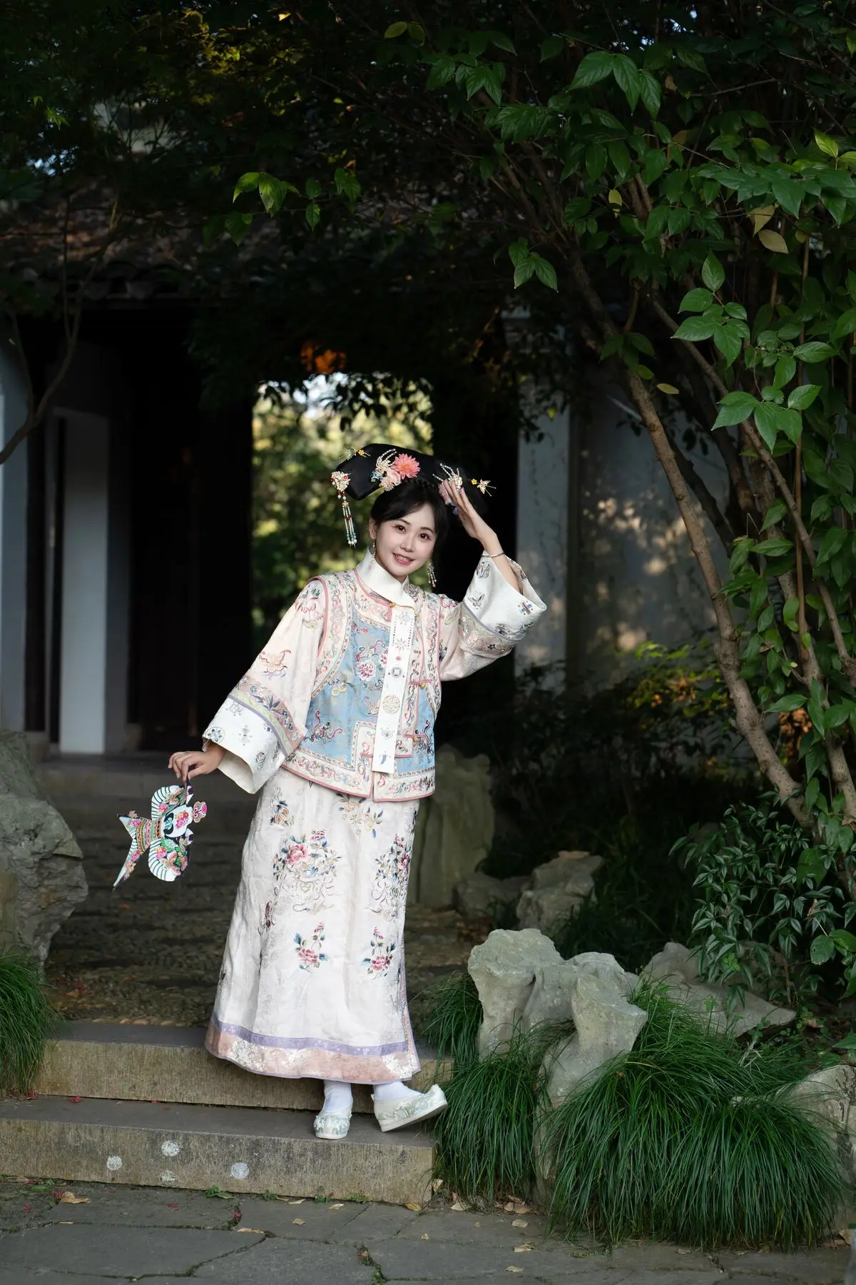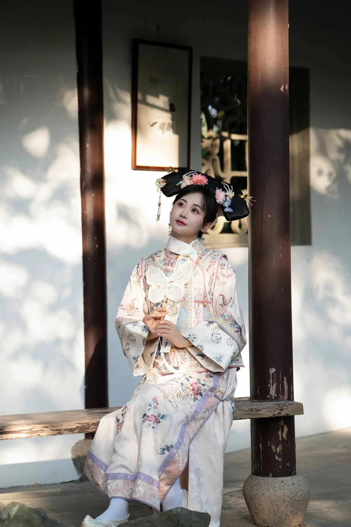 This exquisite image features Jiao Yi Zhi Sui Sui adorned in a breathtaking traditional ancient costume She radiates an elegant and graceful beauty as if stepping directly from a classic tale Her intricately embroidered robe with its delicate floral patterns and soft color palette creates a harmonious and luxurious appeal The elaborate headpiece and the finely hand-embroidered fan she holds further accentuate her regal demeanor Jiao Yi Zhi Sui Sui's gentle gaze and subtle smile convey a sense of timeless serenity and classic charm The entire scene evokes a rich East Asian cultural ambiance captivating viewers with its perfect blend of artistic fashion and natural allure