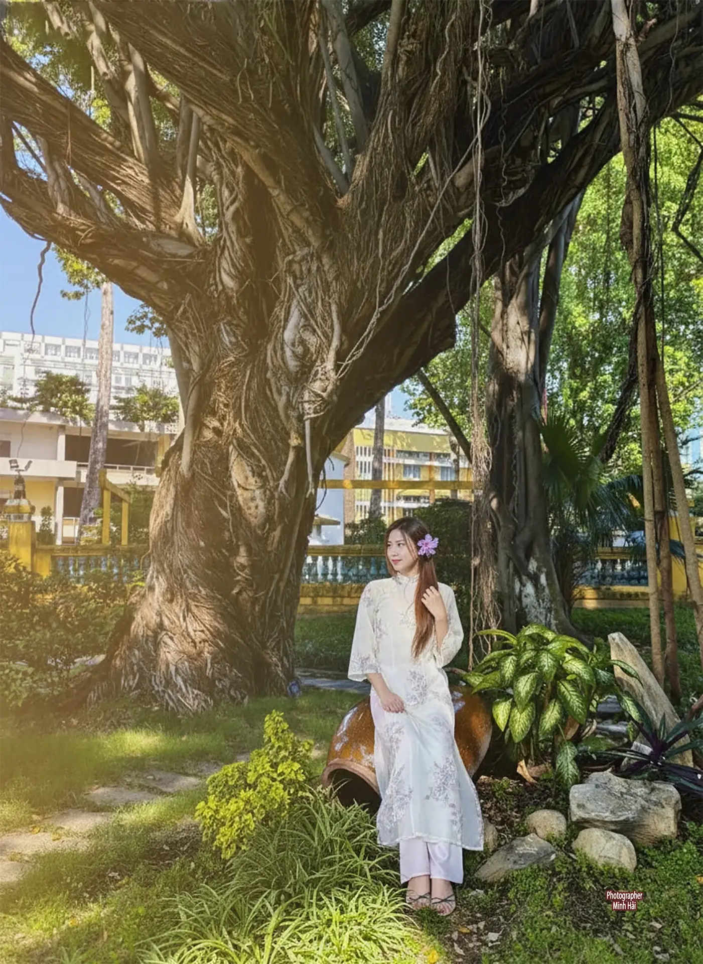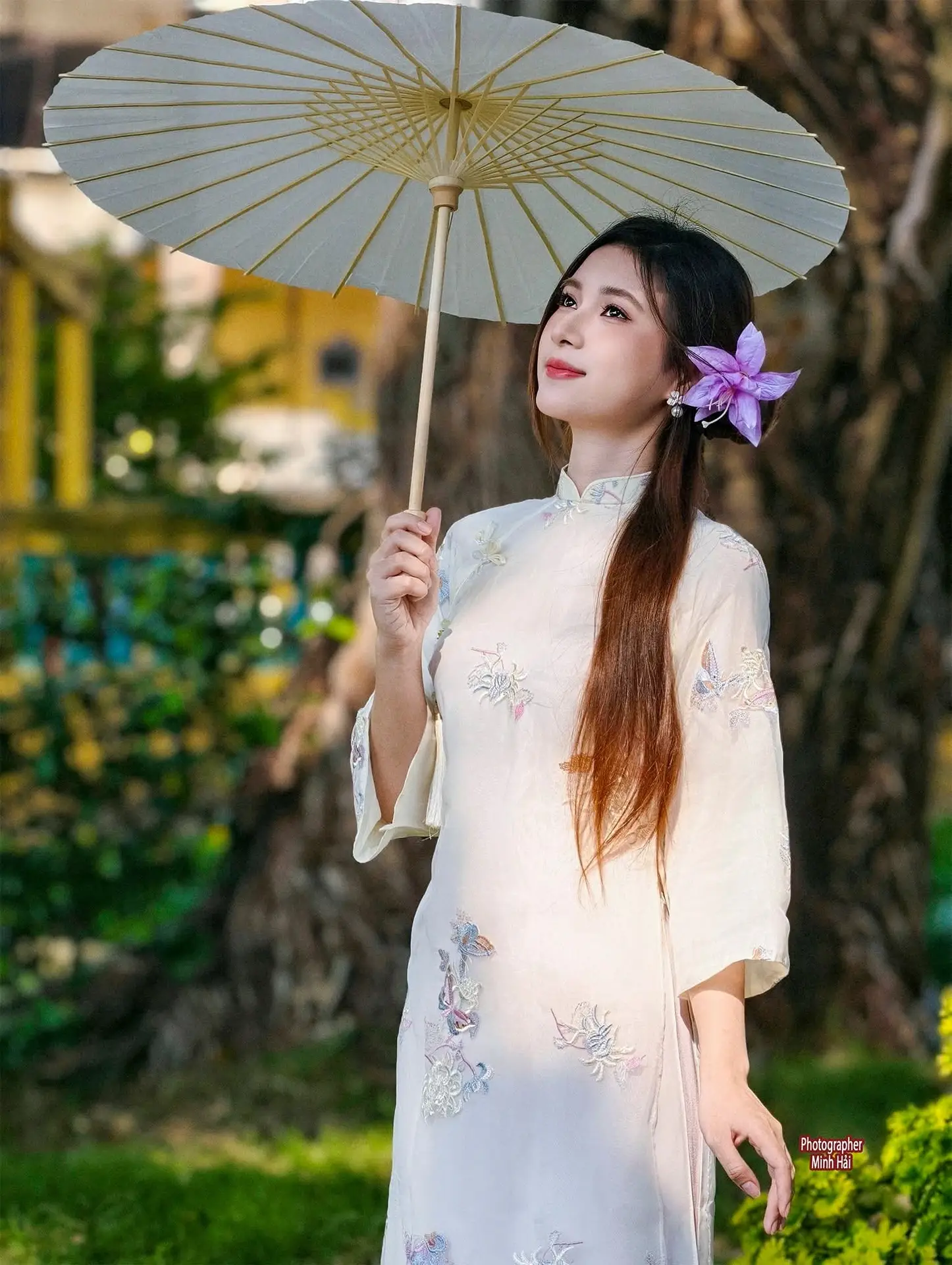 This stunning photograph captures the exquisite beauty of a graceful Vietnamese girl in a pristine white Ao Dai. The traditional dress adorned with delicate floral embroidery highlights her elegant and gentle Asian charm. She holds a classic cream-colored paper parasol creating a poetic and nostalgic image. A vibrant purple flower tucked into her long dark hair adds to her shy and captivating allure. The lush green backdrop of trees and nature further accentuates her pure and ethereal beauty. This is more than just a picture it is a celebration of traditional culture a harmonious blend of human grace and picturesque natural scenery. A serene and emotional moment captured forever.#AoDai #VietnameseBeauty #TraditionalDress #Elegant #AsianCulture