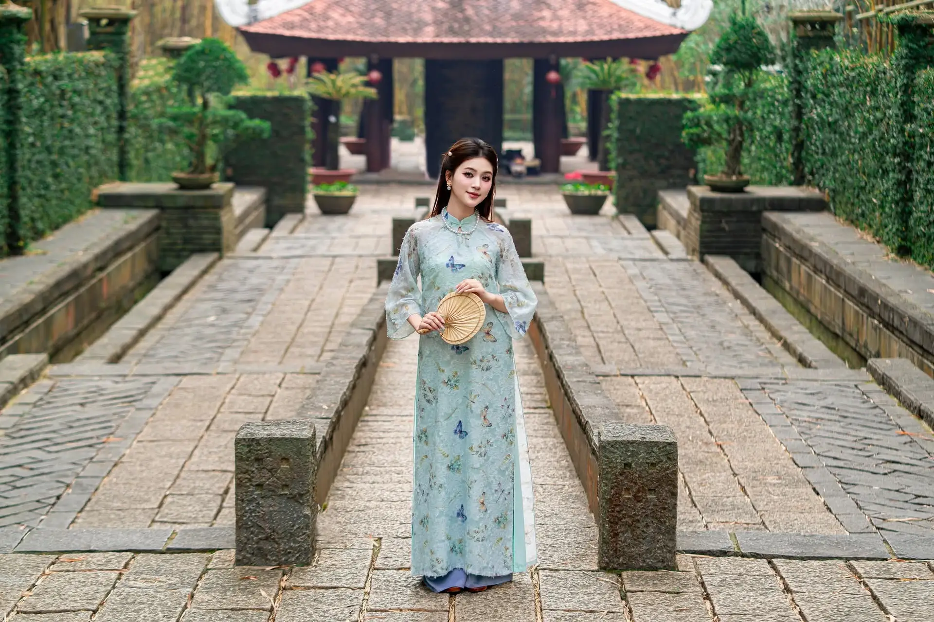 This photograph beautifully captures the elegant and graceful charm of a young woman embodying the gentle beauty of an East Asian lady. She wears a flowing light blue Ao Dai adorned with delicate butterfly patterns creating a sense of lightness and ethereal beauty. In her hands she gently holds a traditional fan a cultural symbol lending her an alluring blend of classic and modern aesthetics. The backdrop is a serene natural landscape featuring tall lush bamboo trees and a neatly trimmed hedge. The entire image is a harmonious blend of traditional attire and a peaceful natural setting evoking a poetic cultural space that allows viewers to feel a sense of tranquility and timeless beauty.#AoDai #VietnameseBeauty #TraditionalDress #BambooForest #AsianCulture