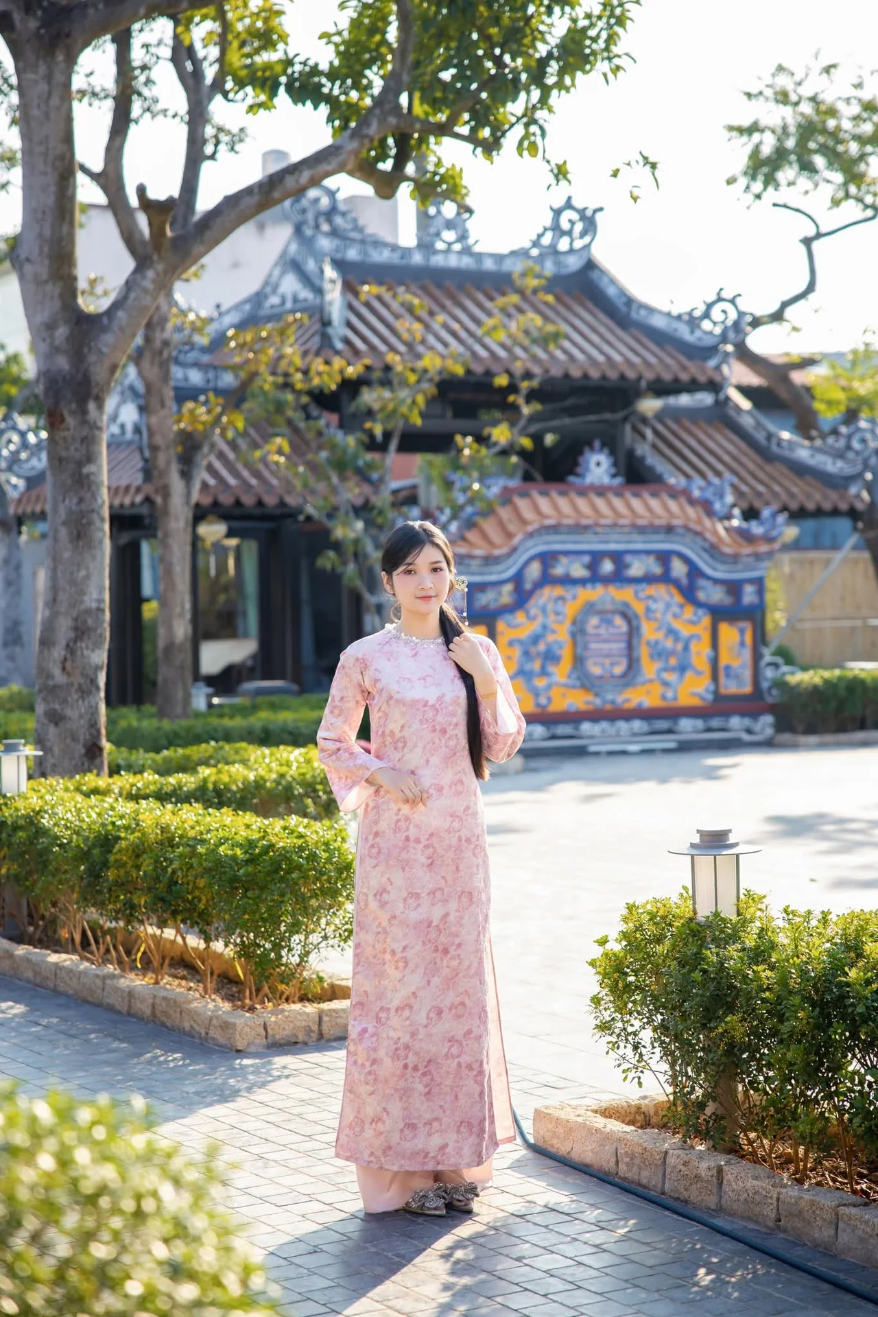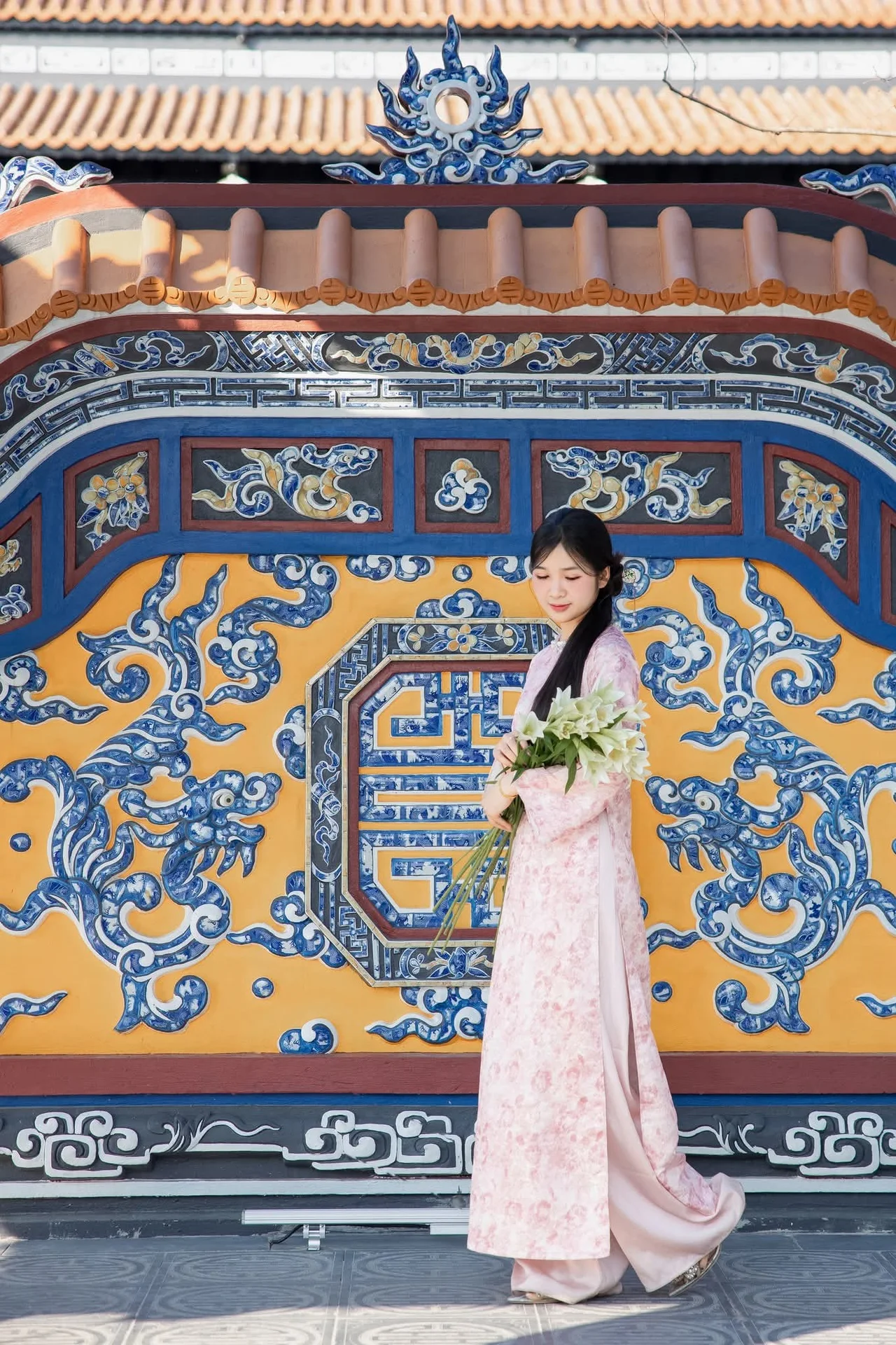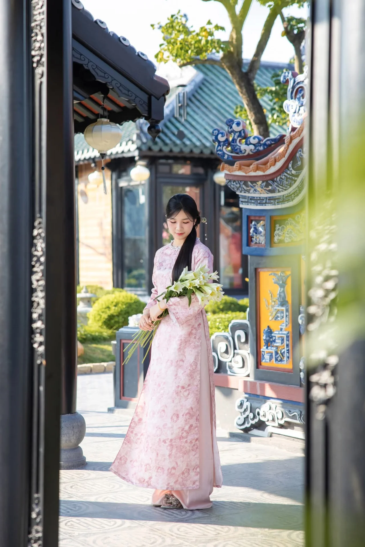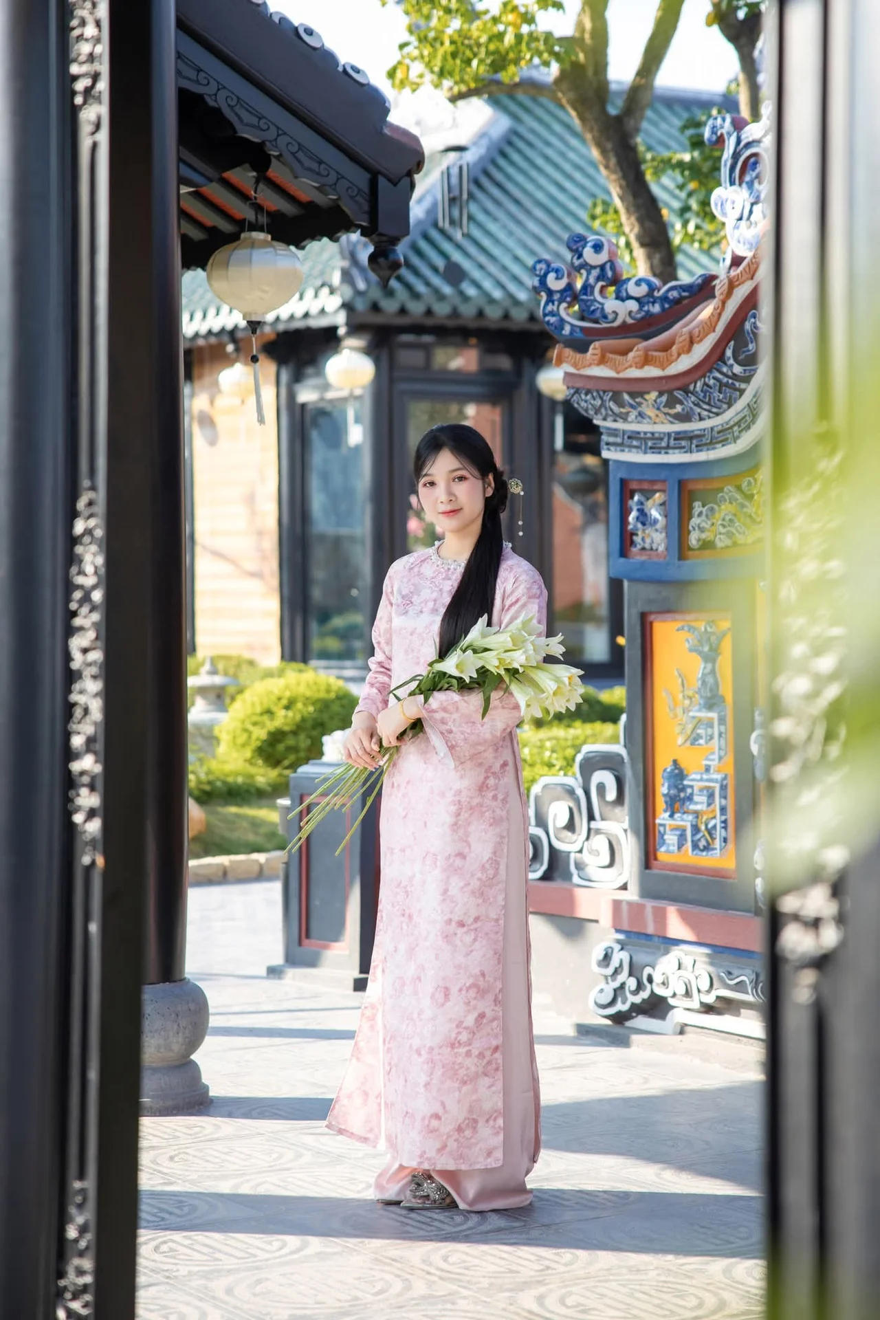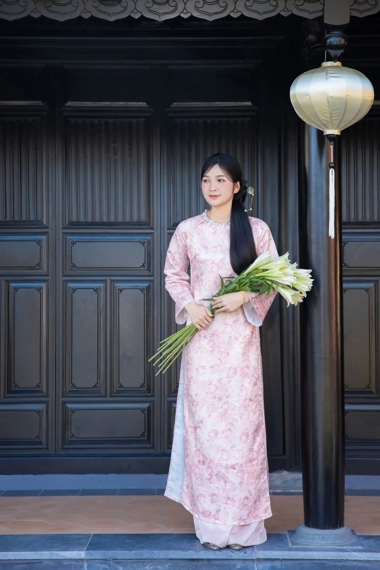 This stunning photograph captures a graceful East Asian young woman adorned in a delicate pink Ao Dai featuring intricate floral patterns. She gently holds a beautiful bouquet of pristine white lilies symbolizing purity and serene beauty. The background showcases ancient traditional architecture rich with cultural heritage creating a harmonious and picturesque scene where human elegance meets natural tranquility. Her long dark hair and soft inviting smile further accentuate her refined and elegant appearance. This image beautifully embodies grace nobility and the timeless allure of traditional beauty. She truly appears like a blooming flower in a peaceful enchanting garden.#AoDai #Beauty #TraditionalDress #AsianCulture #WhiteLilies #ElegantWoman