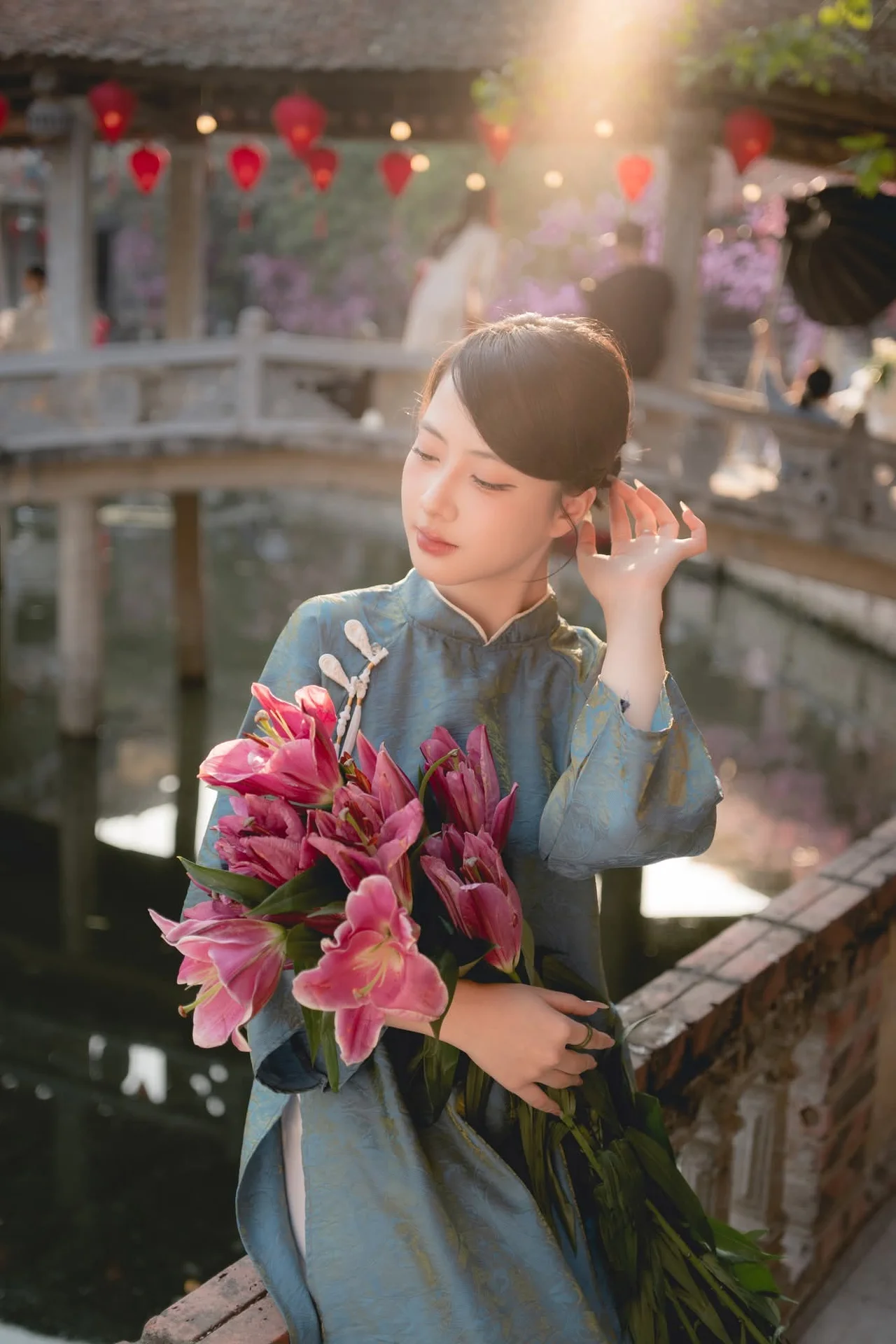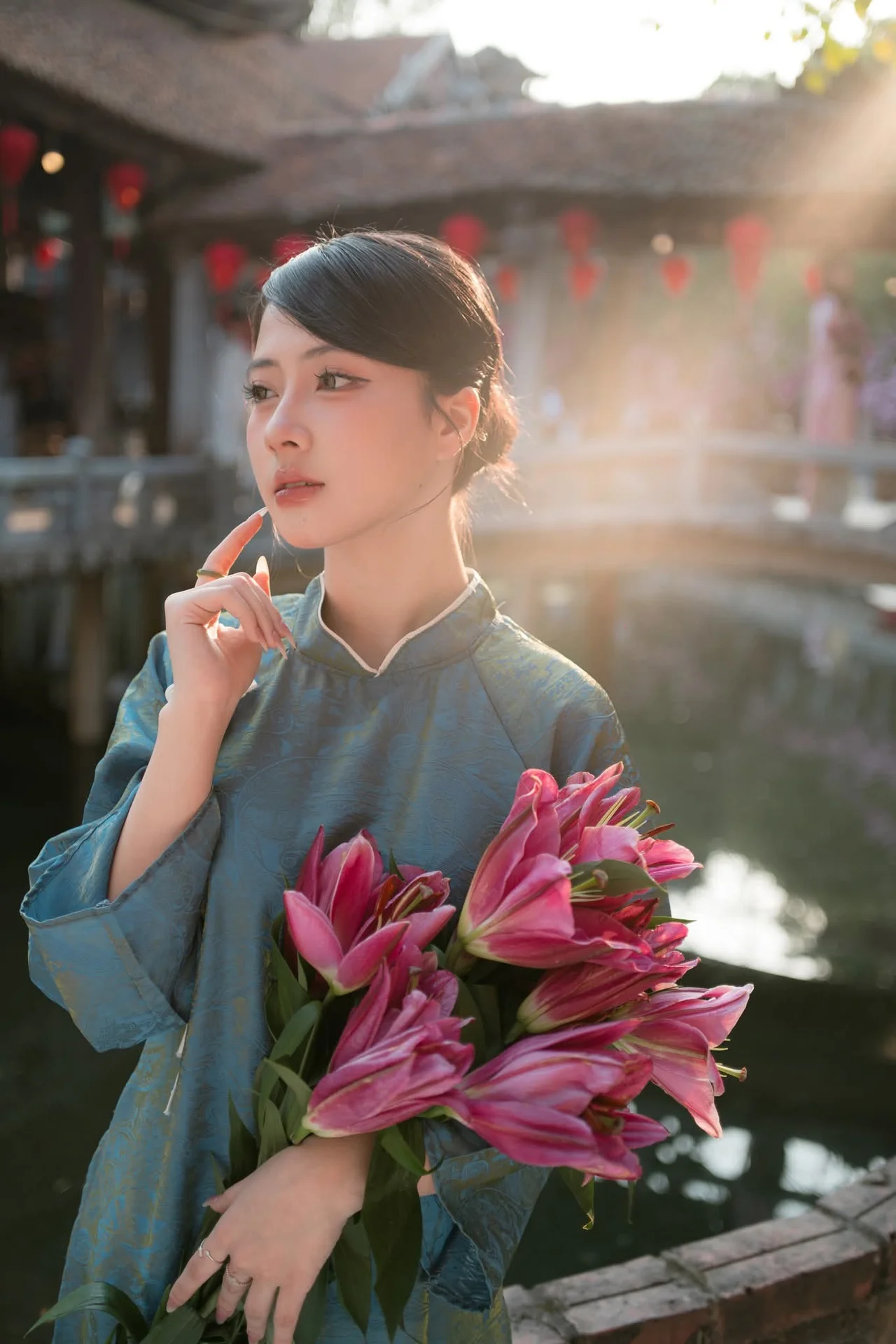 This captivating image captures a poetic moment of a young woman dressed in a stunning neo-traditional Vietnamese outfit. The teal-colored silk dress, featuring delicate handcrafted buttons and a flowing silhouette, exudes a sense of timeless sophistication and nostalgic charm. Her gaze is soft and contemplative, perfectly complementing the vibrant pink lilies she carries, creating a beautiful artistic contrast against the cool tones of her attire. Bathed in the warm, golden glow of the late afternoon sun, the setting evokes the serene atmosphere of an ancient Vietnamese village, complete with weathered tiled roofs and a tranquil wooden bridge. It is more than just a fashion shot; it is a visual symphony between human grace and cultural heritage, where minimalist yet refined styling takes center stage. Her natural aura and the thoughtful composition highlight an ethereal beauty, inviting viewers to pause and immerse themselves in this peaceful and romantic narrative of Asian elegance and visual storytelling.#VietnameseCulture #TraditionalFashion #TravelVietnam #FineArtPhotography #AsianElegance