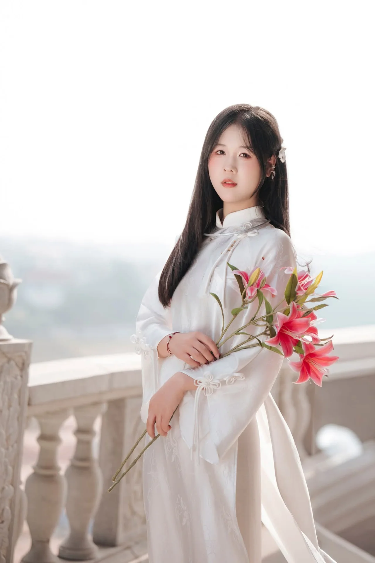 This image beautifully captures a young Vietnamese woman gracefully adorned in a pristine white Ao Dai a timeless symbol of traditional beauty and elegance She gently cradles a bouquet of vibrant pink lilies creating a delicate yet captivating contrast against the pure white of her attire Her serene gaze and soft smile exude the pure and ethereal charm of an East Asian woman The outdoor setting bathed in natural light enhances her graceful and modest demeanor evoking a sense of tranquility and nostalgia for enduring cultural values This photograph perfectly embodies the harmonious blend of contemporary allure and rich traditional heritage#AoDai #VietnameseBeauty #TraditionalDress #LilyFlowers #AsianElegance
