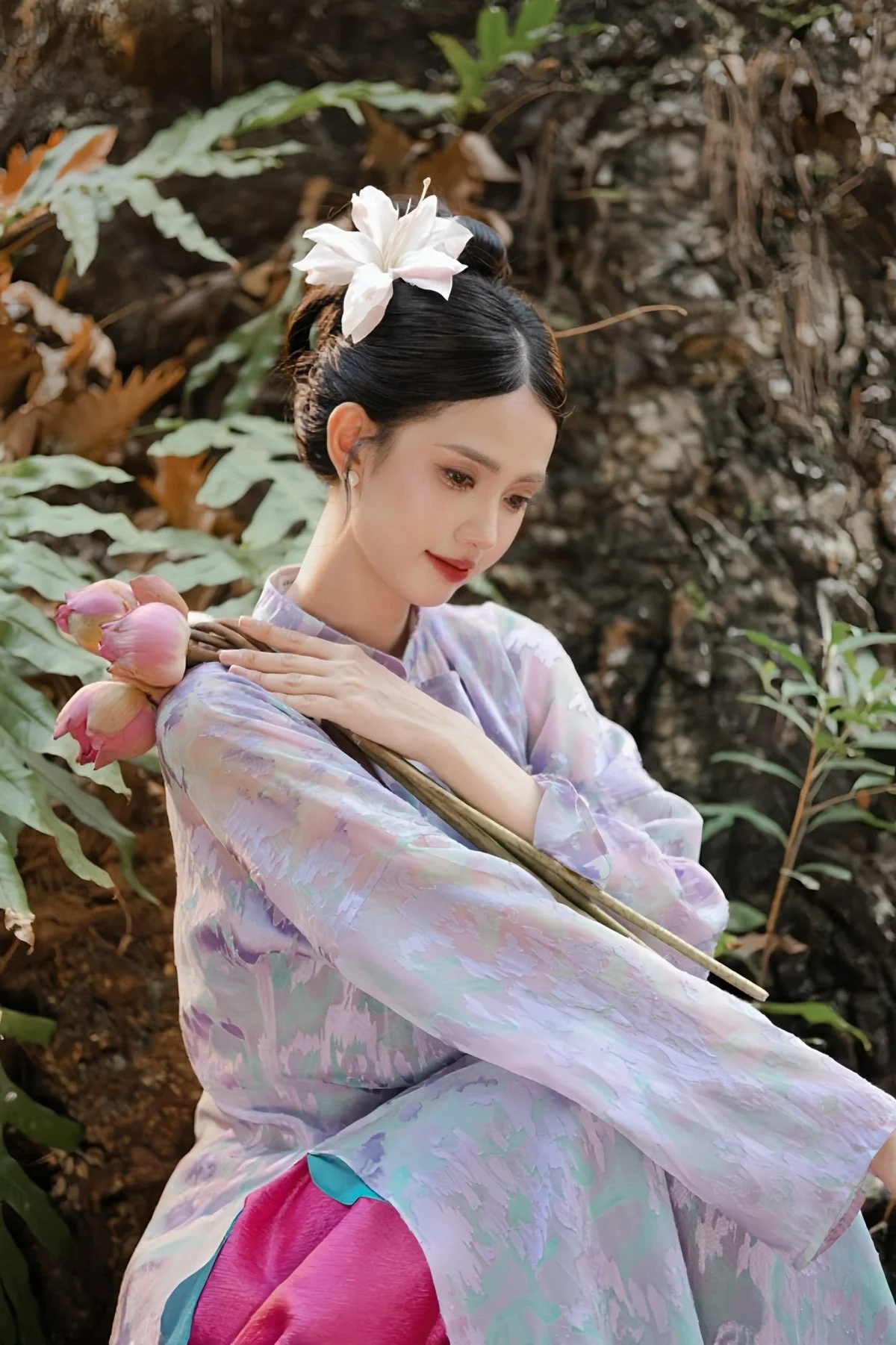 Elegant Vietnamese Maiden in Áo Dài Amidst Serene Nature's Embrace