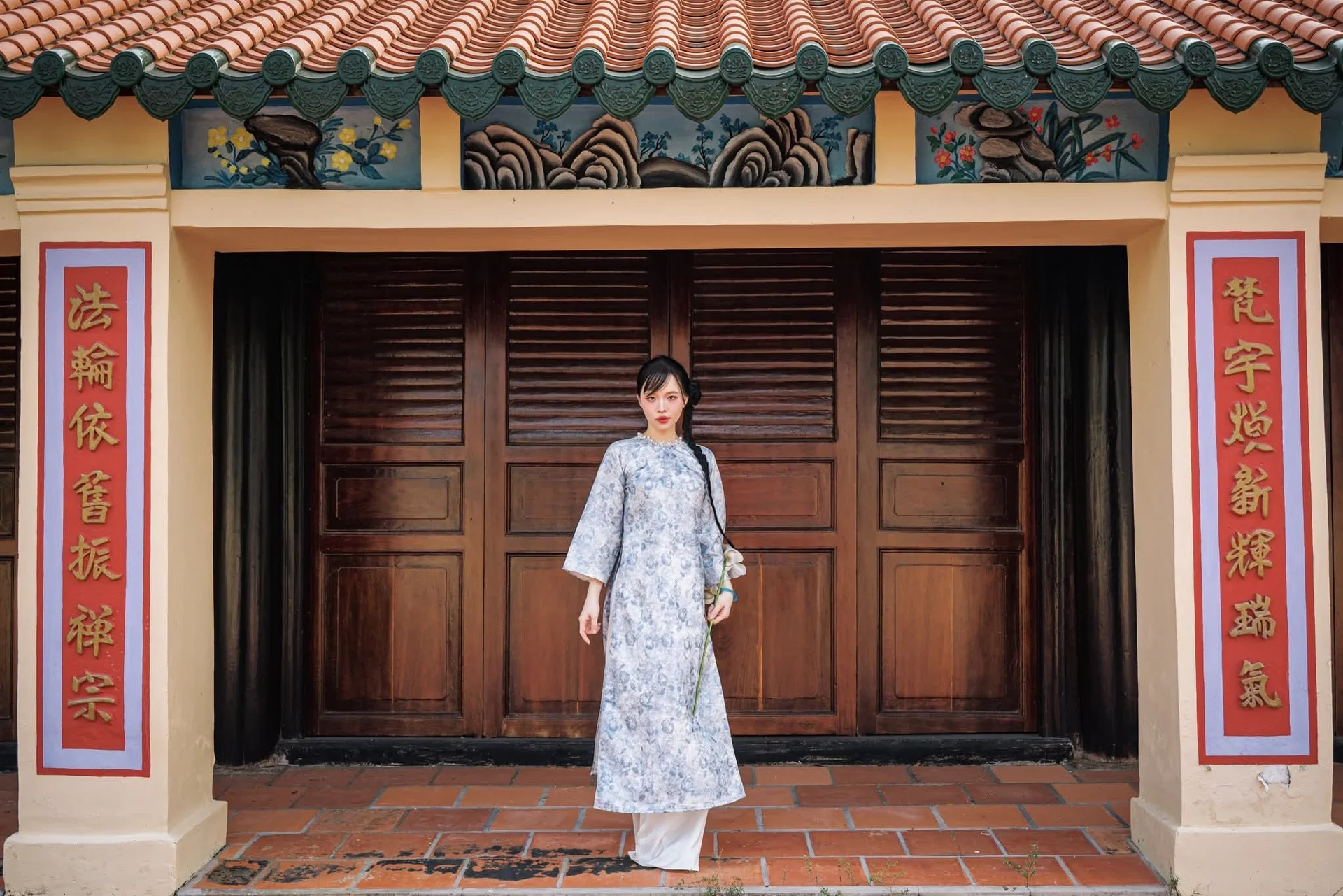 Stepping into the serene atmosphere of a traditional Vietnamese temple, one cannot help but be captivated by the poetic beauty of the Ao Dai. This ensemble, featuring delicate blue floral patterns reminiscent of vintage porcelain, flows gracefully against the warm tones of ancient terracotta tiles. The choice of fabric and the soft silhouette reflect a sophisticated aesthetic that bridges the gap between heritage and modern style. The long, meticulously braided hair adds a touch of classic charm, emphasizing a gentle and pensive demeanor. Every detail, from the soft light filtering through the wooden pillars to the relaxed posture of the muse, evokes a sense of nostalgia and peace. It is a visual journey back to a time of quiet elegance, where fashion becomes a storytelling medium for cultural identity. This look is a testament to how traditional attire remains a symbol of enduring beauty and artistic inspiration in the modern world.#Vietnamese #AoDai #VintageVibe #CulturalHeritage #AsianElegance #TravelPhotography