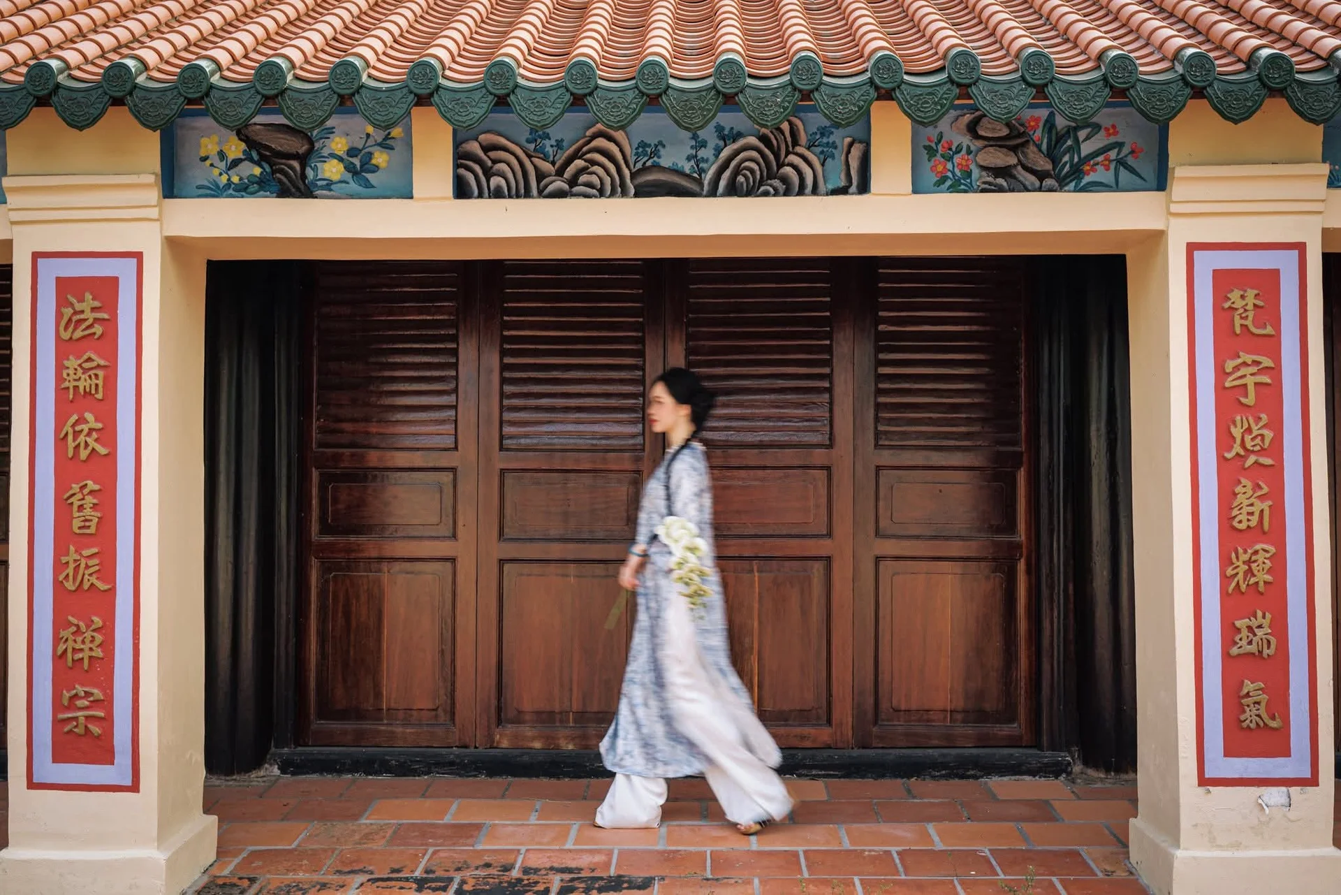 Timeless Grace in Blue Floral Ao Dai and Ancient Architecture
