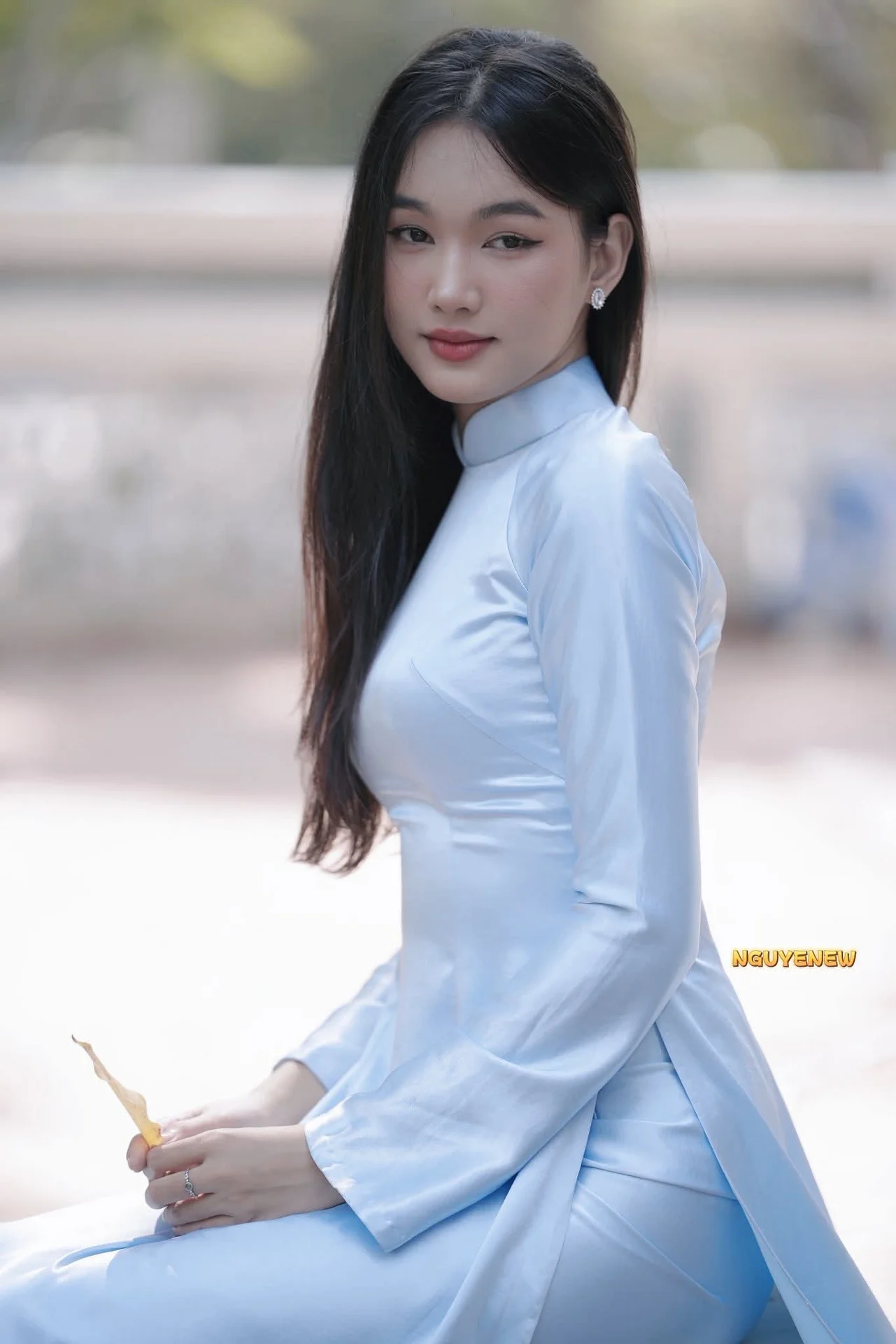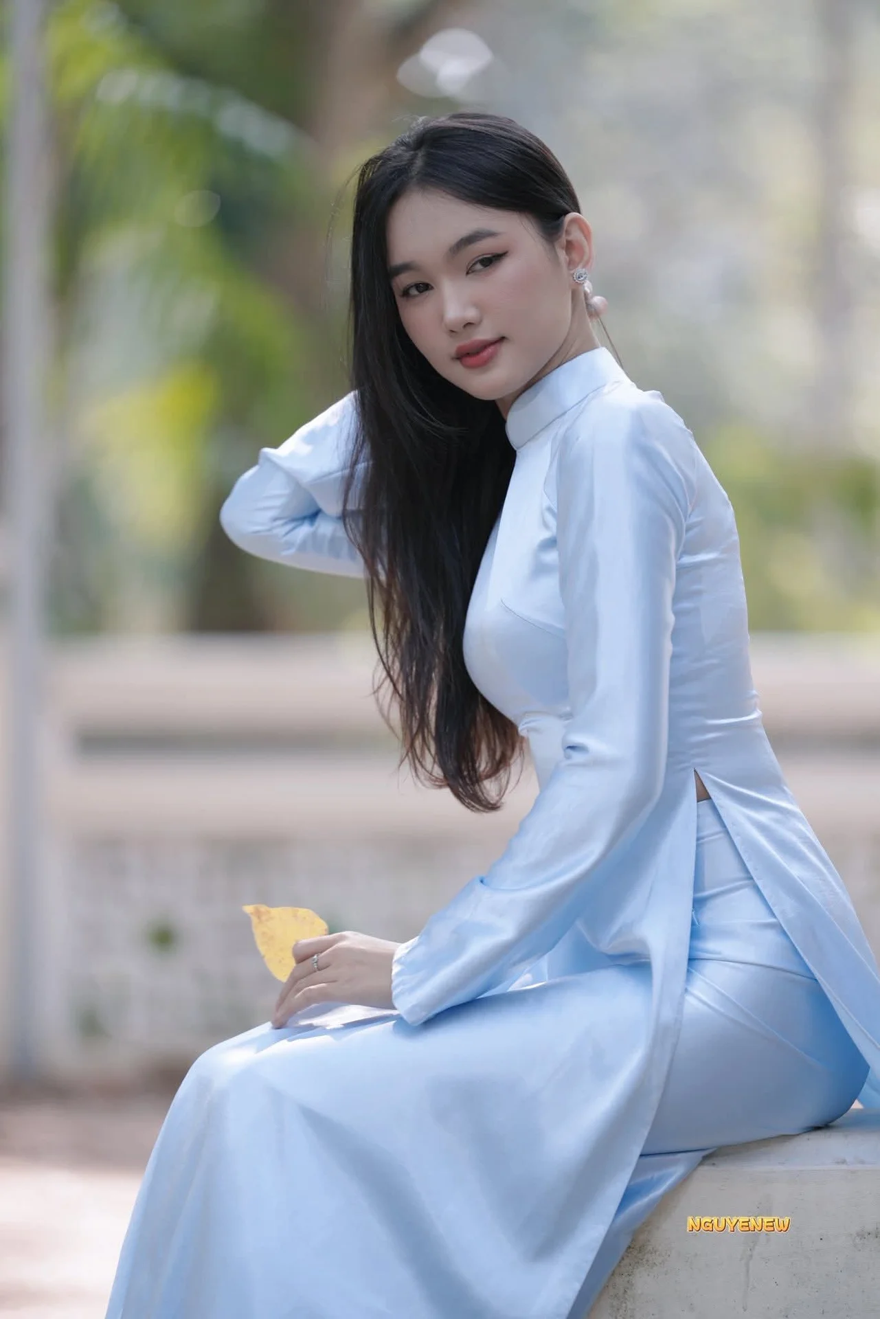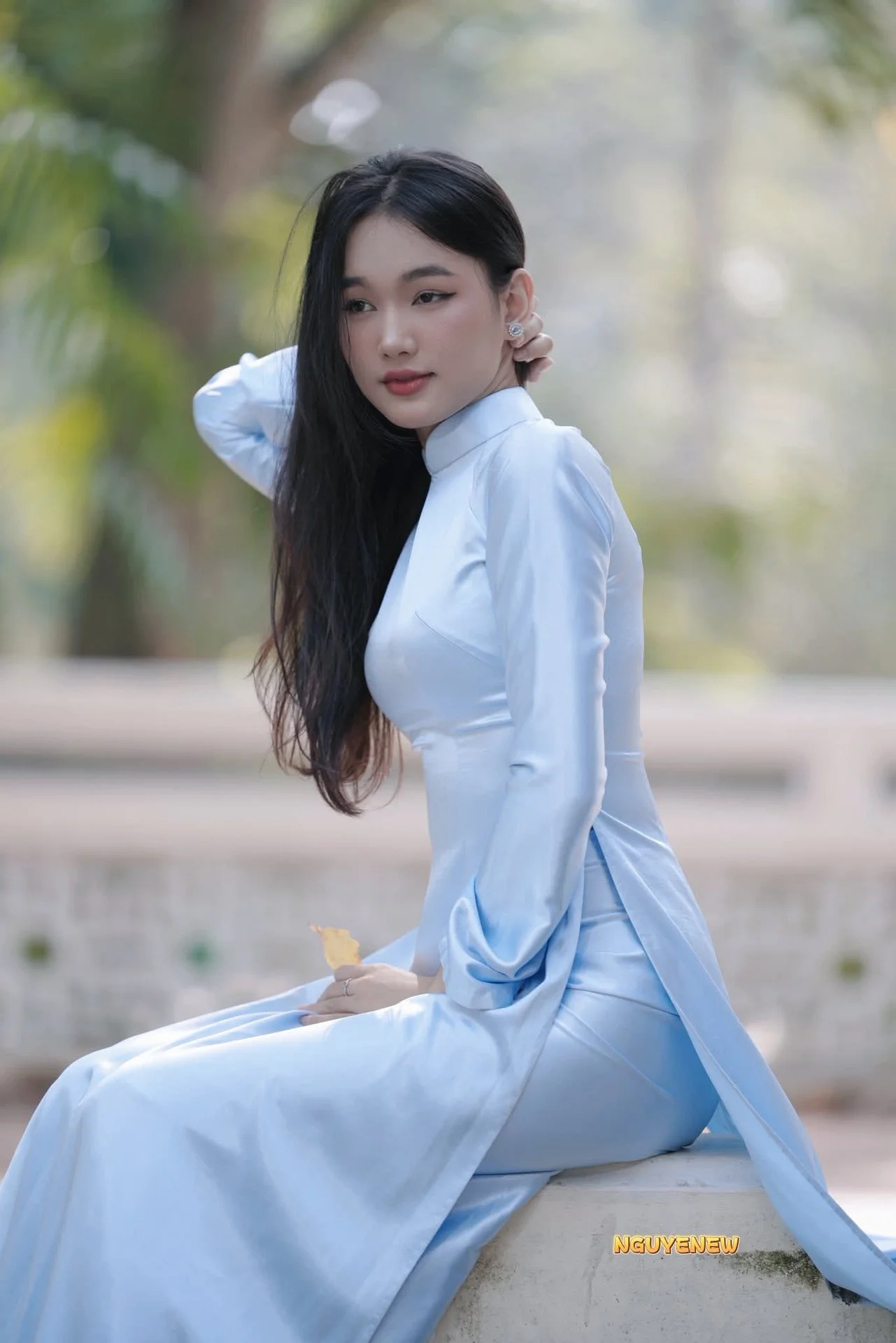 This photo beautifully captures the gentle and elegant charm of a Vietnamese maiden adorned in a delicate pastel blue Áo Dài The traditional dress crafted from sheer ethereal fabric with subtle patterns gracefully enhances her slender figure and inherent grace Holding a traditional hand fan and adorned with a charming butterfly hair clip she embodies a pure East Asian beauty blending classic allure with contemporary elegance Her dreamy gaze directed towards the distance suggests profound thoughts amidst the lush greenery and tranquil waters of the natural setting The picturesque landscape further accentuates her serene and ethereal beauty evoking a sense of peace and romance#Aodai #Beauty #VietnameseCulture #TraditionalDress #NaturePortrait #AsianElegance