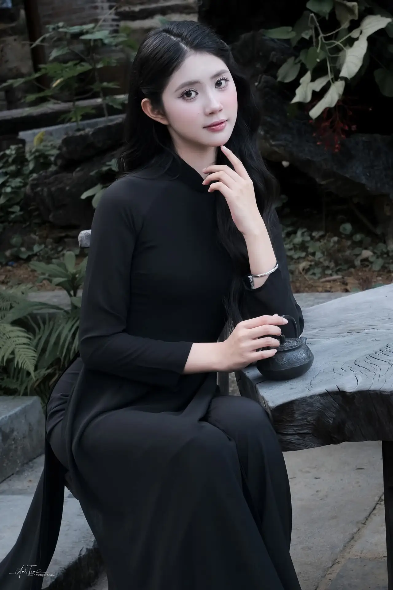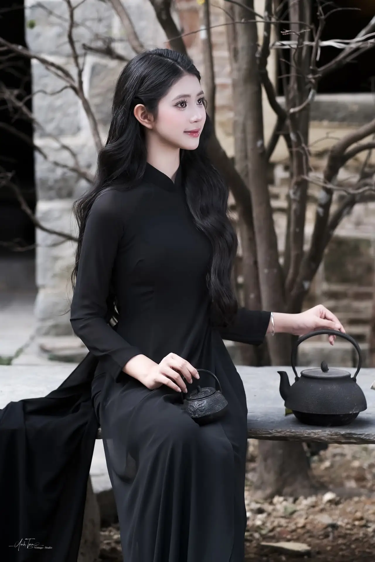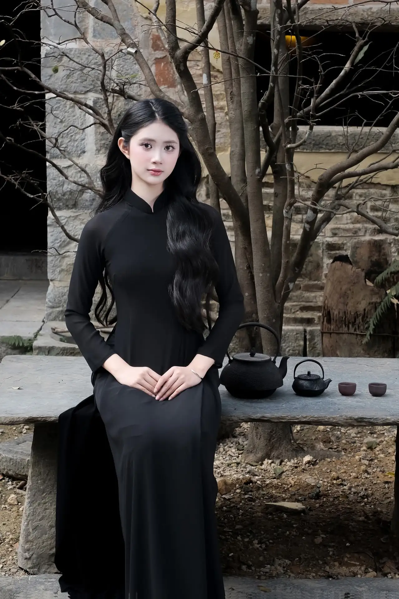 This image beautifully captures the ethereal charm of a young Asian woman adorned in a traditional black Ao Dai, a timeless symbol of sophistication and modesty. Her flowing long hair, gentle smile, and clear eyes exude an irresistible grace and elegance. Seated delicately on an ancient stone ledge, her hand softly touching her hair, she creates a moment of poetic tranquility. The blurred background, featuring antique ceramic pots, evokes a traditional cultural setting, further highlighting the classic beauty and youthful allure of the subject. This is more than just a portrait; it is a tribute to the pure, gentle beauty of Vietnamese women, a harmonious blend of tradition and captivating modern grace.#BlackAoDai #VietnameseBeauty #AsianElegance #TraditionalDress #VietCulture