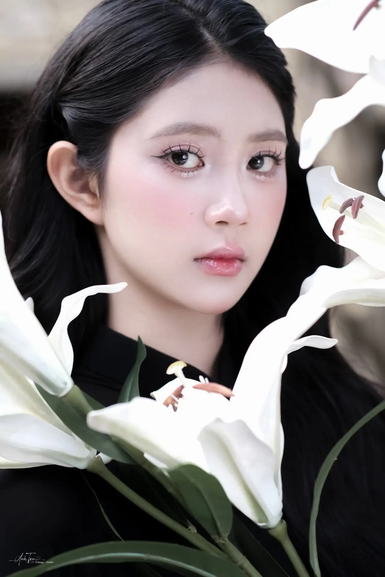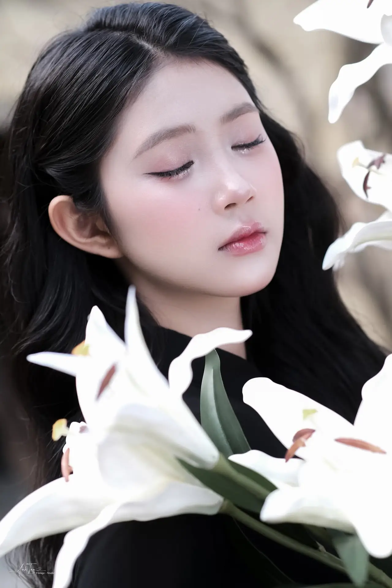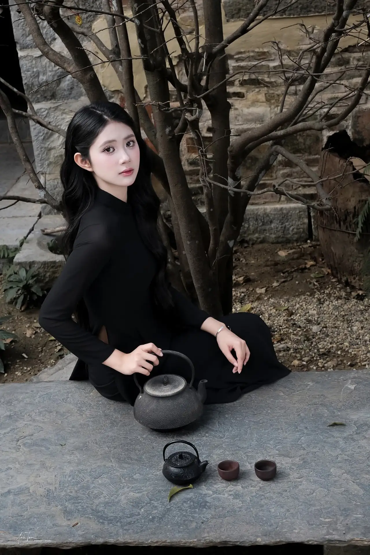 This image beautifully captures the ethereal charm of a young Asian woman adorned in a traditional black Ao Dai, a timeless symbol of sophistication and modesty. Her flowing long hair, gentle smile, and clear eyes exude an irresistible grace and elegance. Seated delicately on an ancient stone ledge, her hand softly touching her hair, she creates a moment of poetic tranquility. The blurred background, featuring antique ceramic pots, evokes a traditional cultural setting, further highlighting the classic beauty and youthful allure of the subject. This is more than just a portrait; it is a tribute to the pure, gentle beauty of Vietnamese women, a harmonious blend of tradition and captivating modern grace.#BlackAoDai #VietnameseBeauty #AsianElegance #TraditionalDress #VietCulture