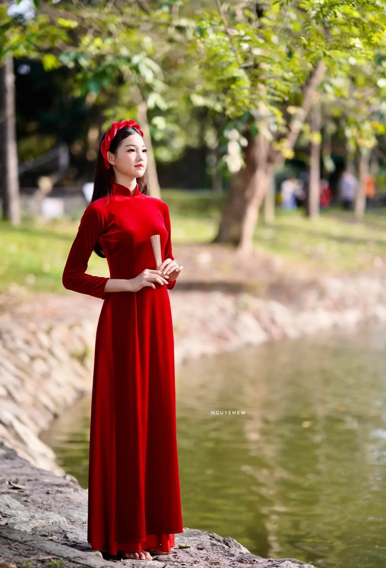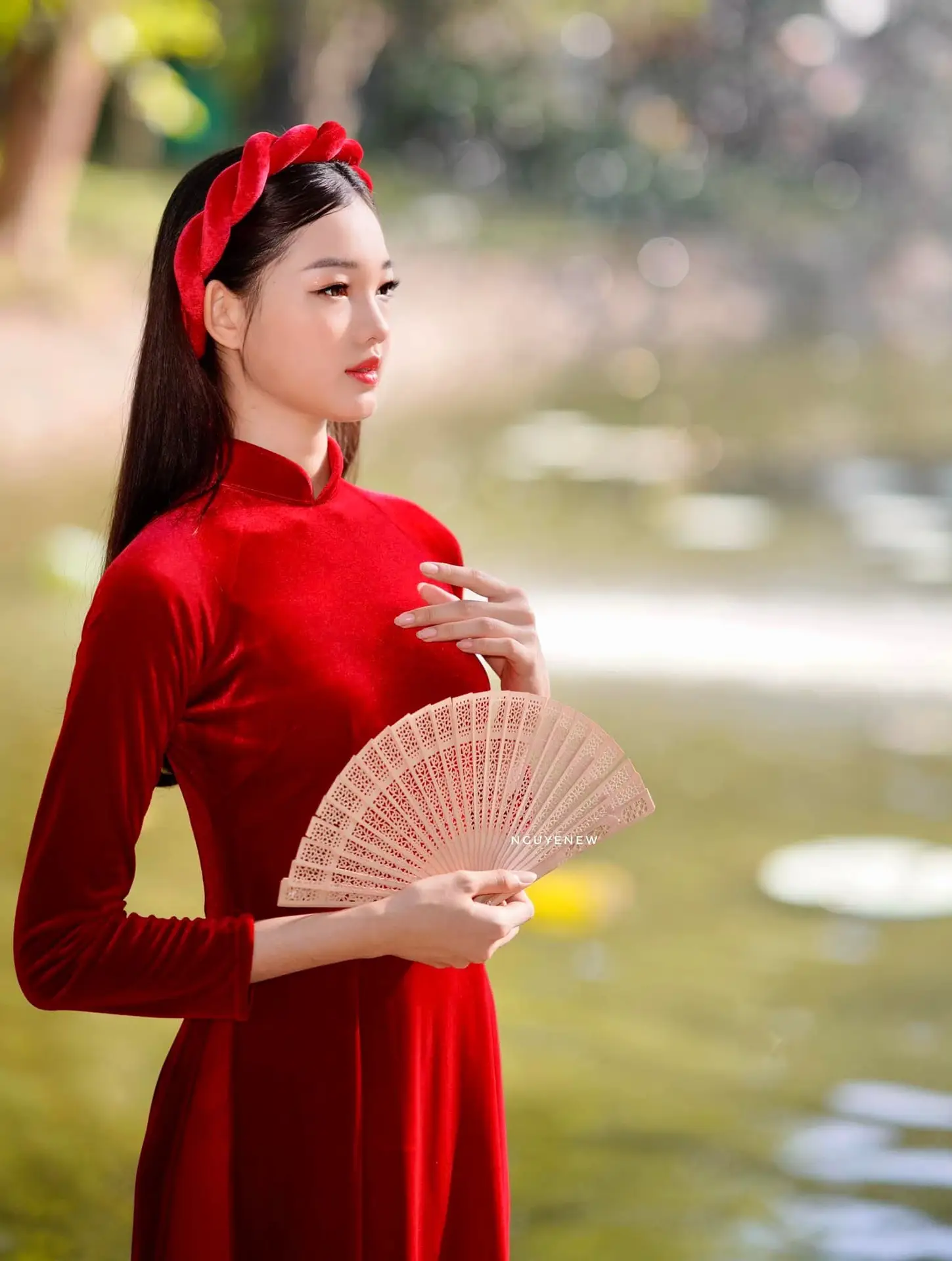 This stunning image captures a graceful Vietnamese young woman adorned in a vibrant red Ao Dai. The luxurious velvet-like fabric exquisitely highlights her elegant and noble demeanor. The radiant red color, symbolizing luck and prominence, beautifully complements the serene green natural backdrop. She delicately holds a traditional hand fan, a subtle cultural emblem, creating a harmonious blend of classic and contemporary beauty. Her dreamy gaze and gentle pose by the calm water exude the characteristic tenderness and modesty of Vietnamese women. More than just a portrait, this photograph celebrates the timeless cultural beauty and enchanting grace of the Vietnamese Ao Dai, evoking feelings of peace and admiration.#RedAoDai #VietnameseBeauty #TraditionalDress #VietCulture #AsianElegance