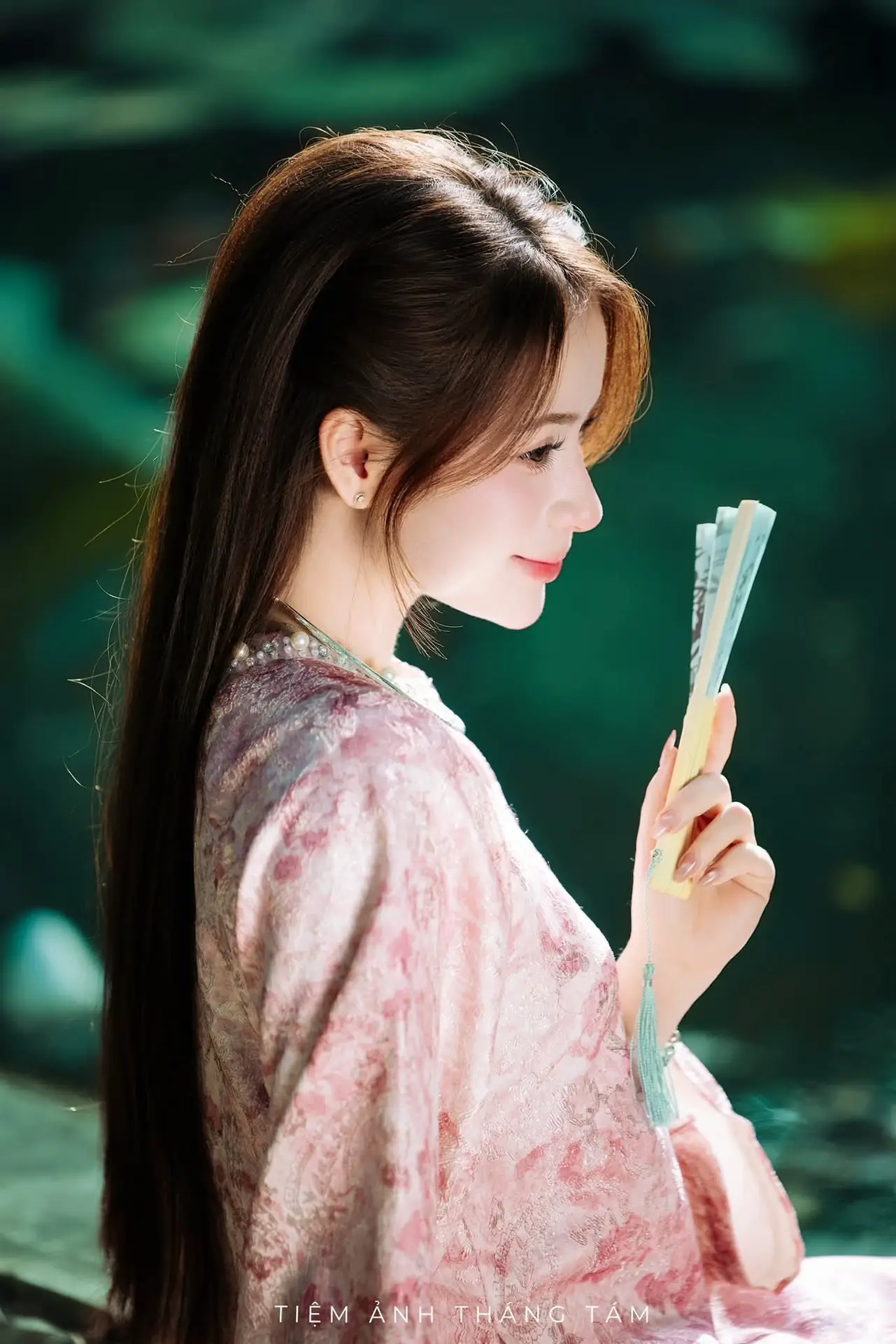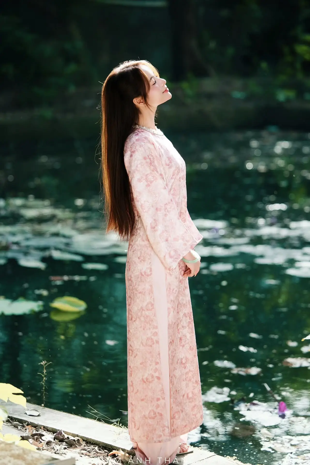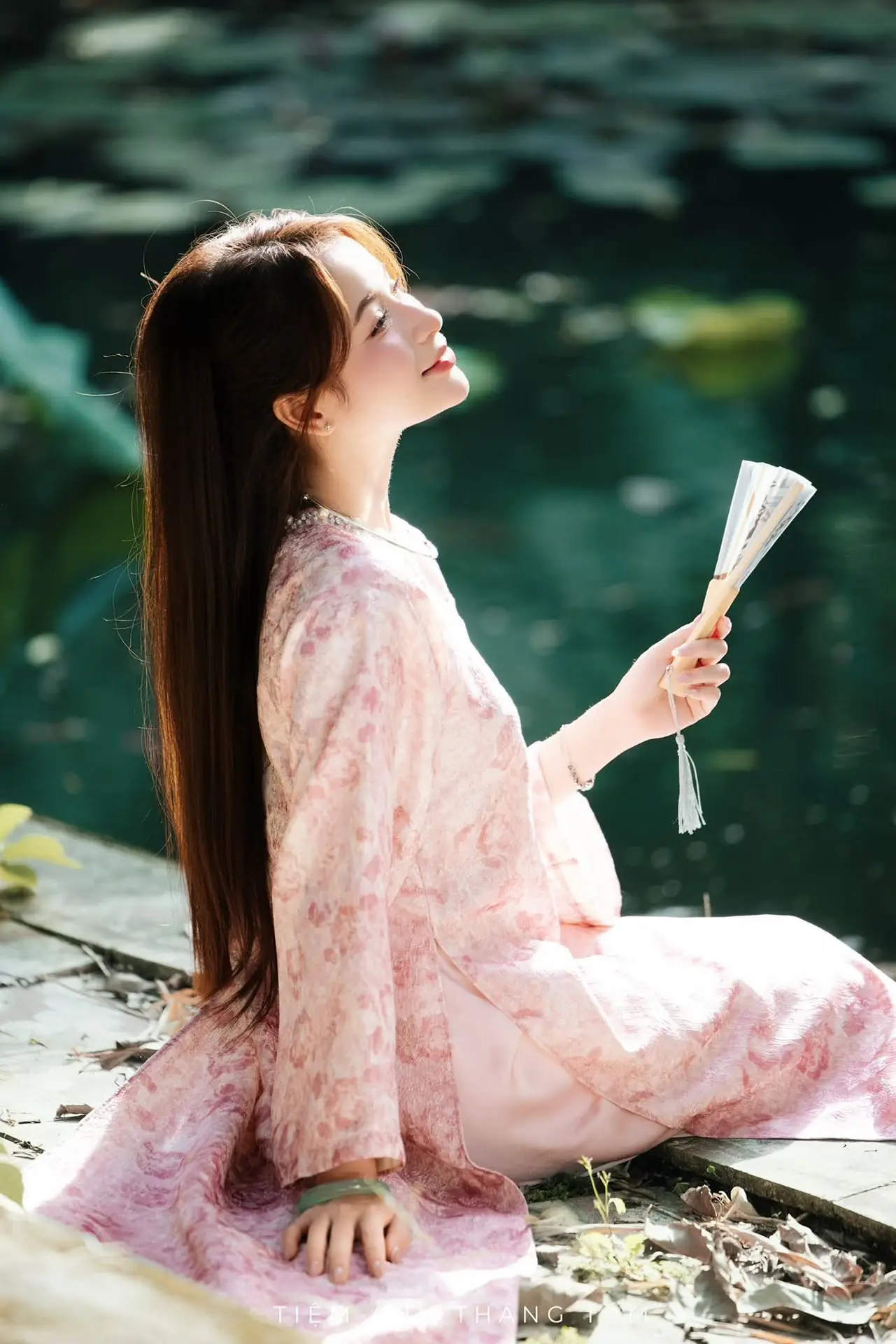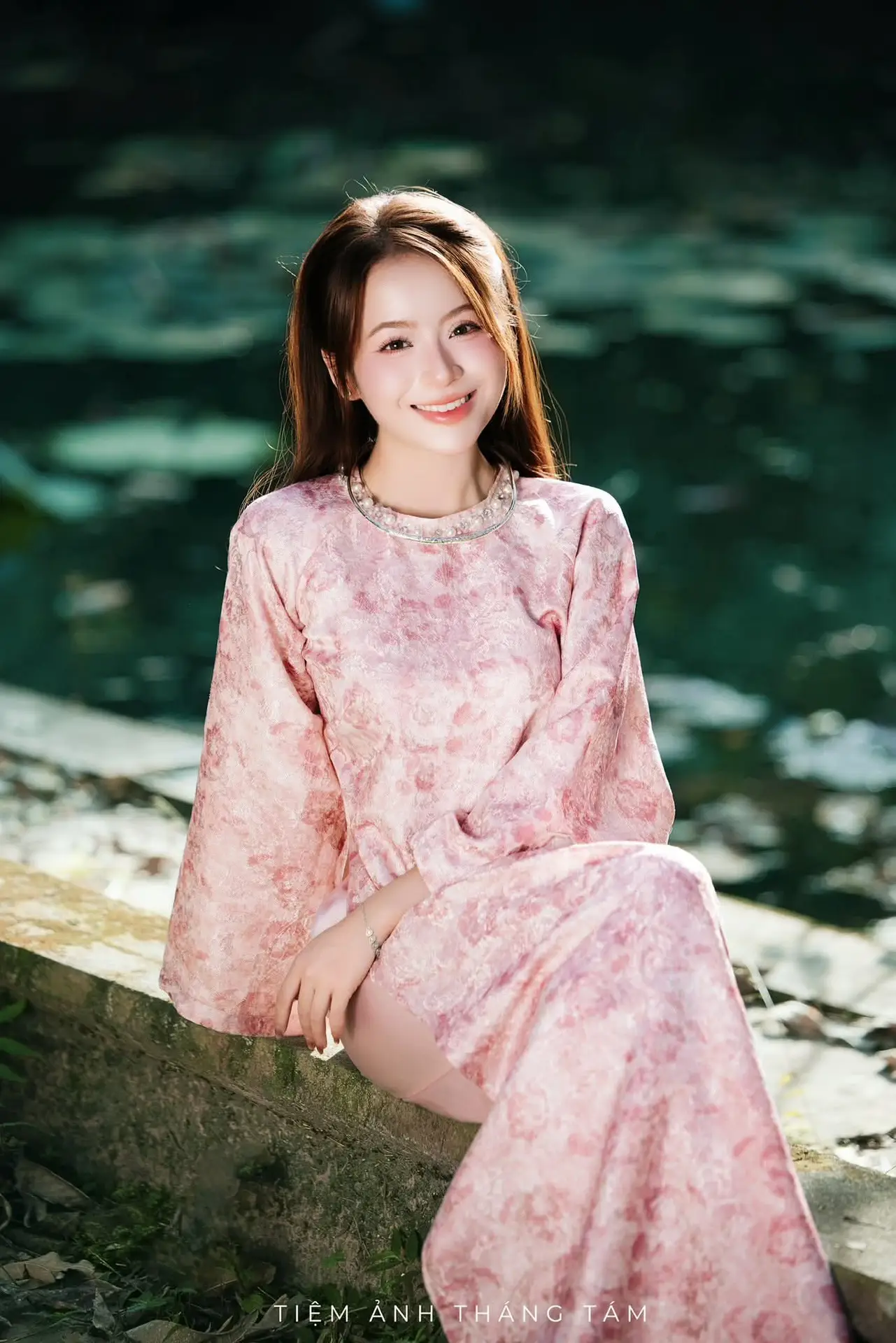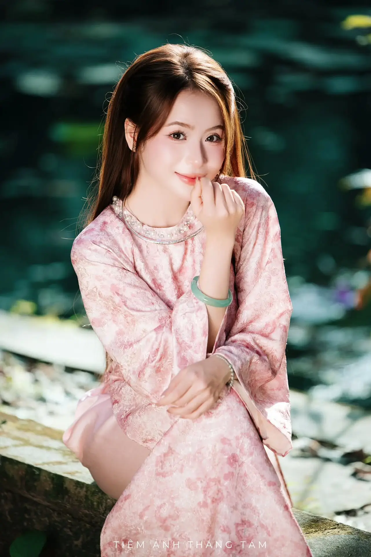 This stunning photo captures the ethereal and gentle beauty of a Vietnamese girl. She is adorned in a traditional pink outfit featuring delicate floral patterns, exuding grace and sophistication. Her soft smile and warm eyes seem to illuminate the surrounding space. Set in a lush natural environment, with gentle light filtering through the leaves, the image of the girl sitting gracefully by the reflective water becomes even more poetic and captivating. A subtle jade bracelet on her wrist adds a refined touch, enhancing her noble and distinctly East Asian allure. The entire photograph is a harmonious blend of human beauty and nature, celebrating the subtle charm, elegance, and traditional cultural identity of Vietnamese women.#VietnameseBeauty #TraditionalAttire #AoDai #PinkDress #AsianElegance #AoDai