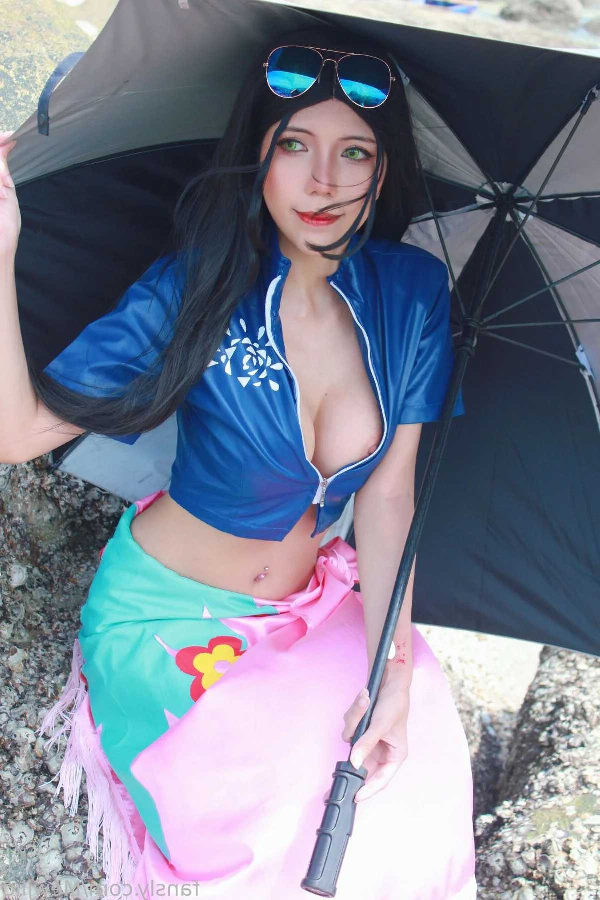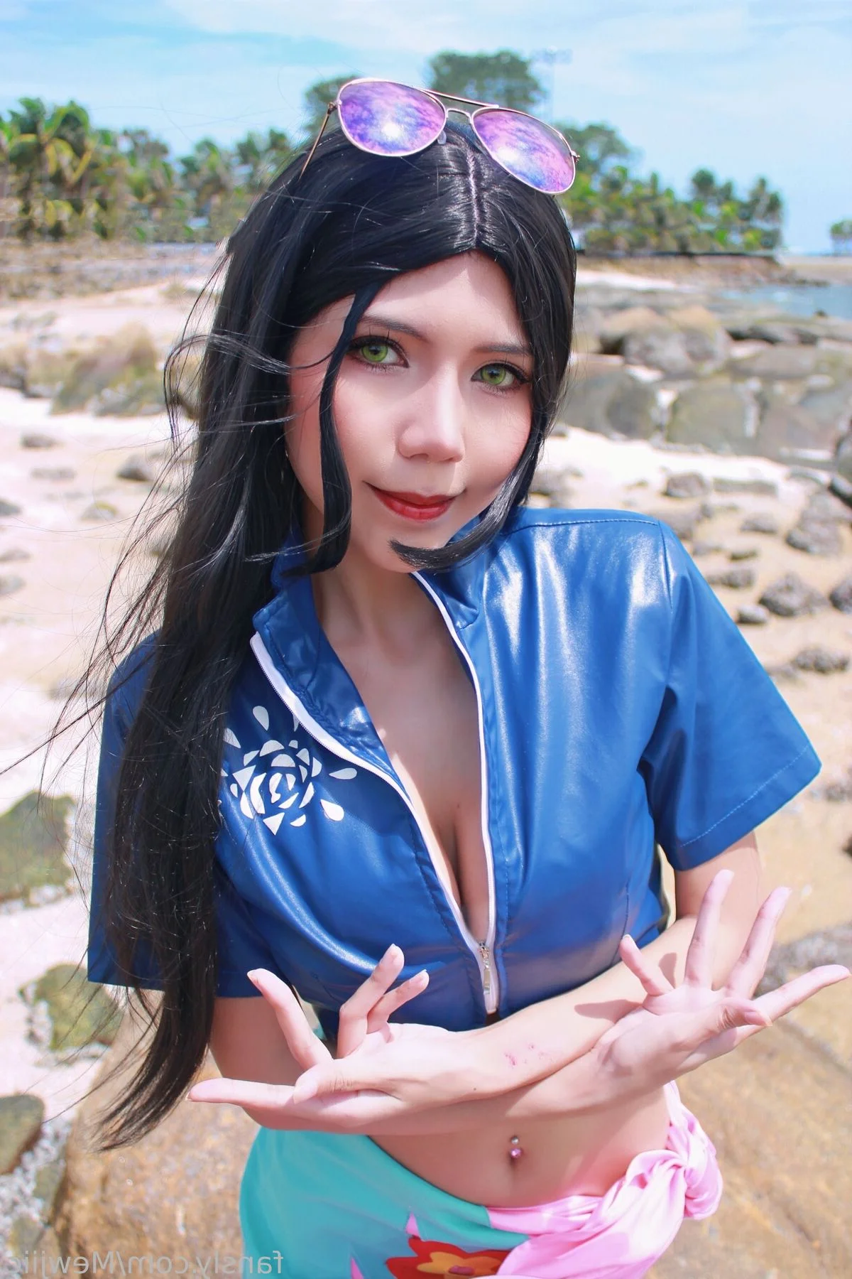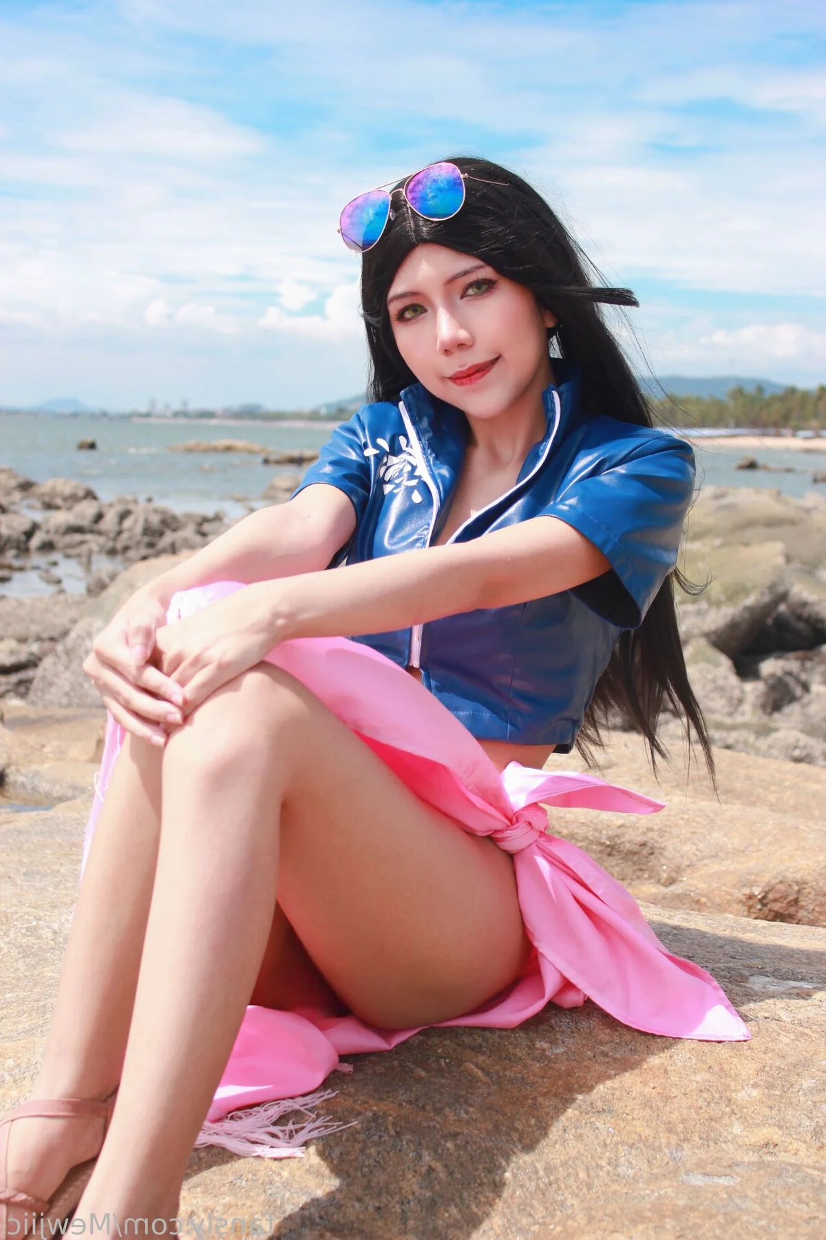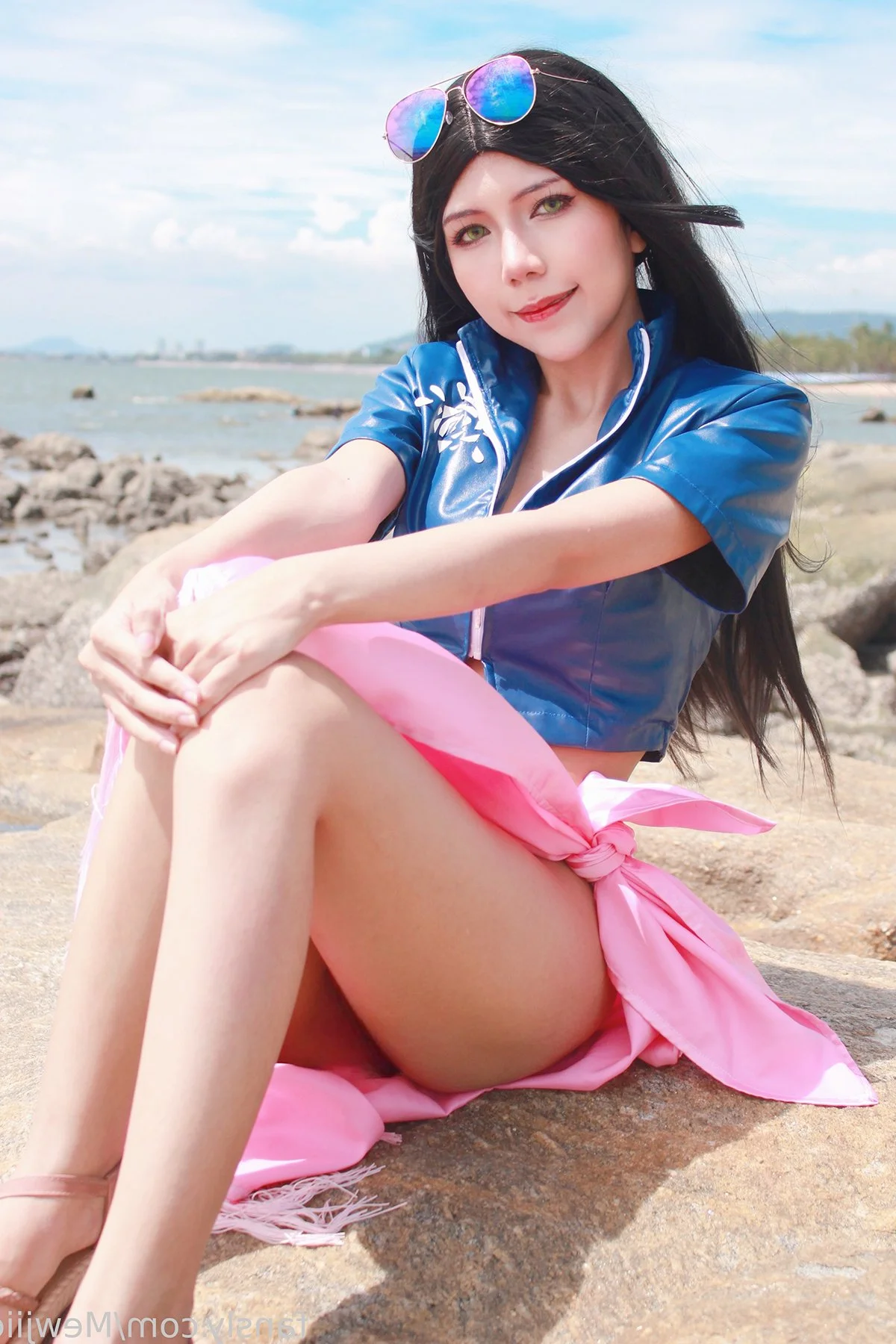 Against the backdrop of crashing waves and golden sunlight, Coser lMusicl brings the iconic archaeologist Nico Robin to life with remarkable elegance and poise. Dressed in the signature deep blue leather vest paired with a flowing pink sarong, the ensemble perfectly captures the beloved character post-timeskip aesthetic, blending boldness with a sophisticated touch of feminine grace. The glossy texture of the vest catches the coastal light beautifully, creating a striking visual contrast against the rugged textures of the seaside rocks and the soft sand. lMusicl embodies the character not just through the meticulous costume, but through a serene gaze and confident body language that hints at a quiet moment during a grand maritime journey. The overall mood is one of artistic adventure, where the vibrant colors of the outfit harmonize with the natural blues and earth tones of the beach. It is a stunning visual tribute to the spirit of exploration, making the viewer feel as though they have stepped directly into a sun-drenched chapter of a high-seas odyssey.#NicoRobin #AnimeCosplay #BeachPhotography #lMusiclCosplay #TravelVibes