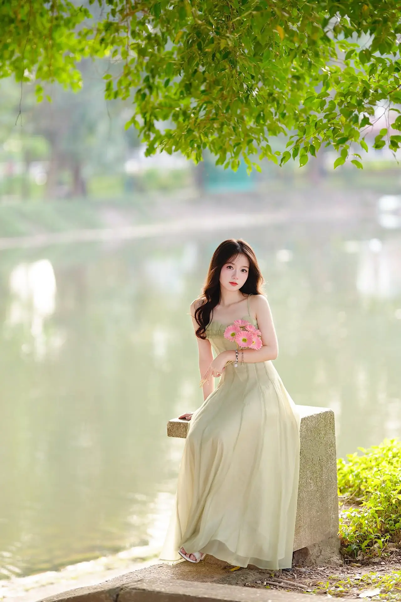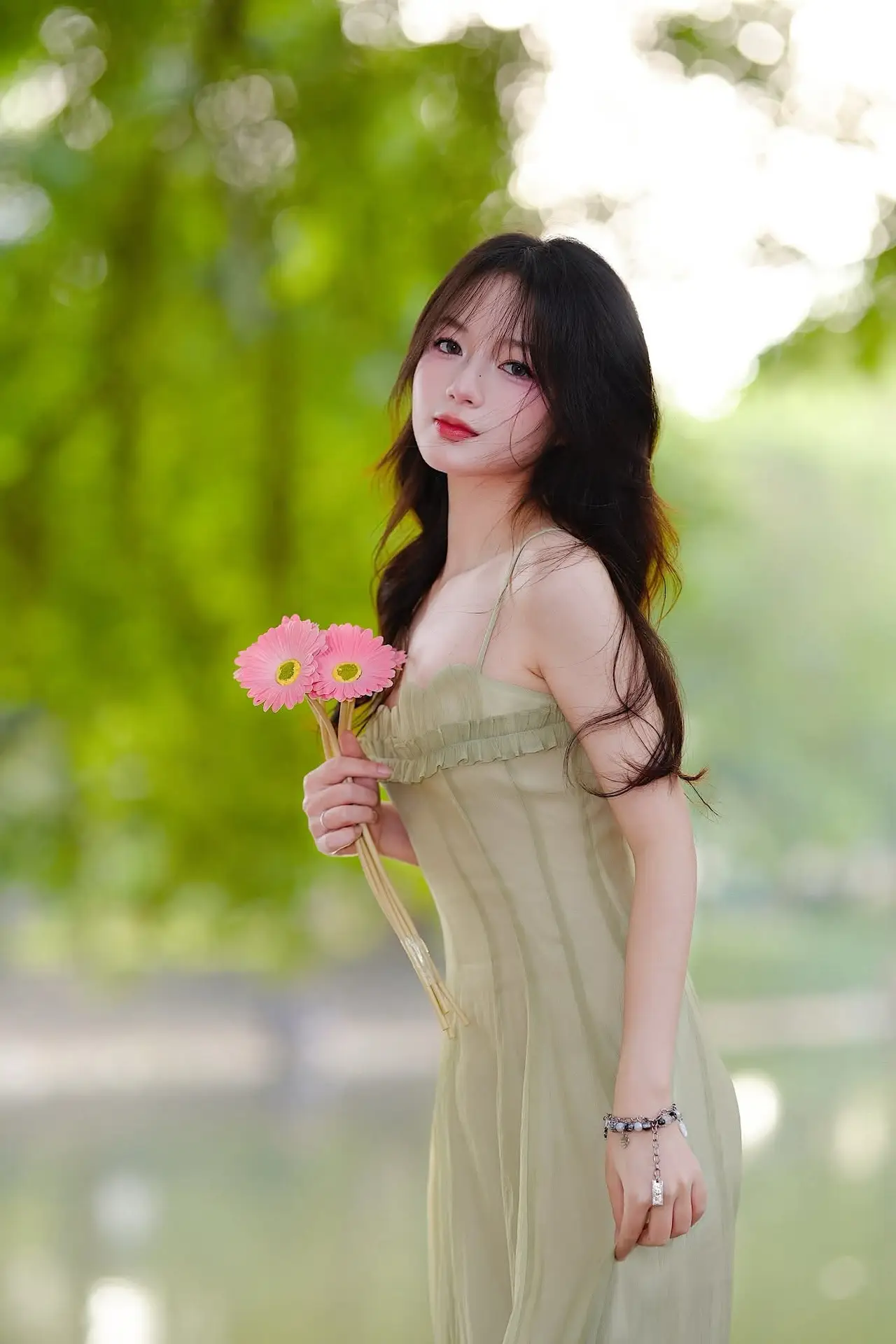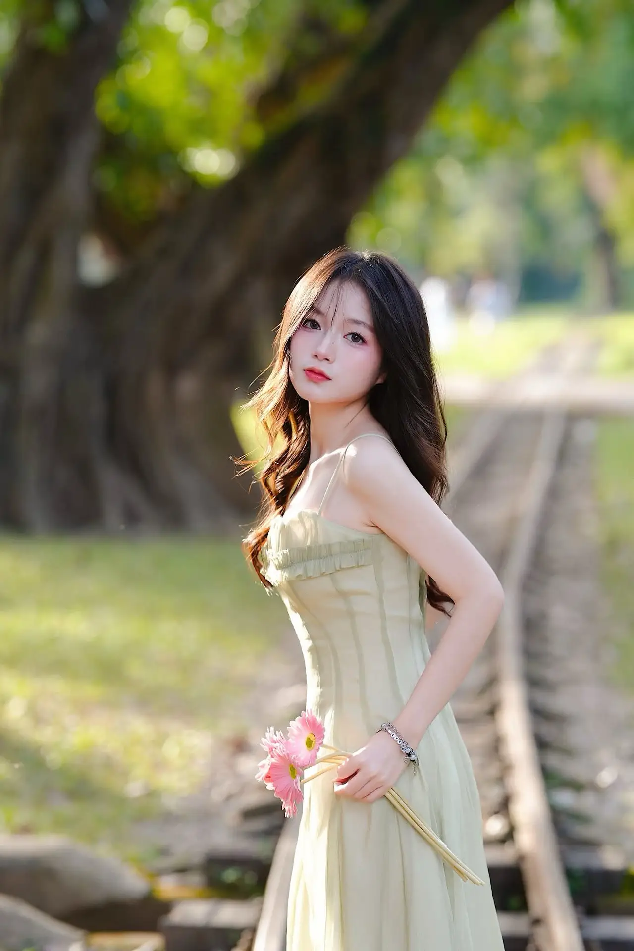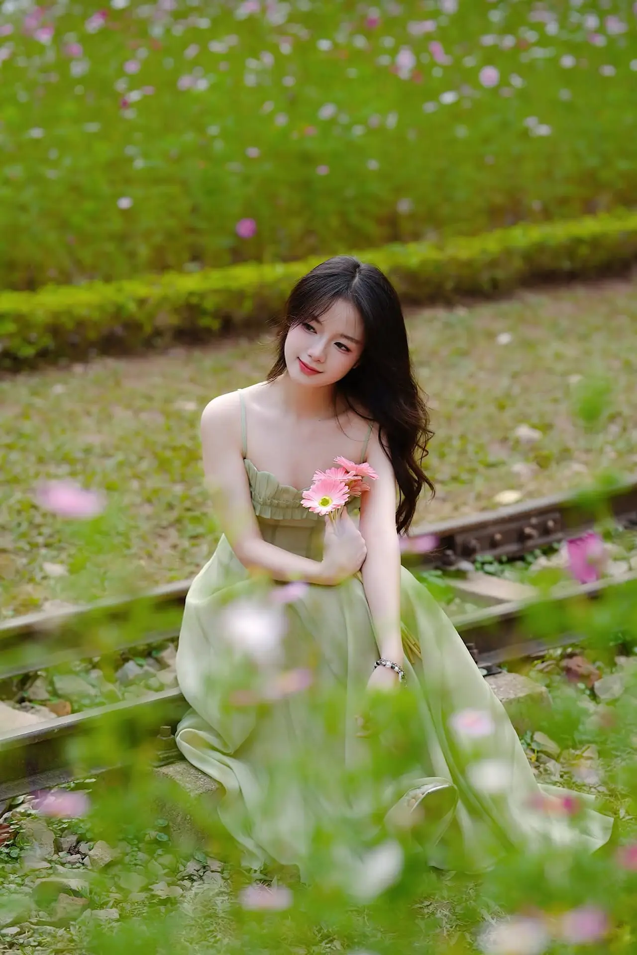 This captivating image features a beautiful young woman exuding gentle charm with her flowing long hair and captivating gaze. She is dressed in an elegant light green dress, highlighting her slender figure. In her hands, she delicately holds a fresh pink flower, adding a sweet touch. The backdrop is an old train track, evoking a sense of nostalgia, surrounded by lush ancient trees and bathed in natural sunlight. The photograph radiates pure beauty, a wonderful harmony between humanity and nature. It captures a serene, poetic moment, offering viewers a sense of relaxation and tranquility.#GentleBeauty #NaturalElegance #OutdoorPortrait #TrainTracks #NaturePhotography