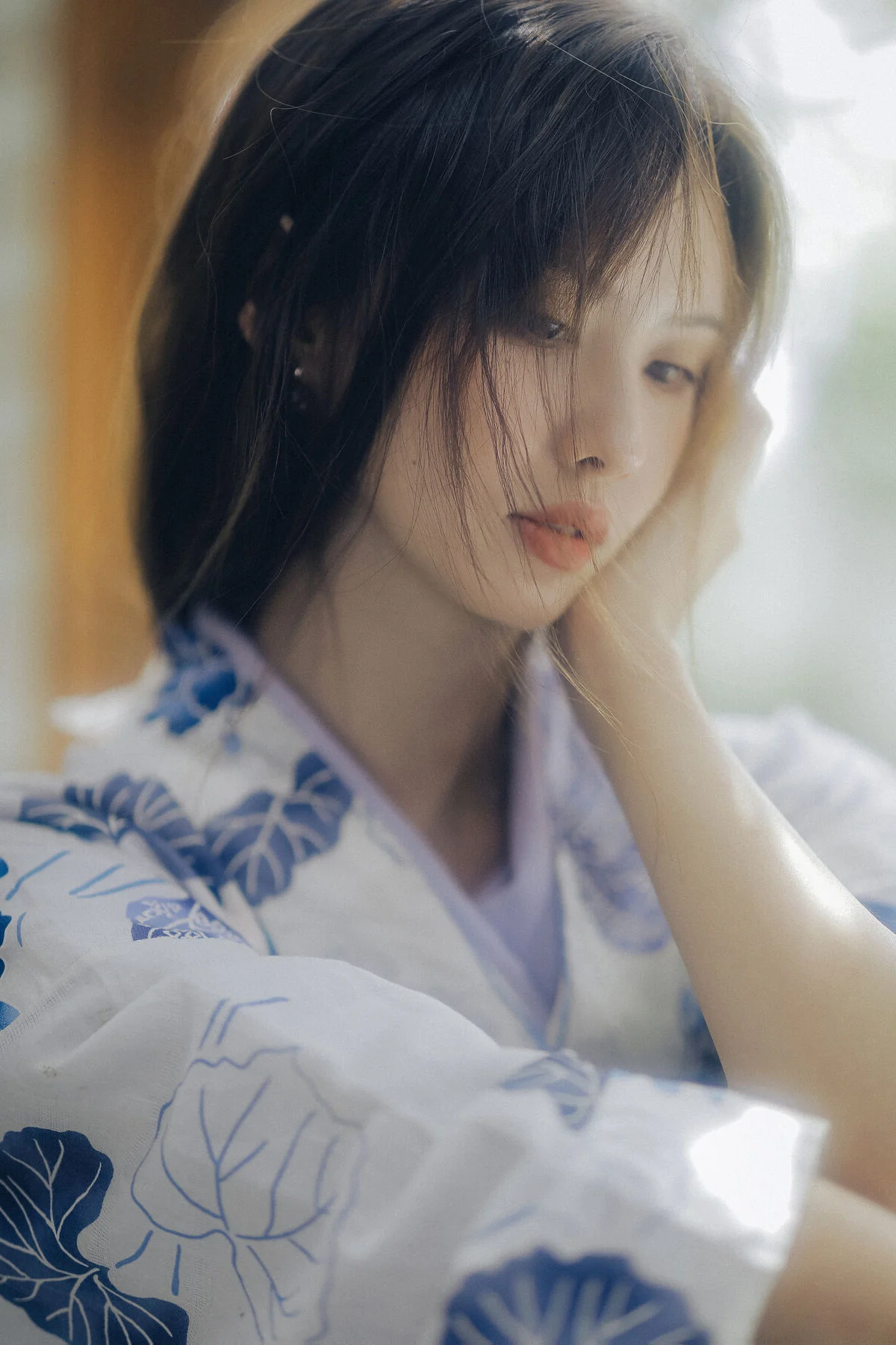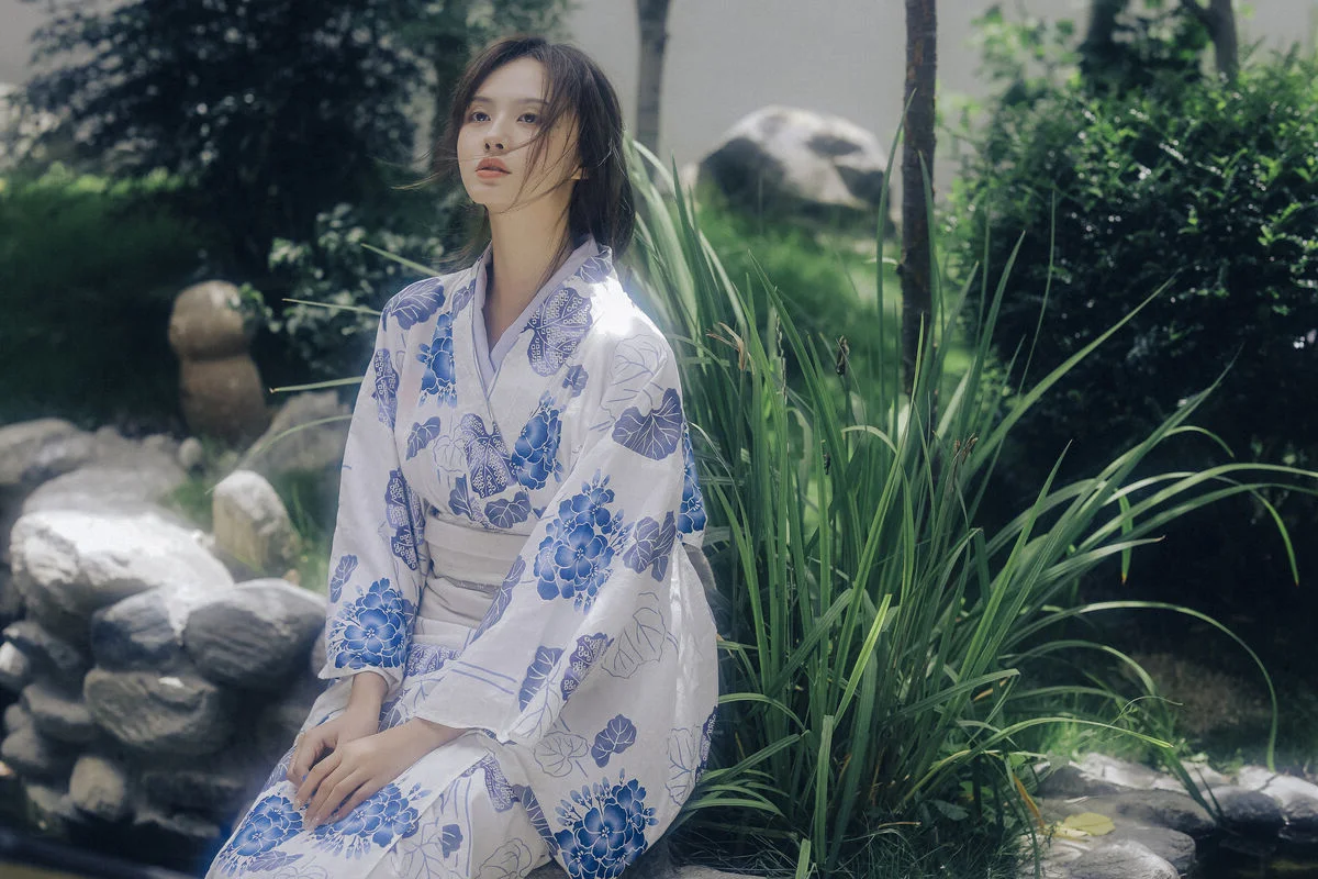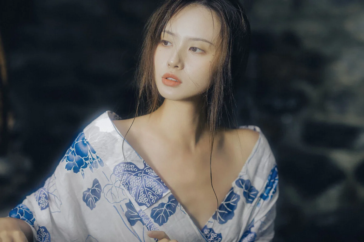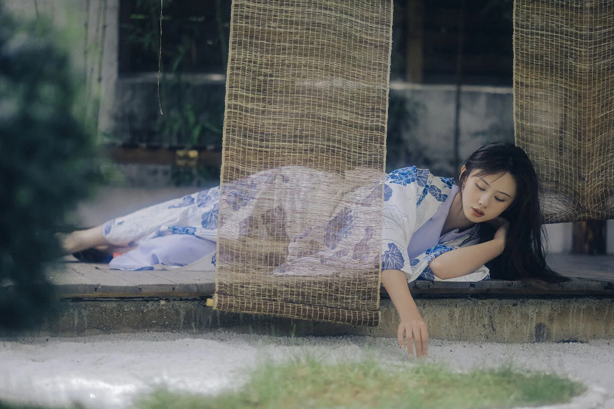 Amidst the quietude of a summer afternoon, Xiao Wu emerges like a muse from a classic cinematic frame. Dressed in a delicate Yukata featuring elegant blue floral patterns on a crisp white fabric, she embodies a beauty that is both fragile and profound. Her distant gaze and porcelain skin, reflected under the misty waters, create a scene rich in artistic depth and emotion. Every gentle gesture, from a soft touch on her shoulder to a lingering look through the bamboo blinds, evokes a sense of peace and nostalgia. This collection is more than just a photoshoot; it is a sophisticated visual language where traditional textures blend seamlessly with the breath of nature. The neutral tones and soft natural lighting perfectly highlight her ethereal aura, inviting the viewer to get lost in the rustling wind and the memories of vibrant summers past. It is a masterful display of visual storytelling and fashion aesthetics.