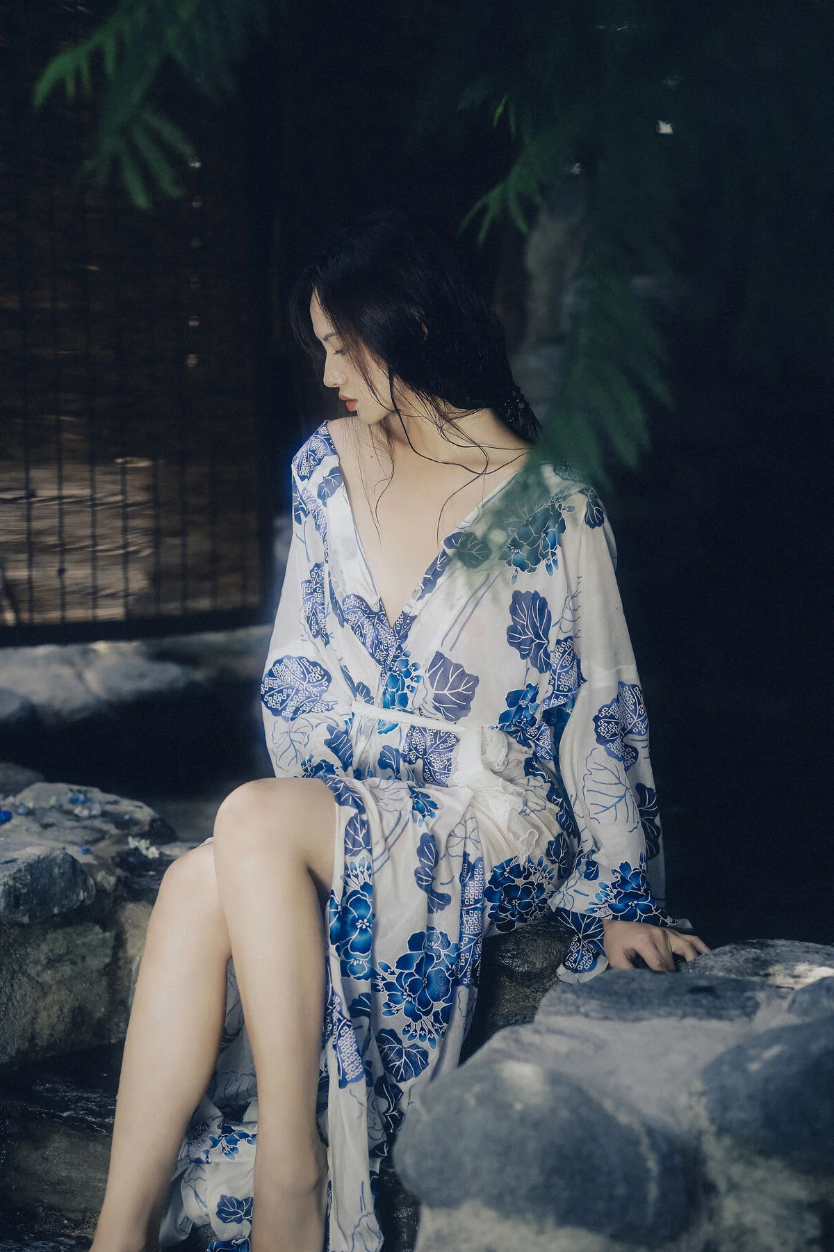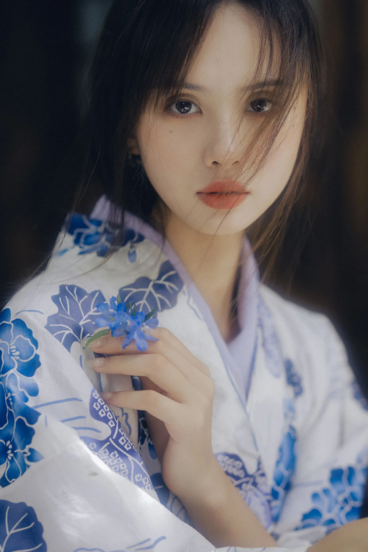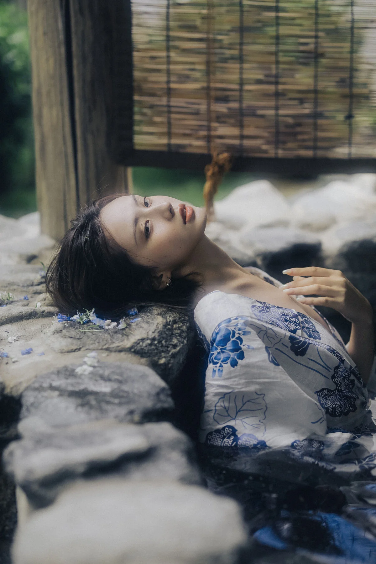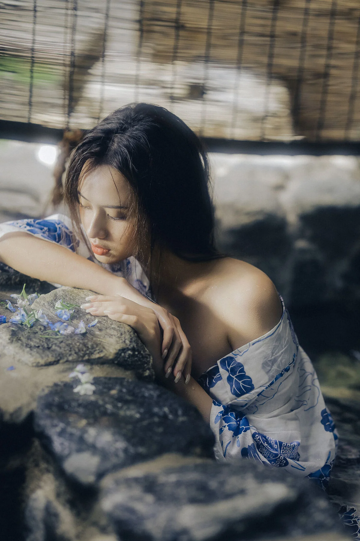 Amidst the quietude of a summer afternoon, Xiao Wu emerges like a muse from a classic cinematic frame. Dressed in a delicate Yukata featuring elegant blue floral patterns on a crisp white fabric, she embodies a beauty that is both fragile and profound. Her distant gaze and porcelain skin, reflected under the misty waters, create a scene rich in artistic depth and emotion. Every gentle gesture, from a soft touch on her shoulder to a lingering look through the bamboo blinds, evokes a sense of peace and nostalgia. This collection is more than just a photoshoot; it is a sophisticated visual language where traditional textures blend seamlessly with the breath of nature. The neutral tones and soft natural lighting perfectly highlight her ethereal aura, inviting the viewer to get lost in the rustling wind and the memories of vibrant summers past. It is a masterful display of visual storytelling and fashion aesthetics.