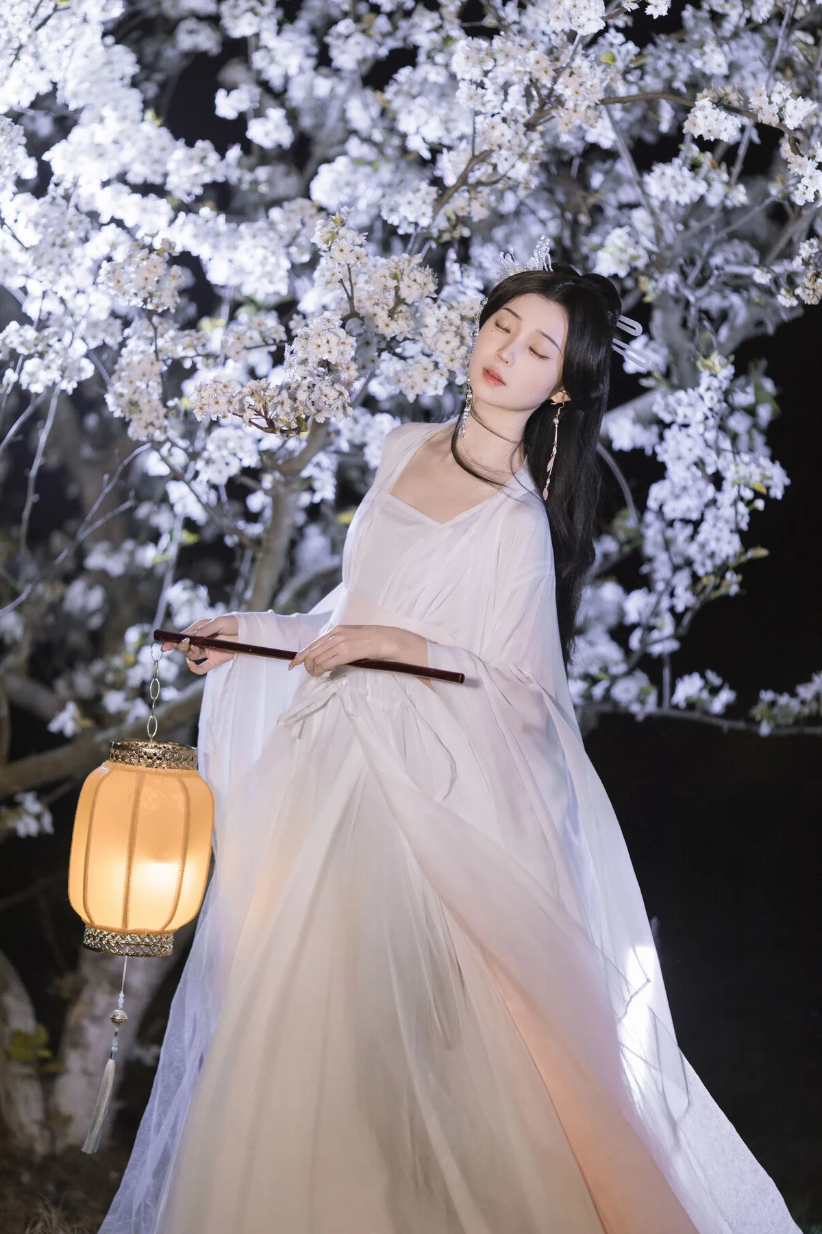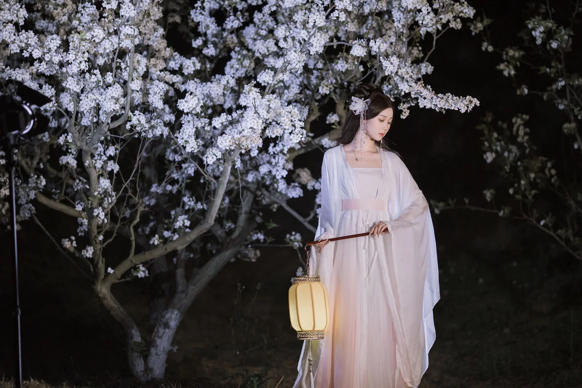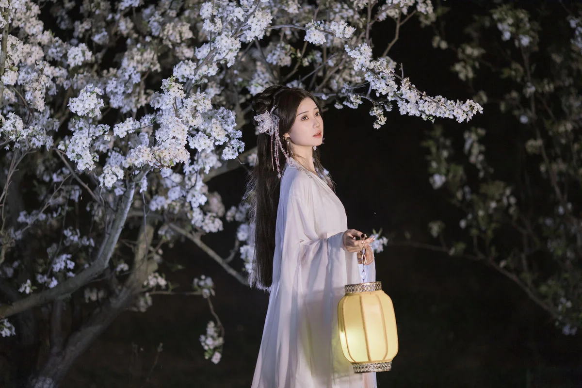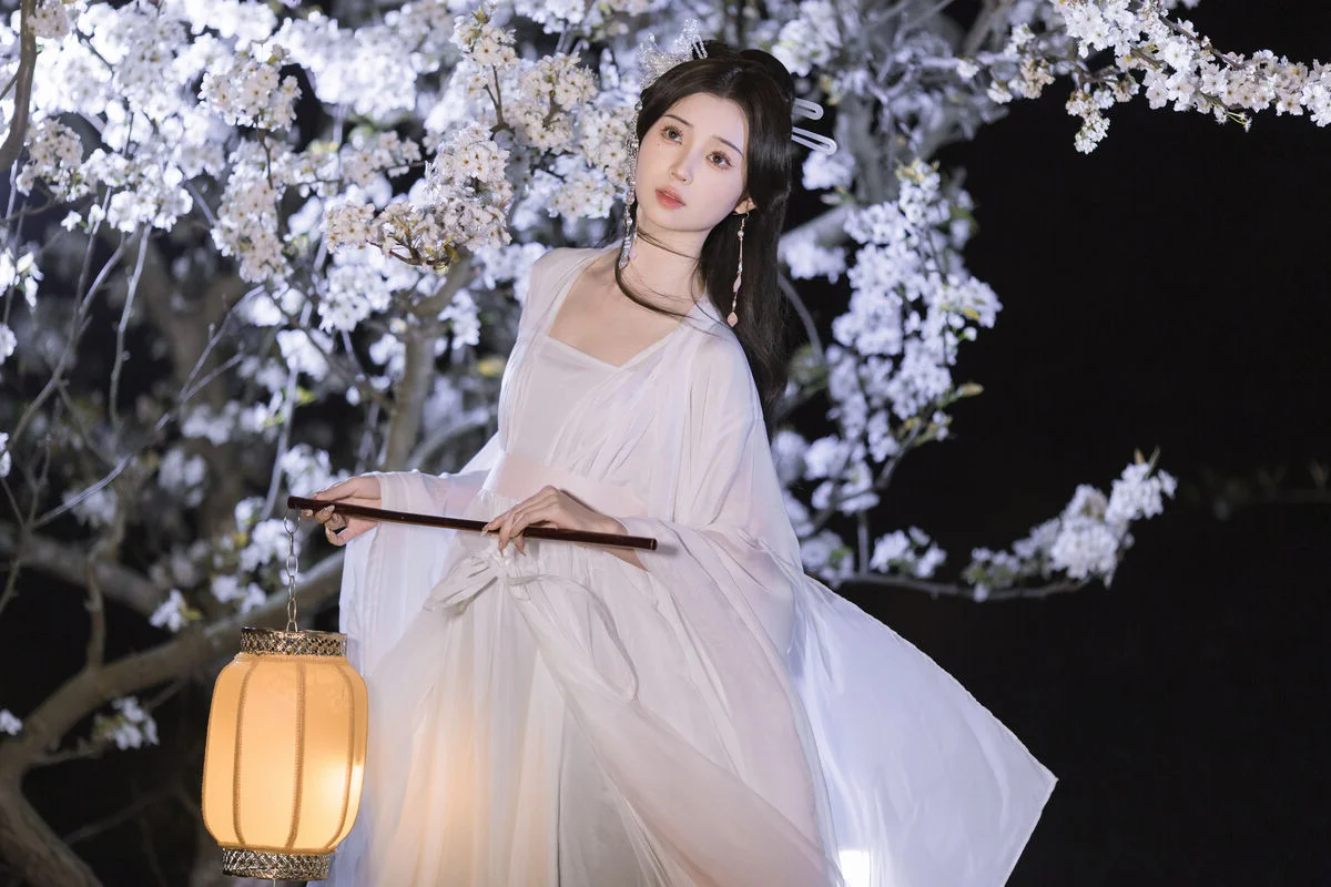 In this YiTuYu艺图语 Vol.8782 collection model Chu Yuan Yuan captivates as an ethereal muse amidst a mystical night scene. Dressed in a pristine white traditional Hanfu with flowing elegant lines she exudes a refined and graceful beauty. The soft glow from the ancient lantern and the abundant white cherry blossoms blooming in the dark create a romantic and poetic tableau. Holding a bamboo flute Chu Yuan Yuan appears lost in her own silent melody evoking a sense of peace and profound contemplation. This perfect harmony between human elegance and natural splendor forms an enchanting work of art inspiring nostalgia and admiration for traditional aesthetics.#ChuYuanYuan #Hanfu #CherryBlossomNight #ChineseArt #ClassicalBeauty #YiTuYu