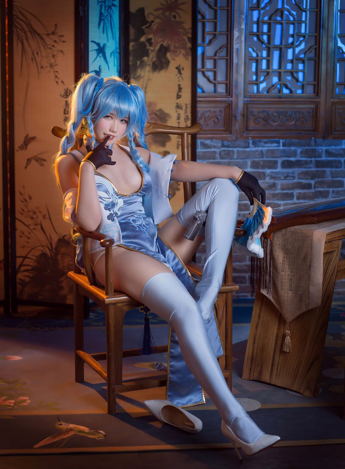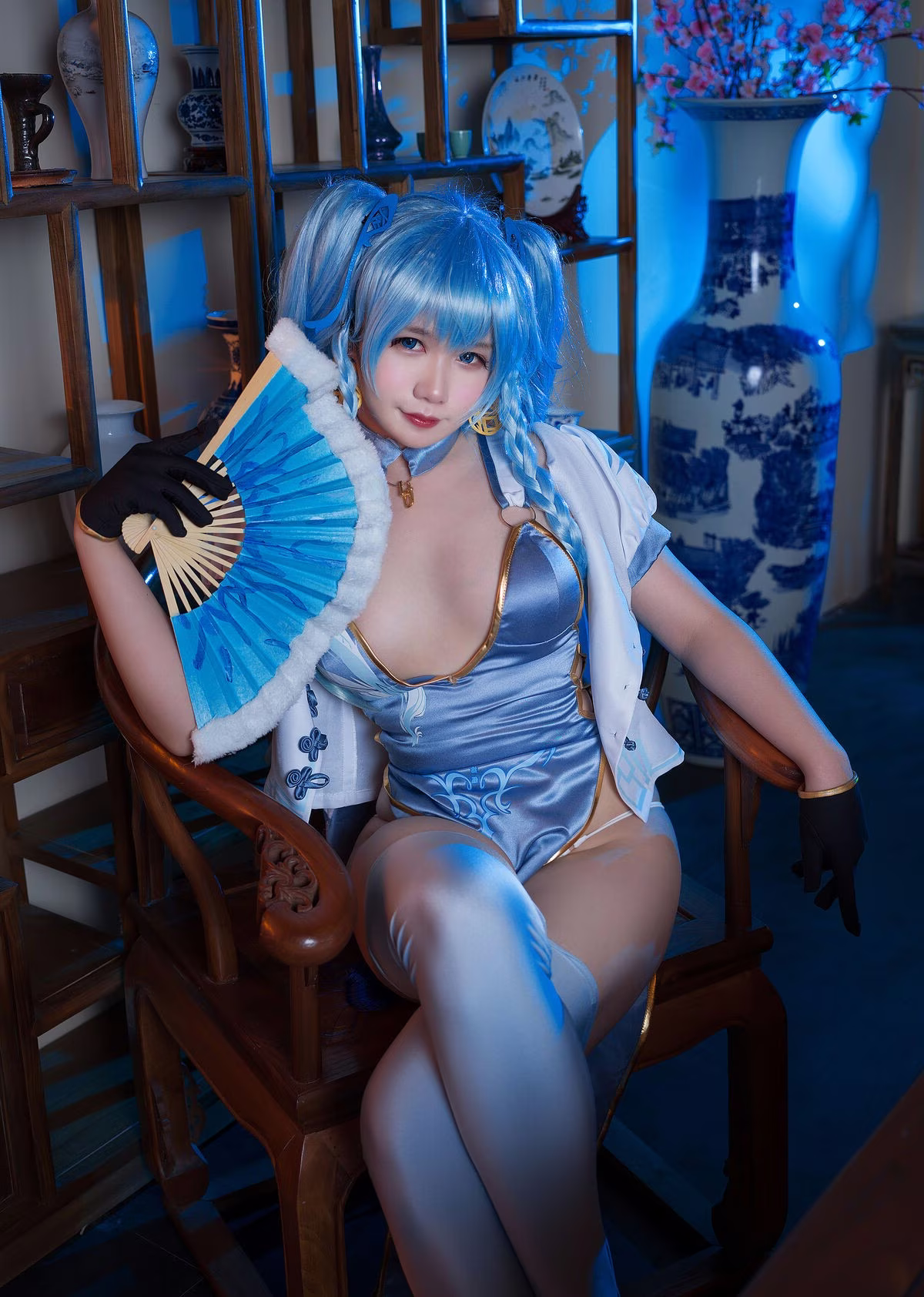 Immerse yourself in the captivating world of Girls' Frontline through the stunning portrayal by Coser 麻花麻花酱. This photoshoot showcases her alluring and refined beauty, donning a distinctive character costume in harmonious shades of blue and white. Every detail of the cosplay is meticulously crafted, from her flowing blue hair to the seductive long white stockings, creating an utterly enchanting look. Coser 麻花麻花酱's expressive gaze, combined with her elegant pose on a traditional wooden chair and the classic architectural backdrop, accentuates the character's grace and charm. This collection is more than just a vibrant recreation; it's an artistic masterpiece that evokes emotion and admiration from viewers.